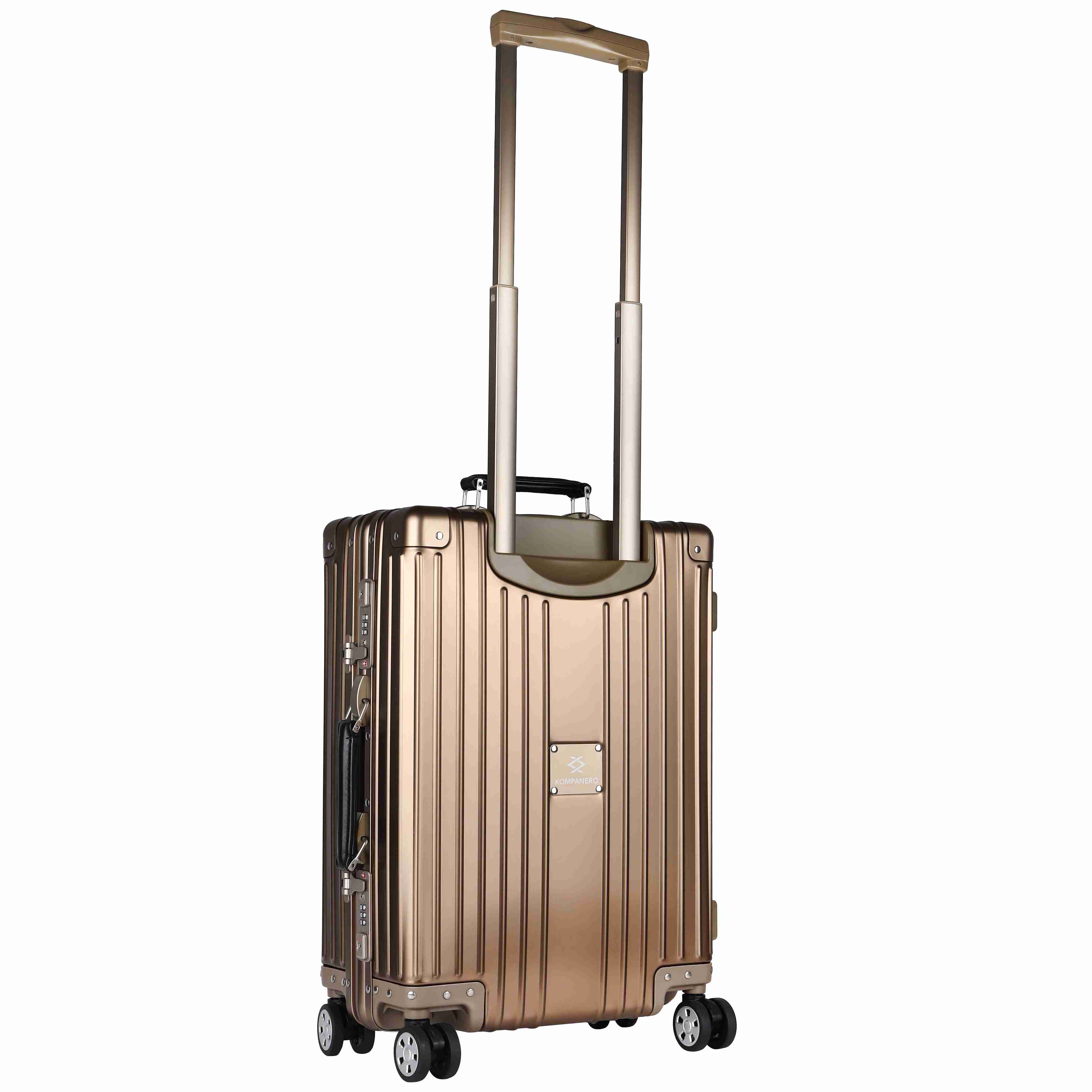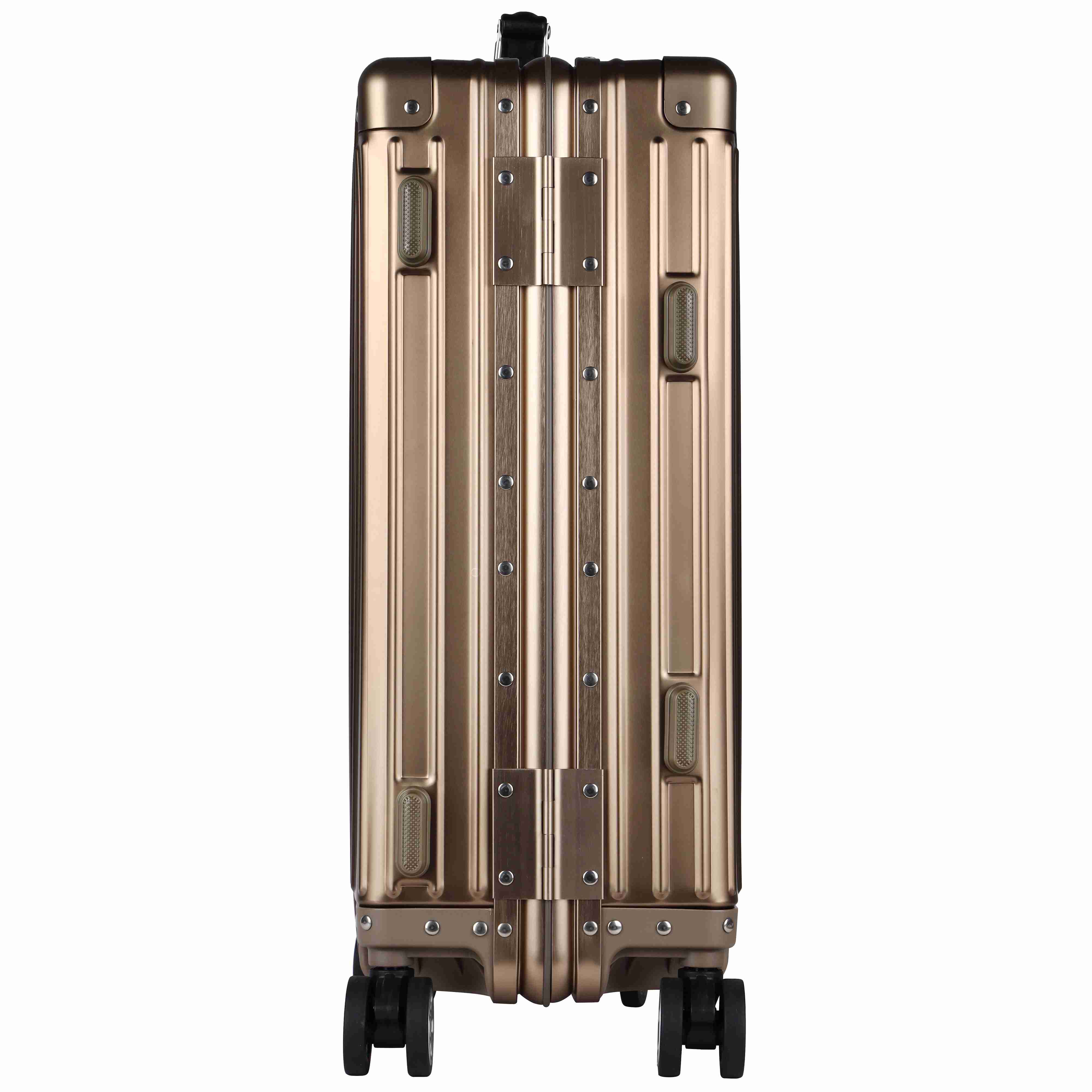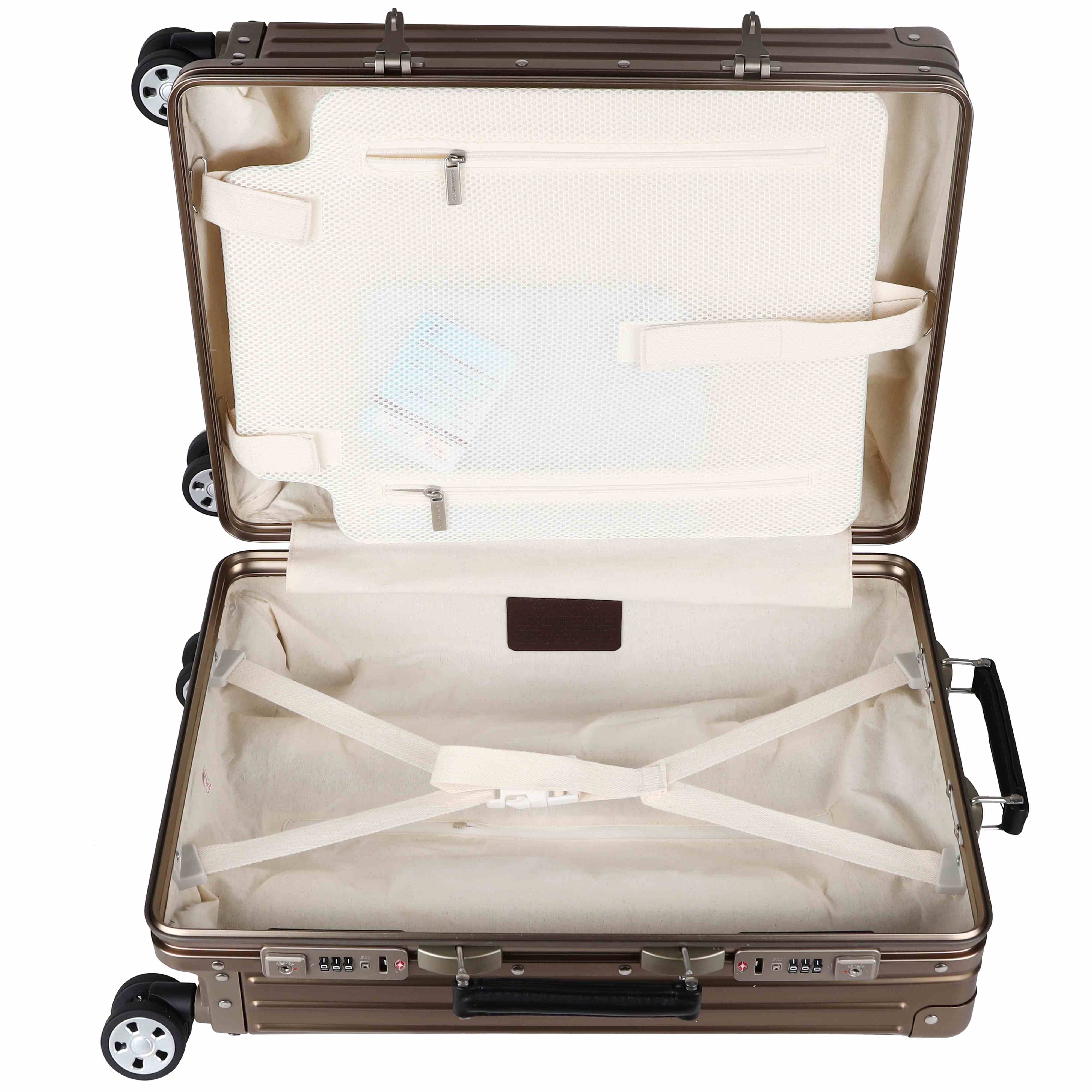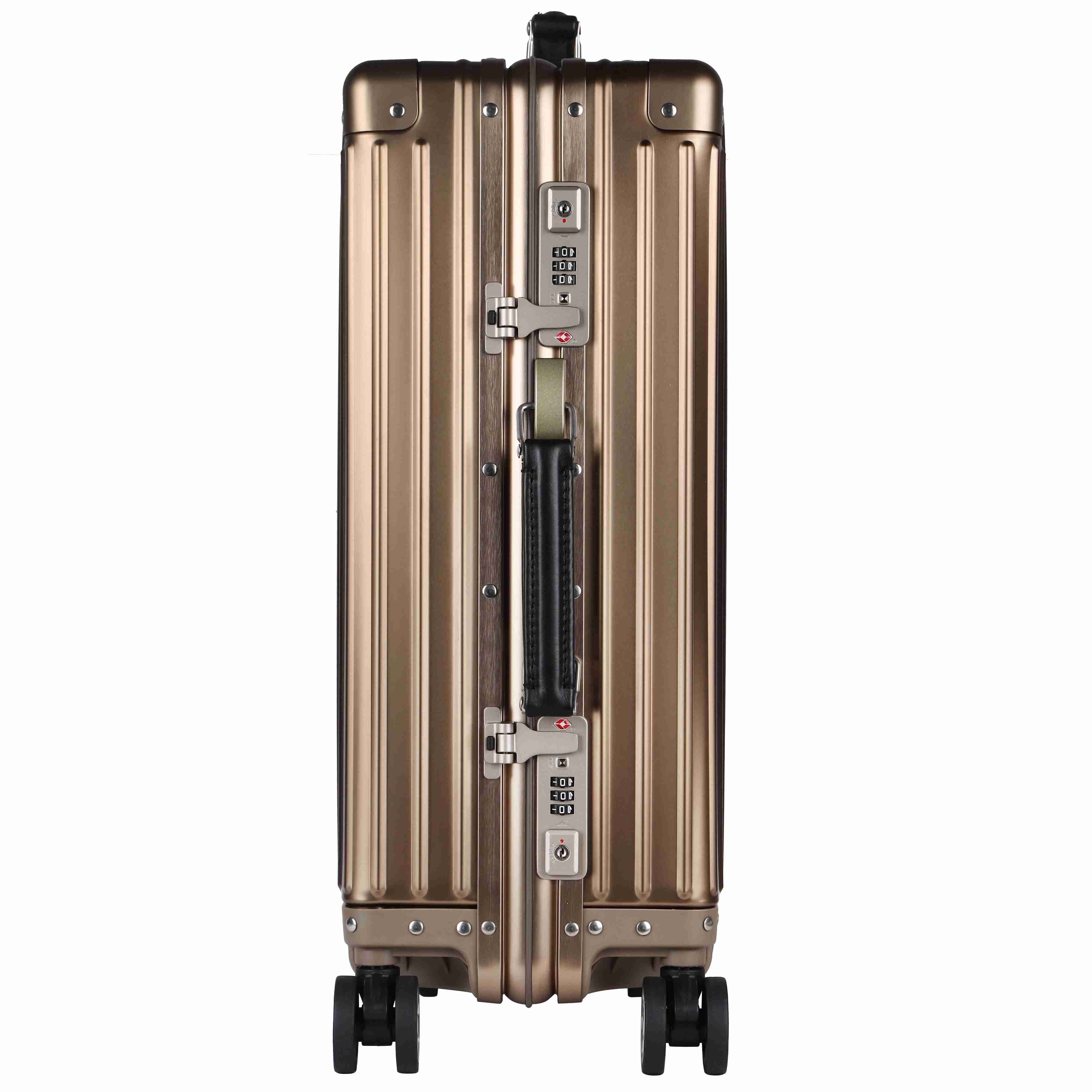 Albion -The Trolley suitcase with branding on the front. One handle on the top and on the side, a trolley with a retractable handle, and rotatable corner-mounted inline skate wheels. Two compartments inside, secured with two number locks. Aluminium Body Numeric Lock Closure 4 Compact Wheels