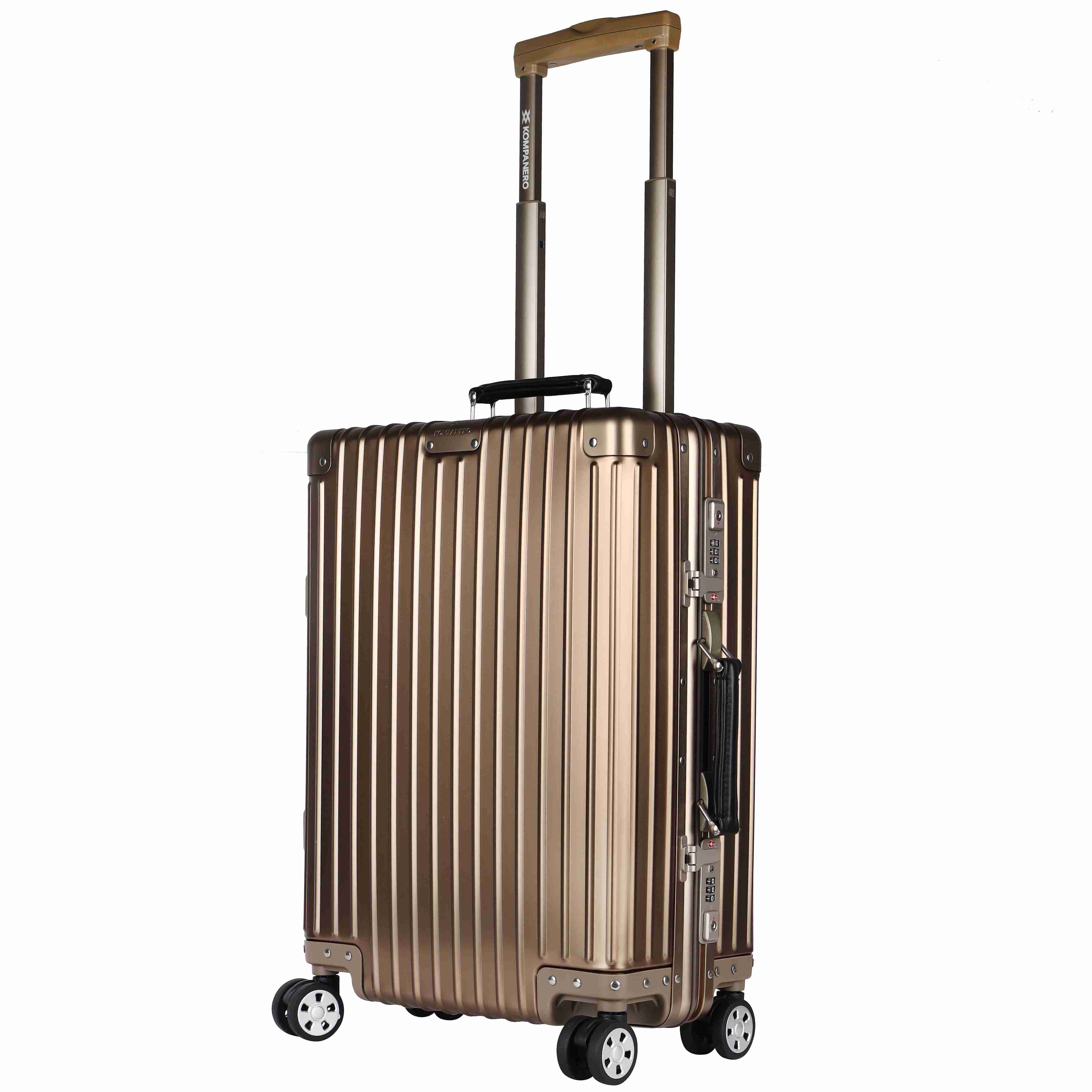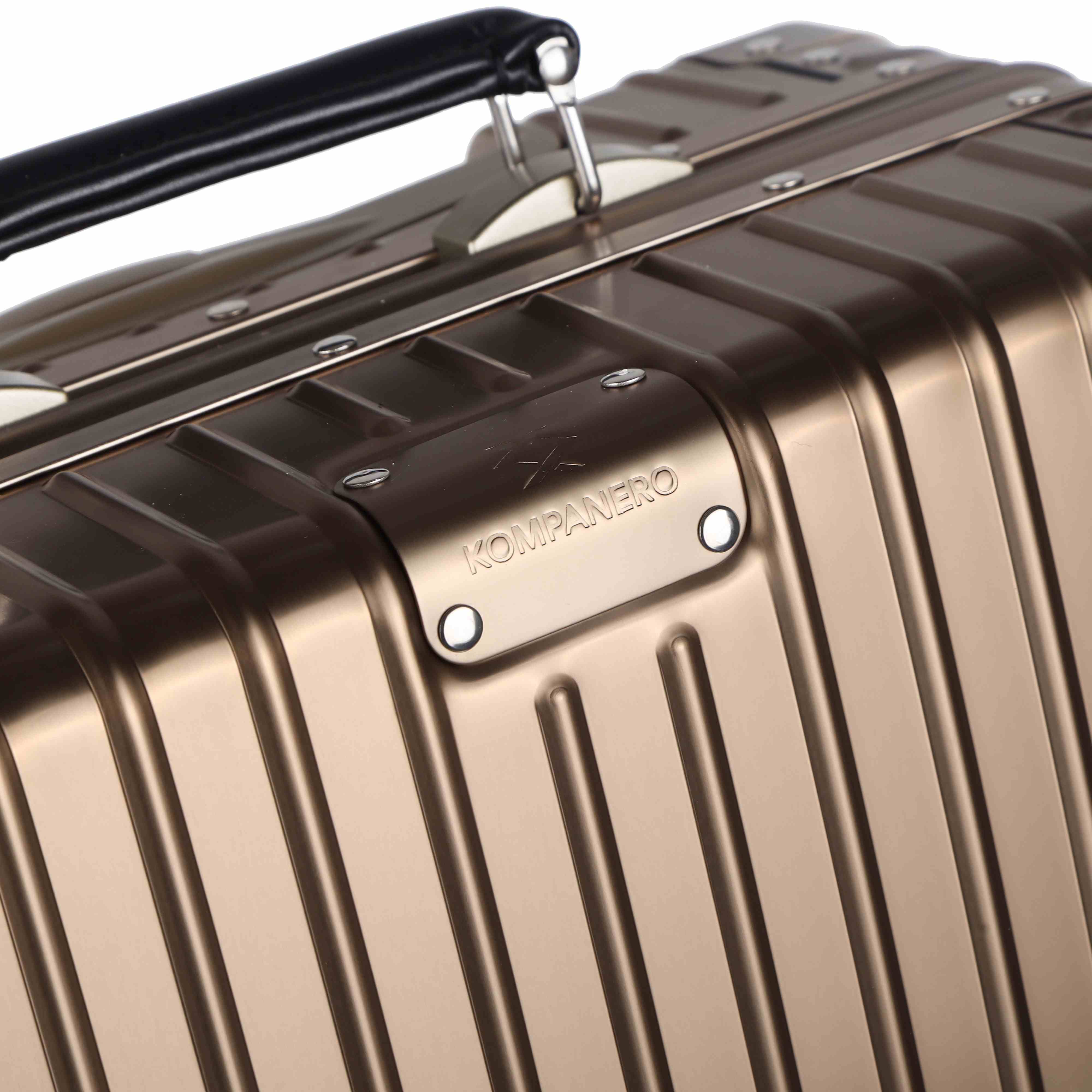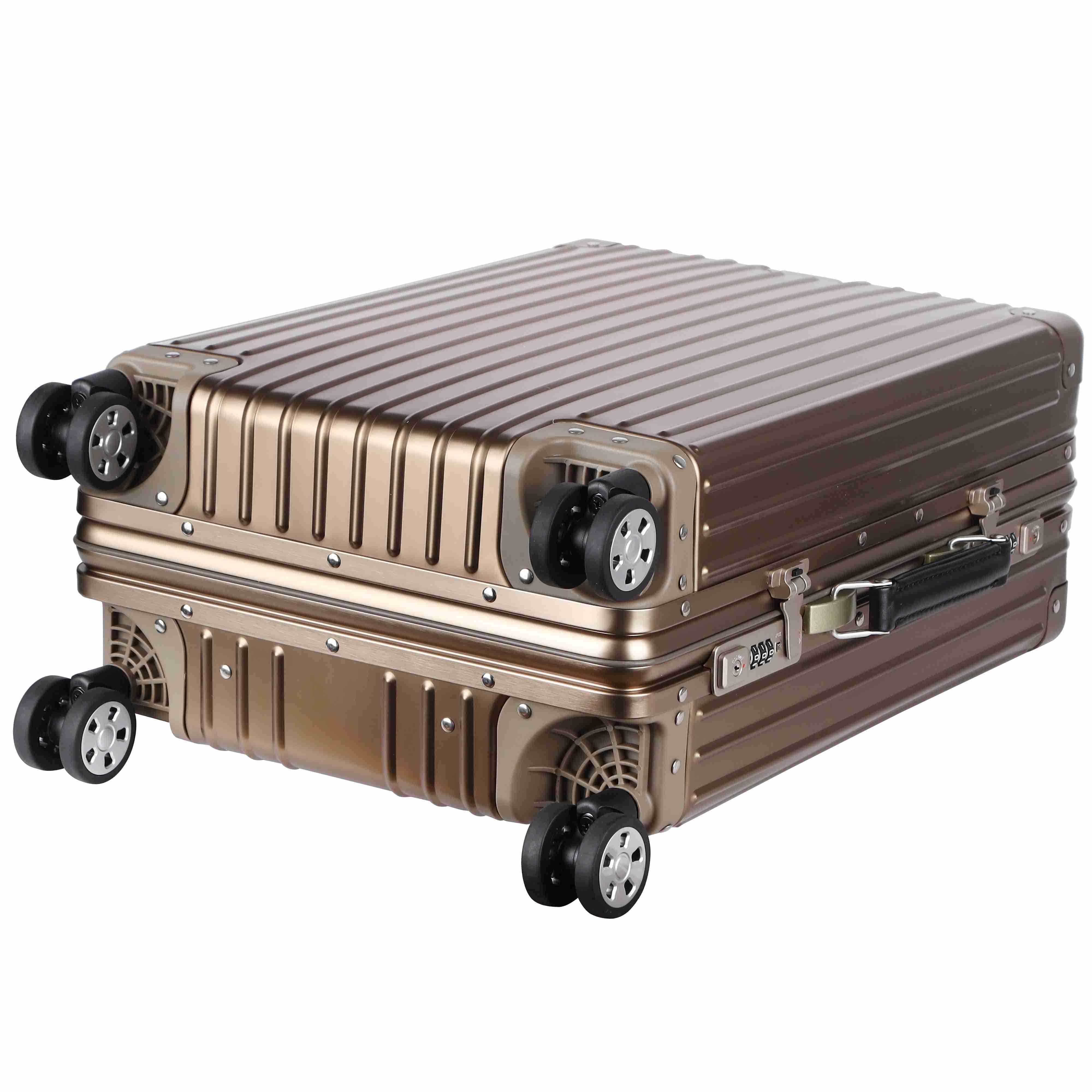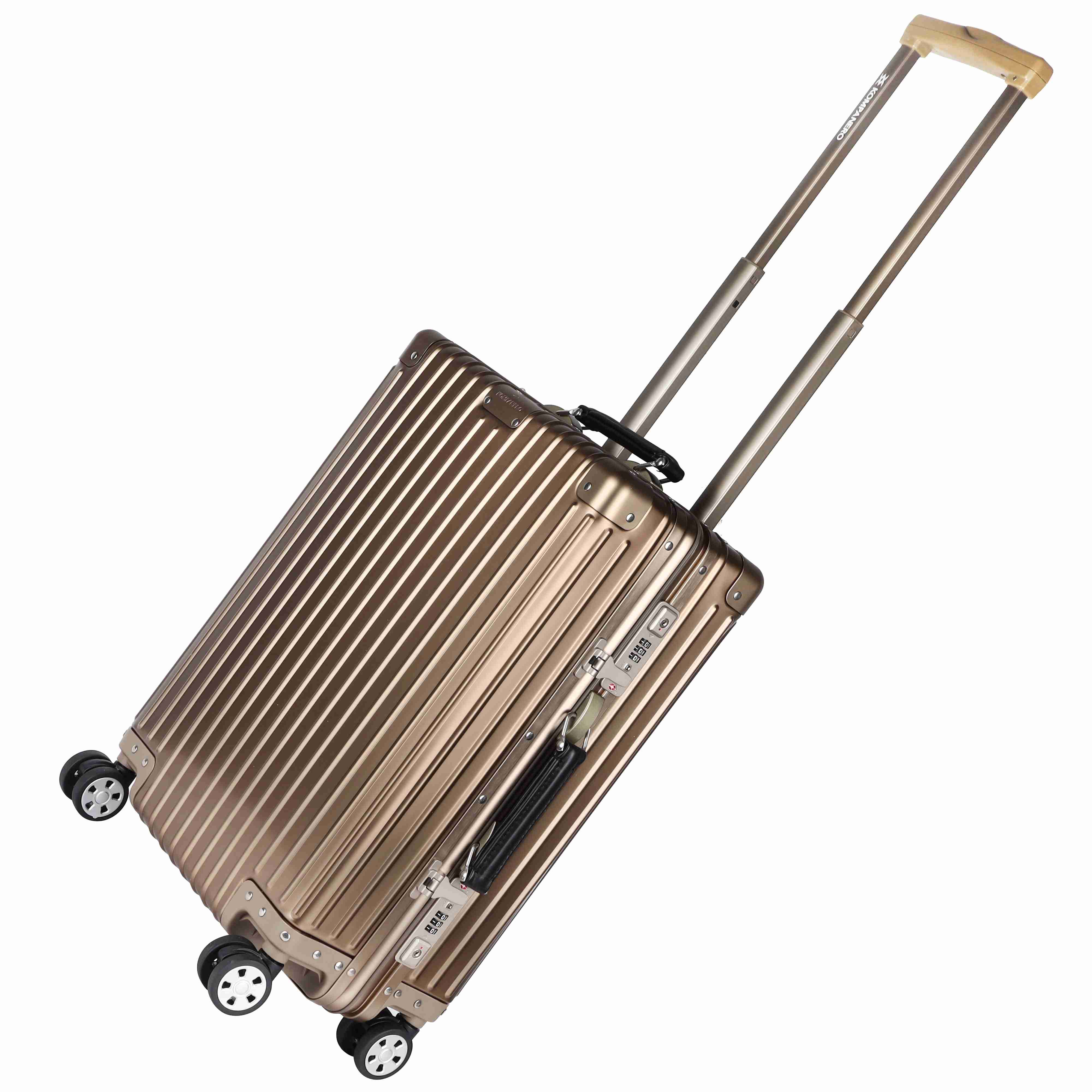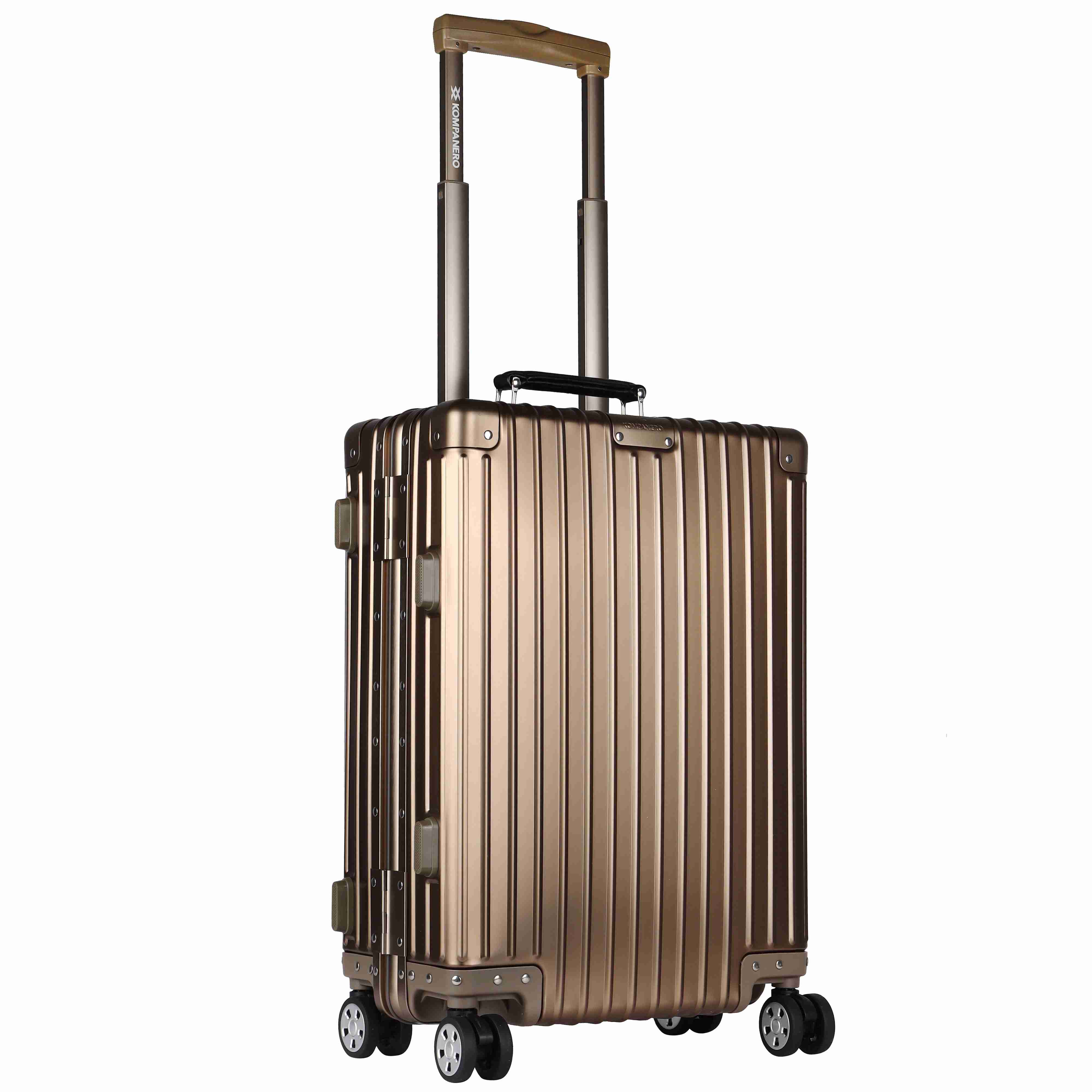 Albion -The Trolley suitcase with branding on the front. One handle on the top and on the side, a trolley with a retractable handle, and rotatable corner-mounted inline skate wheels. Two compartments inside, secured with two number locks. Aluminium Body Numeric Lock Closure 4 Compact Wheels