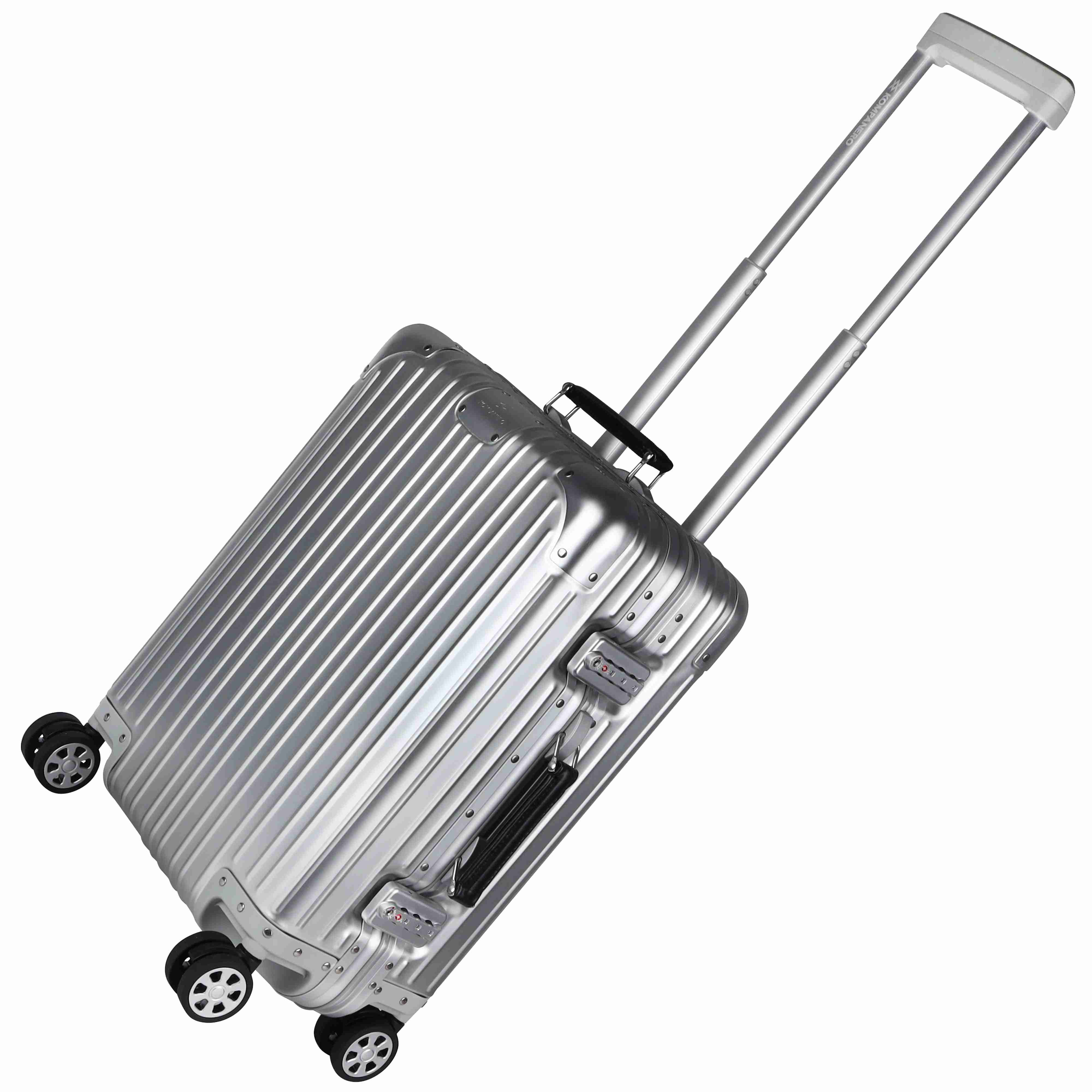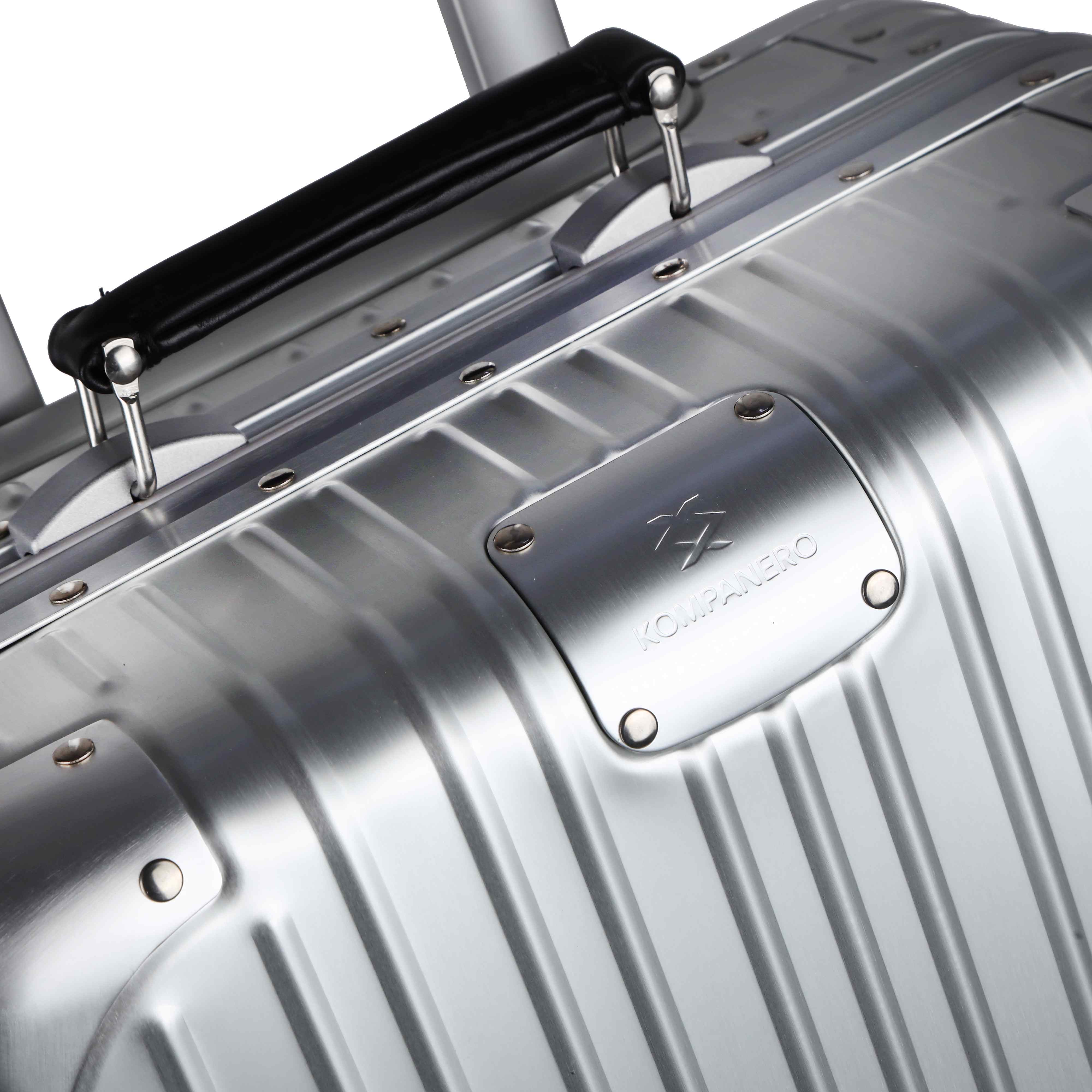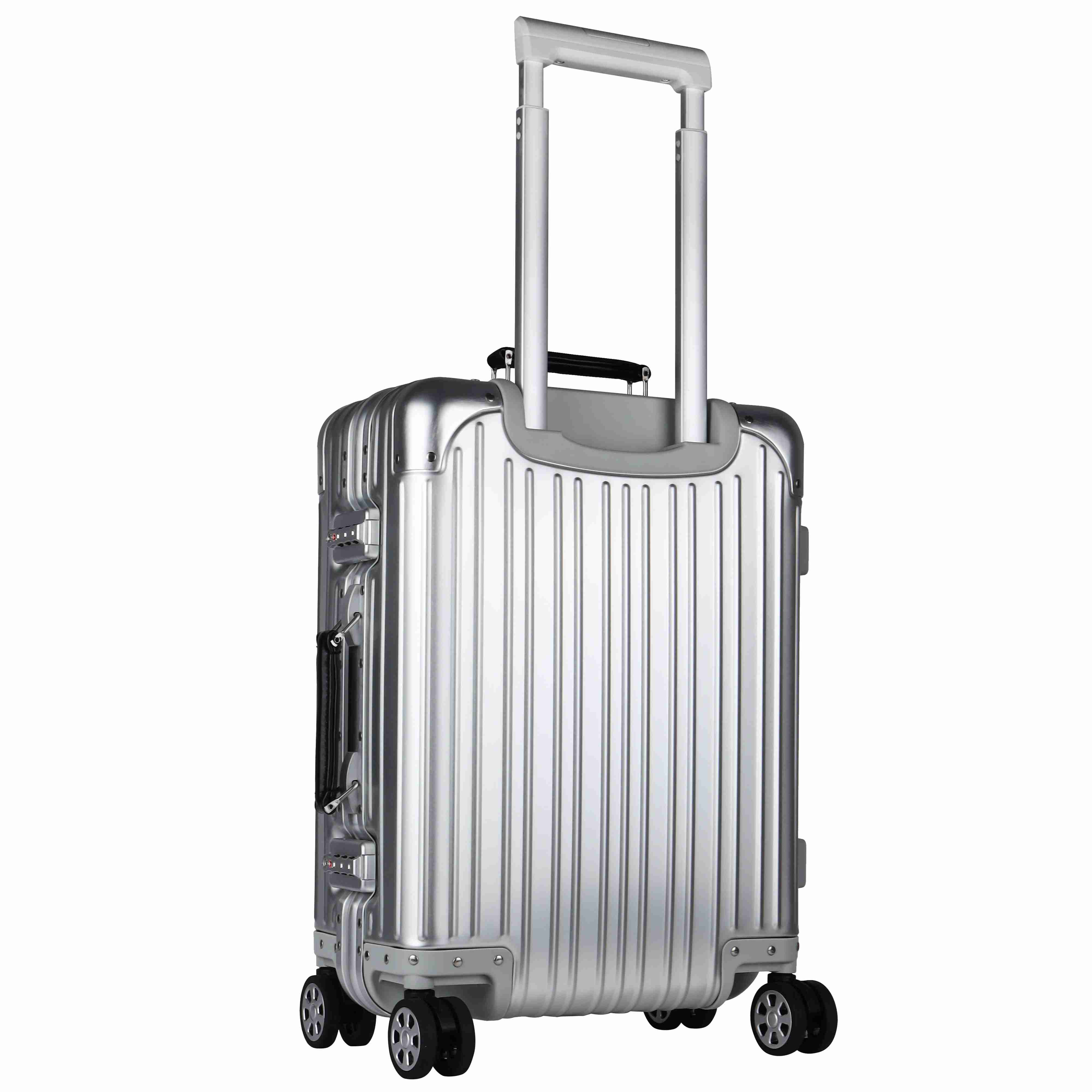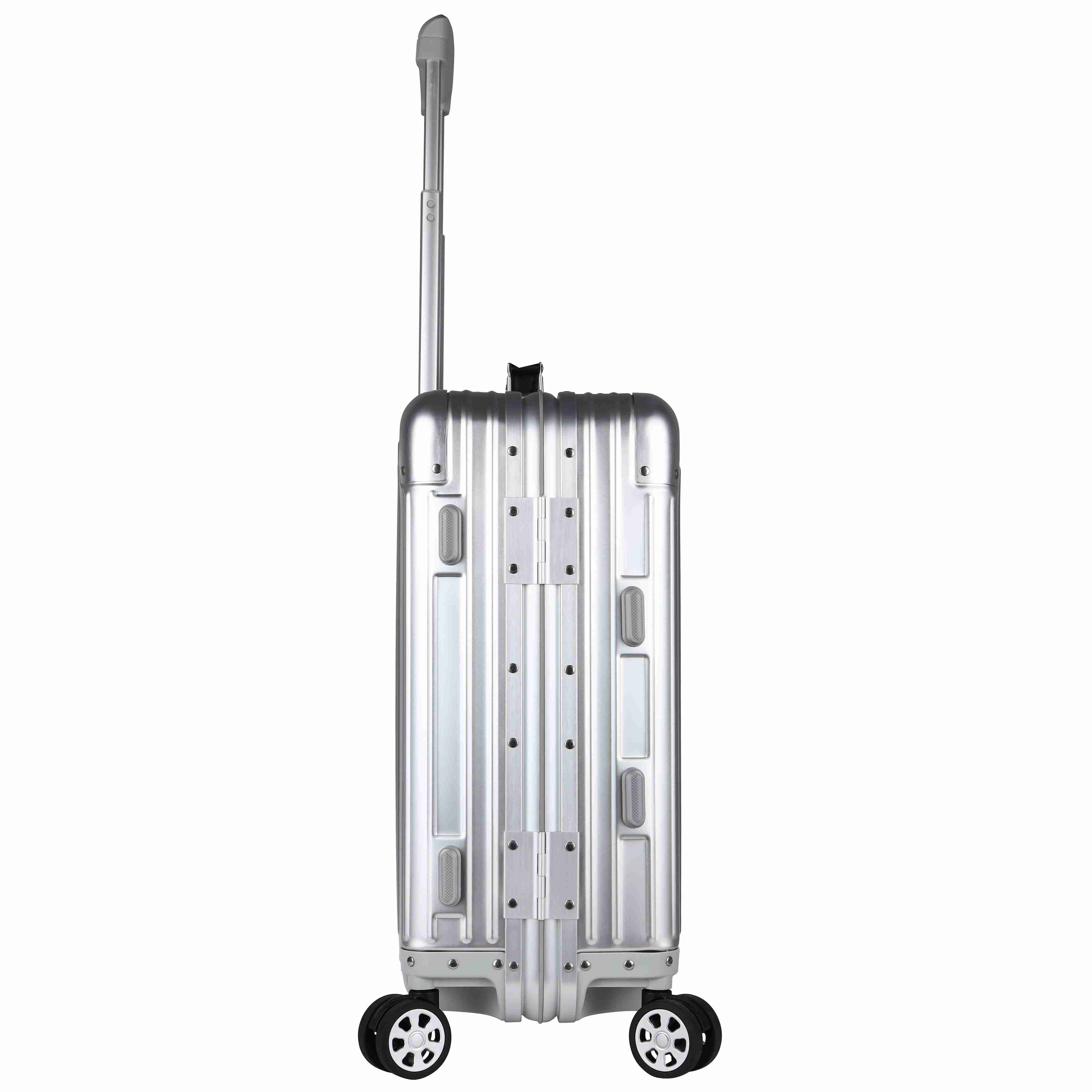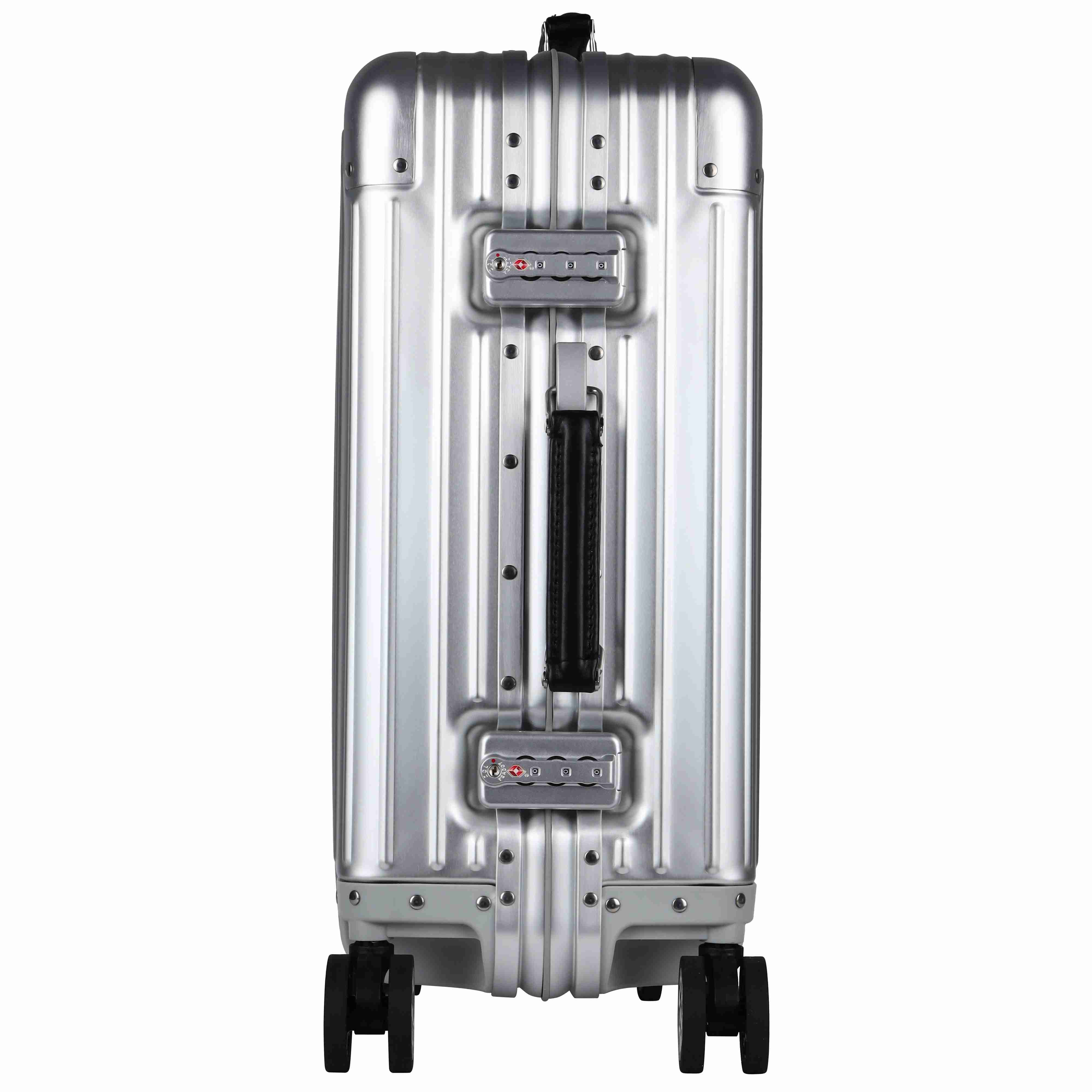 Alejo -The Trolley suitcase with branding on the front. One handle on the top and on the side, a trolley with a retractable handle, and rotatable corner-mounted inline skate wheels. Two compartments inside, secured with two number locks. Aluminium Body Numeric Lock Closure 4 Compact Wheels