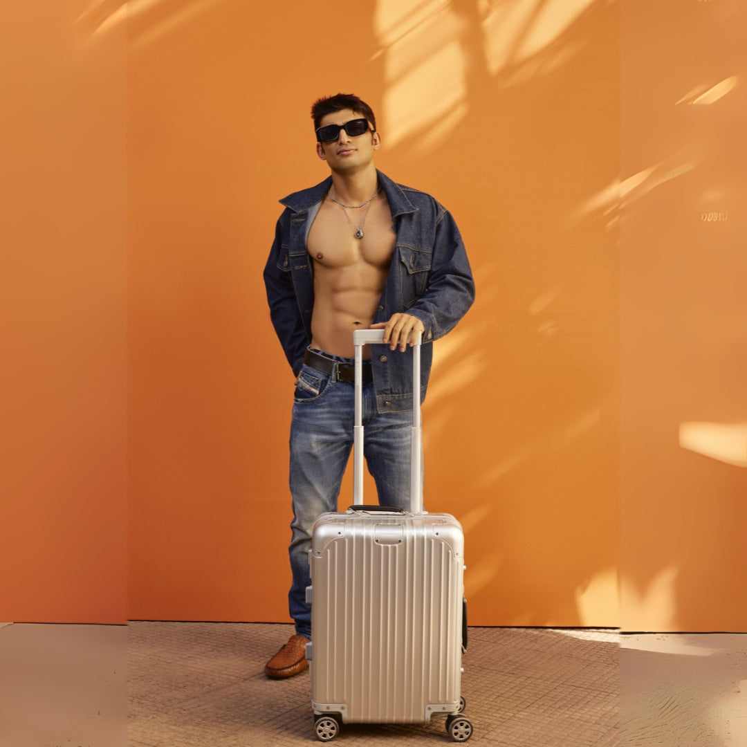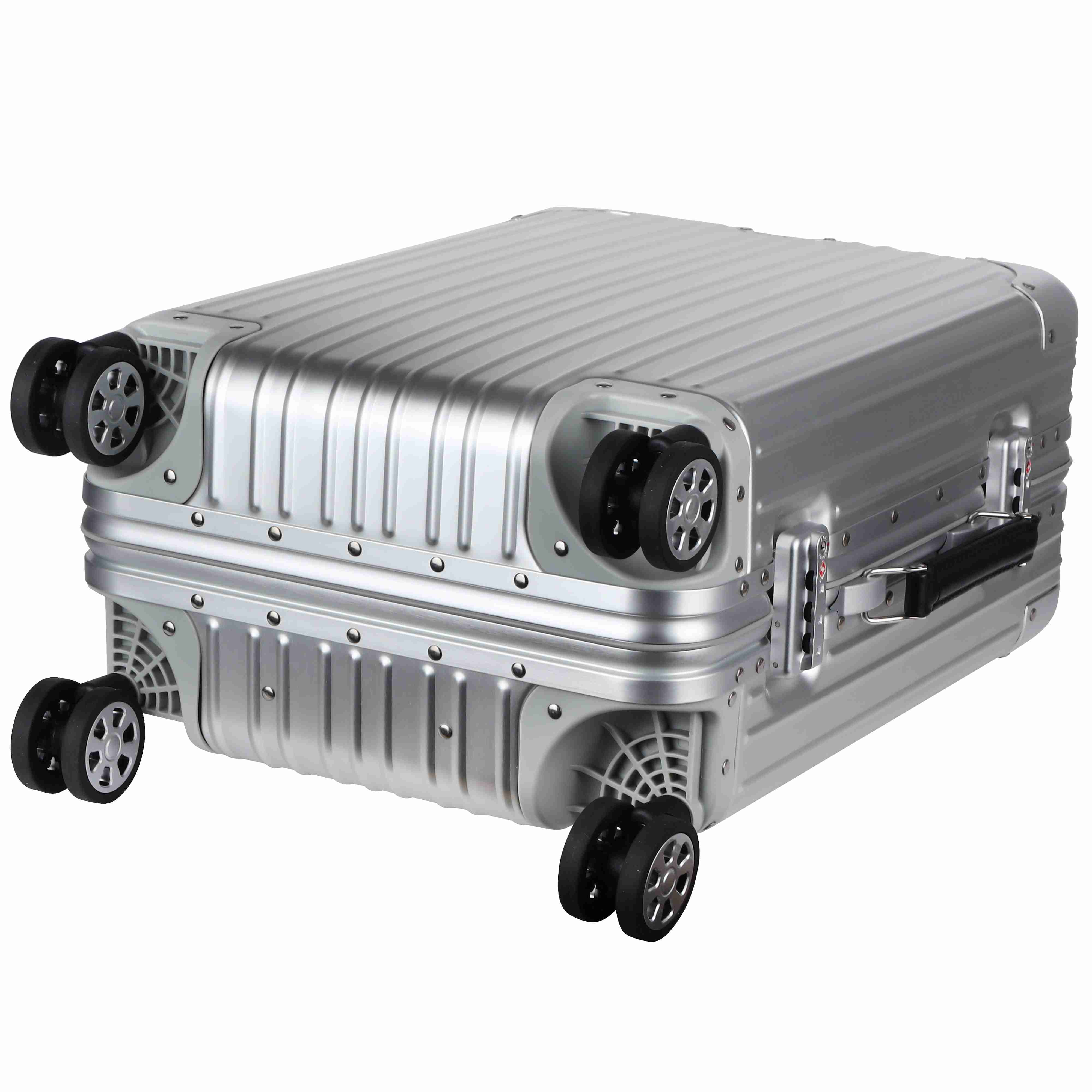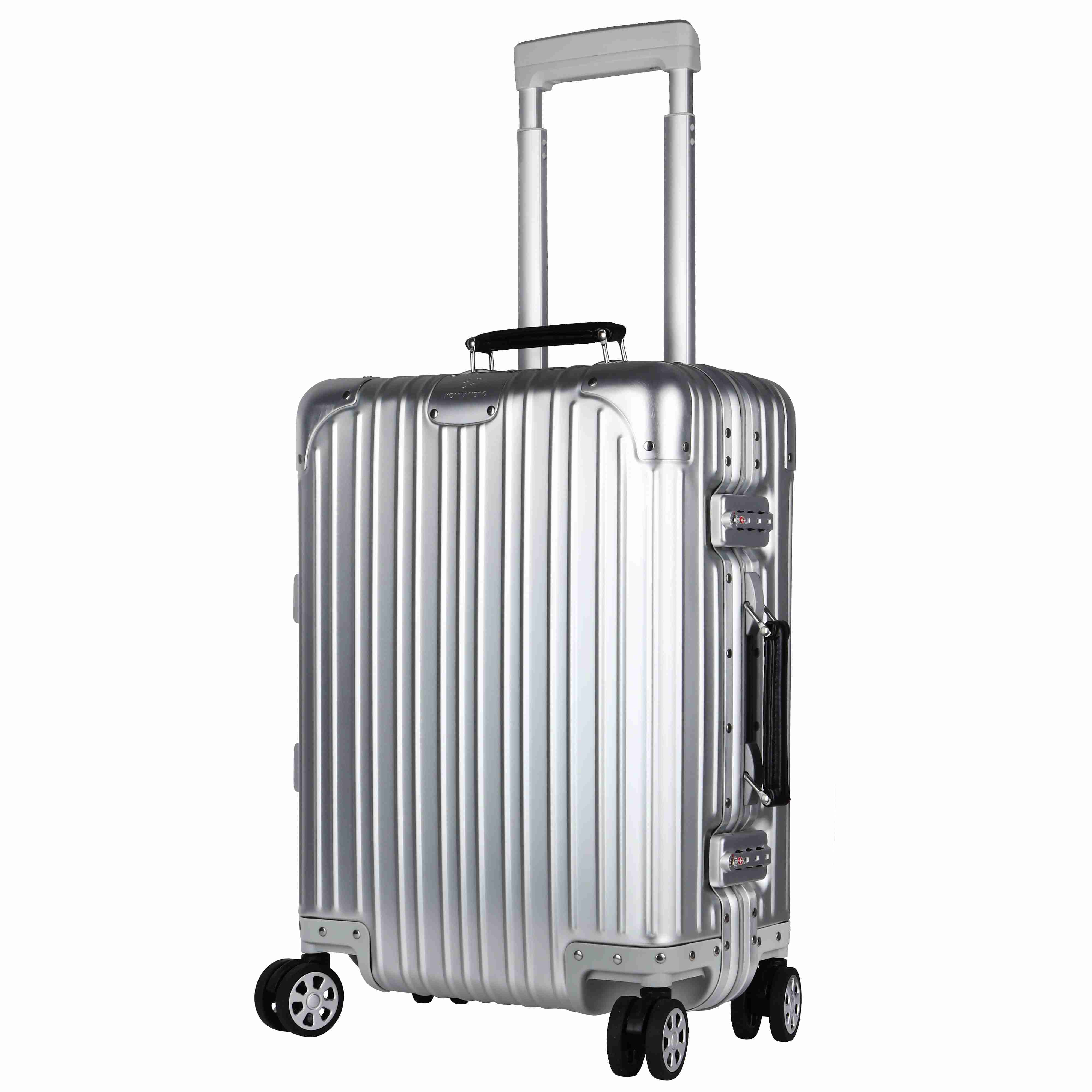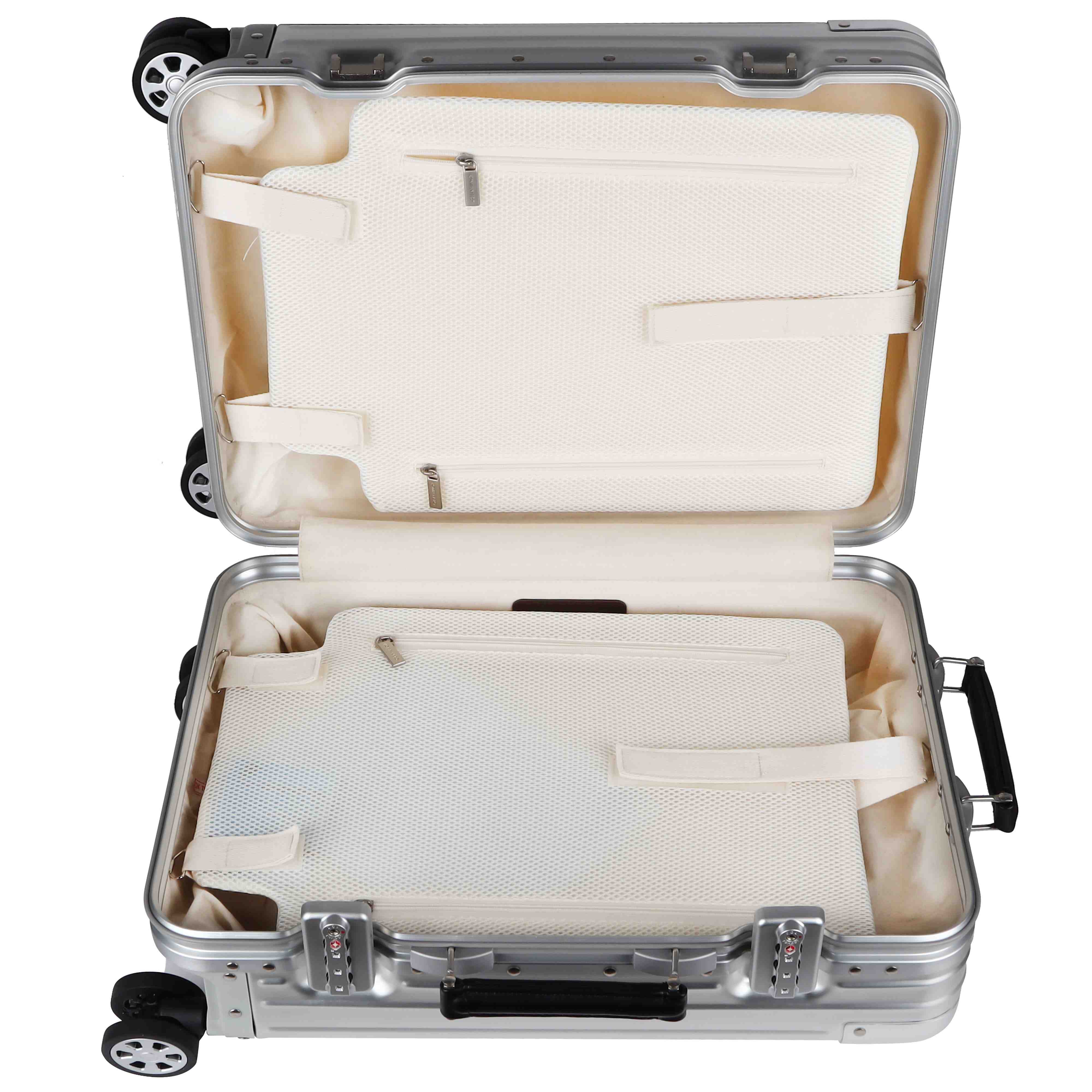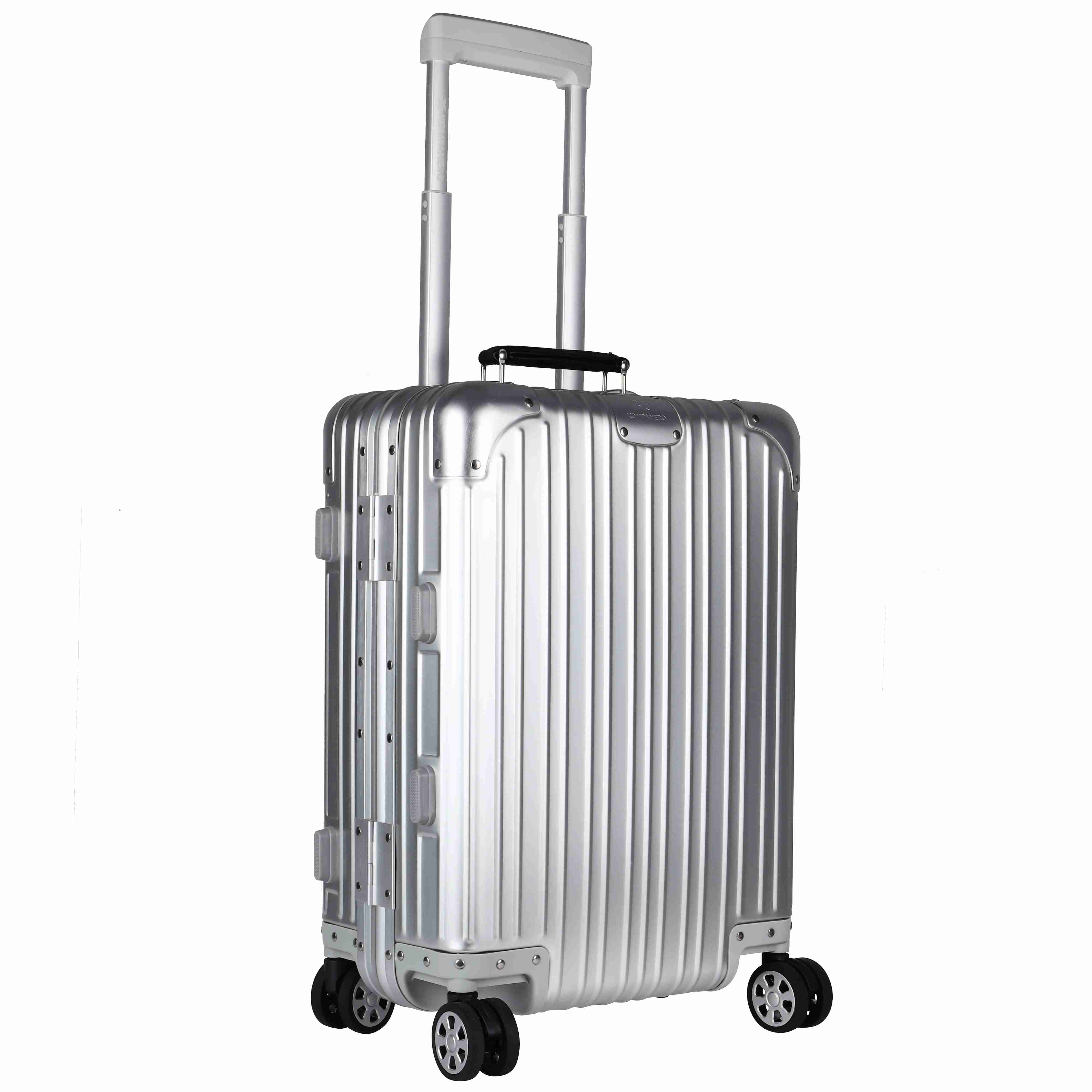 Alejo -The Trolley suitcase with branding on the front. One handle on the top and on the side, a trolley with a retractable handle, and rotatable corner-mounted inline skate wheels. Two compartments inside, secured with two number locks. Aluminium Body Numeric Lock Closure 4 Compact Wheels