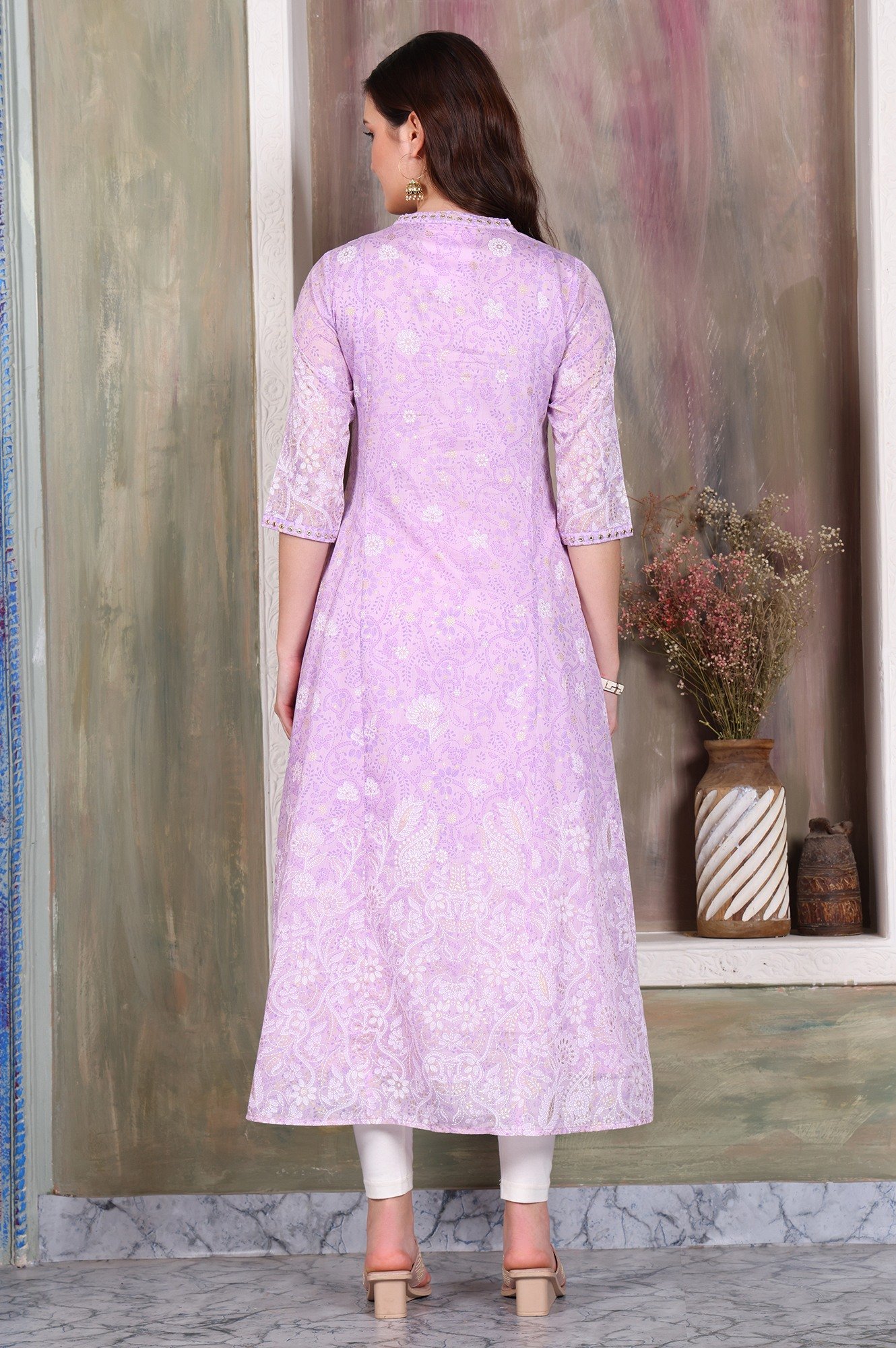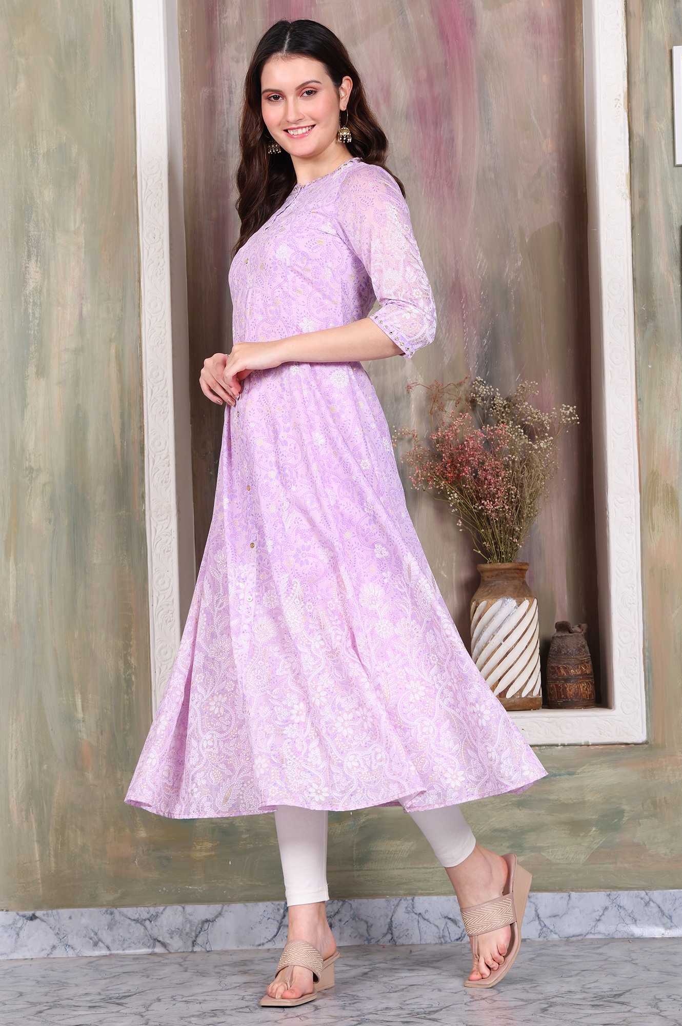 Immerse yourself in the charm of lavender fog with this exquisite Anarkali kurta and legging set by Aurelia. The kurta, crafted from pure cotton, showcases a delicate foil print and intricate zari embroidery, creating a harmonious blend of tradition and modernity. Its band collar and 3/4th regular sleeves lend a contemporary edge, while the straight hemline ensures a flattering fit. Paired with mid-rise viscose leggings, this ensemble is perfect for festive gatherings, casual outings, or cultural events. The breathable cotton fabric and woven texture promise comfort and durability, making it a sustainable choice for your wardrobe. Style it with statement earrings and strappy sandals to complete the look.