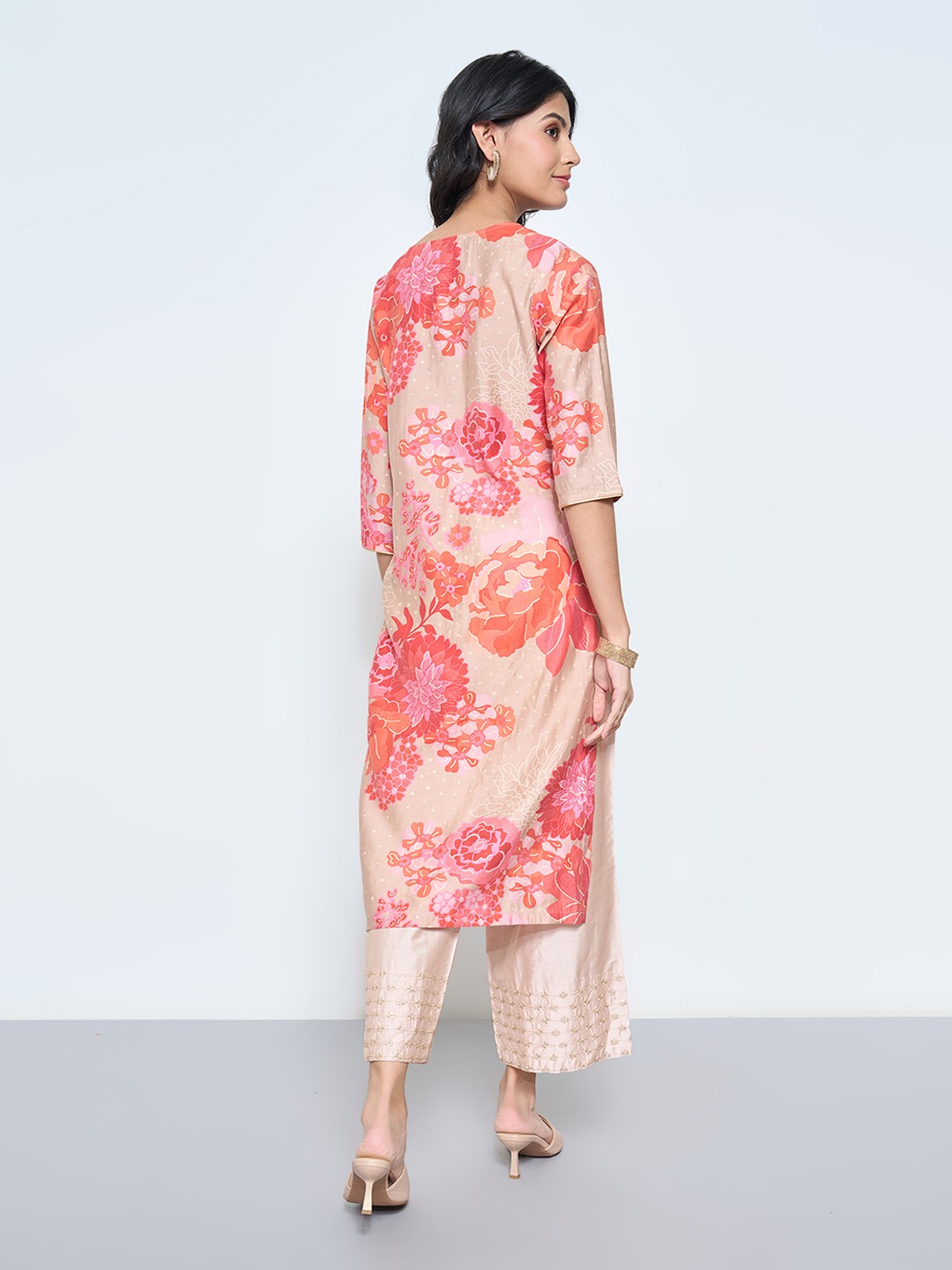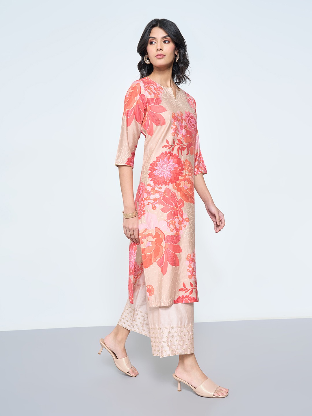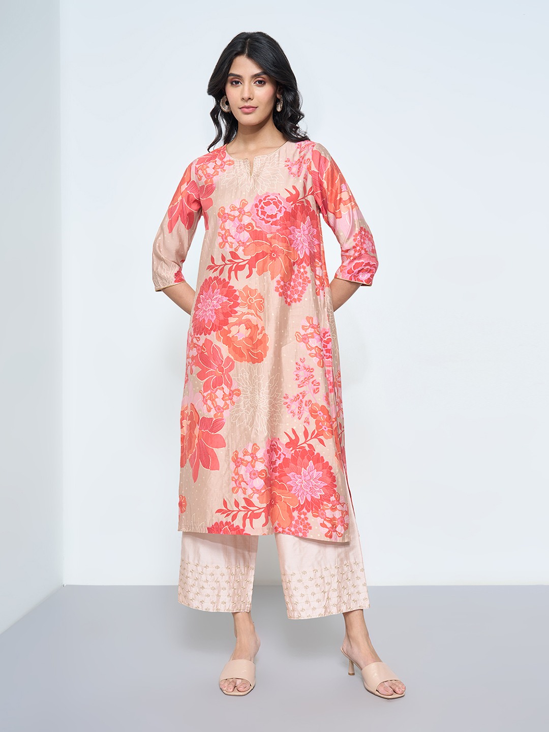 A burst of coral florals brings a vivid flourish to this festive kurta. Cut in a contemporary silhouette, it’s detailed with a round slit neckline, 3/4 sleeves, and a lustrous base that catches the light beautifully. The interplay of soft sheen and saturated hues gives it a refined yet lively presence.