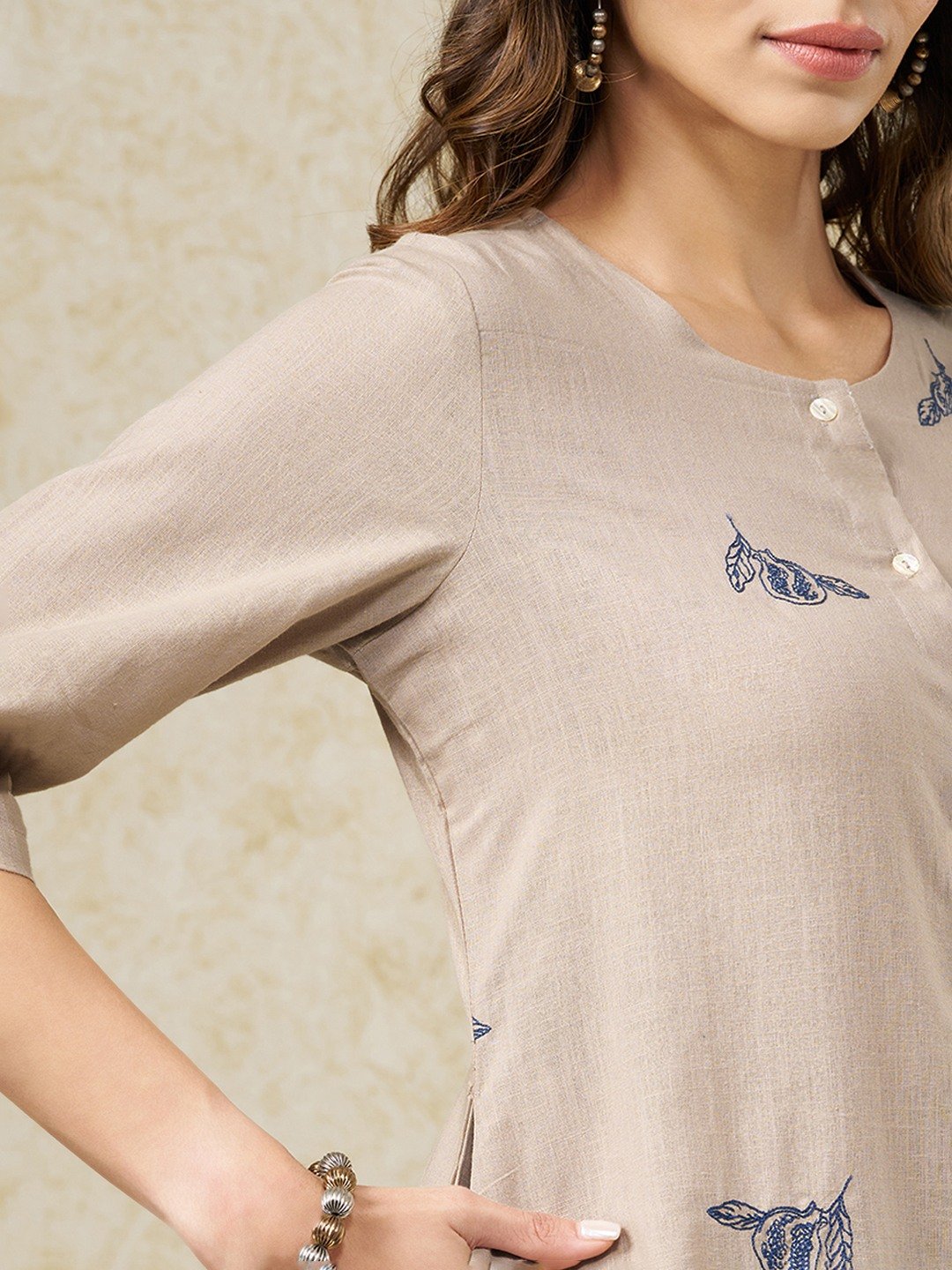 Softly detailed with a restrained, artisanal mood, this kurta keeps the focus on craft and ease. Designed with a round neckline and full front button placket, it features 3/4 sleeves and delicate pomegranate embroidery scattered across the body for a subtle decorative finish. The clean lines and fluid fall make it an understated yet expressive piece.