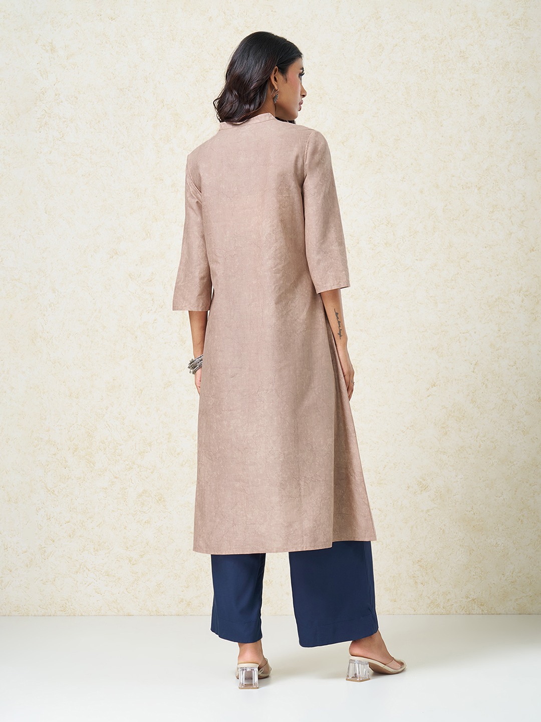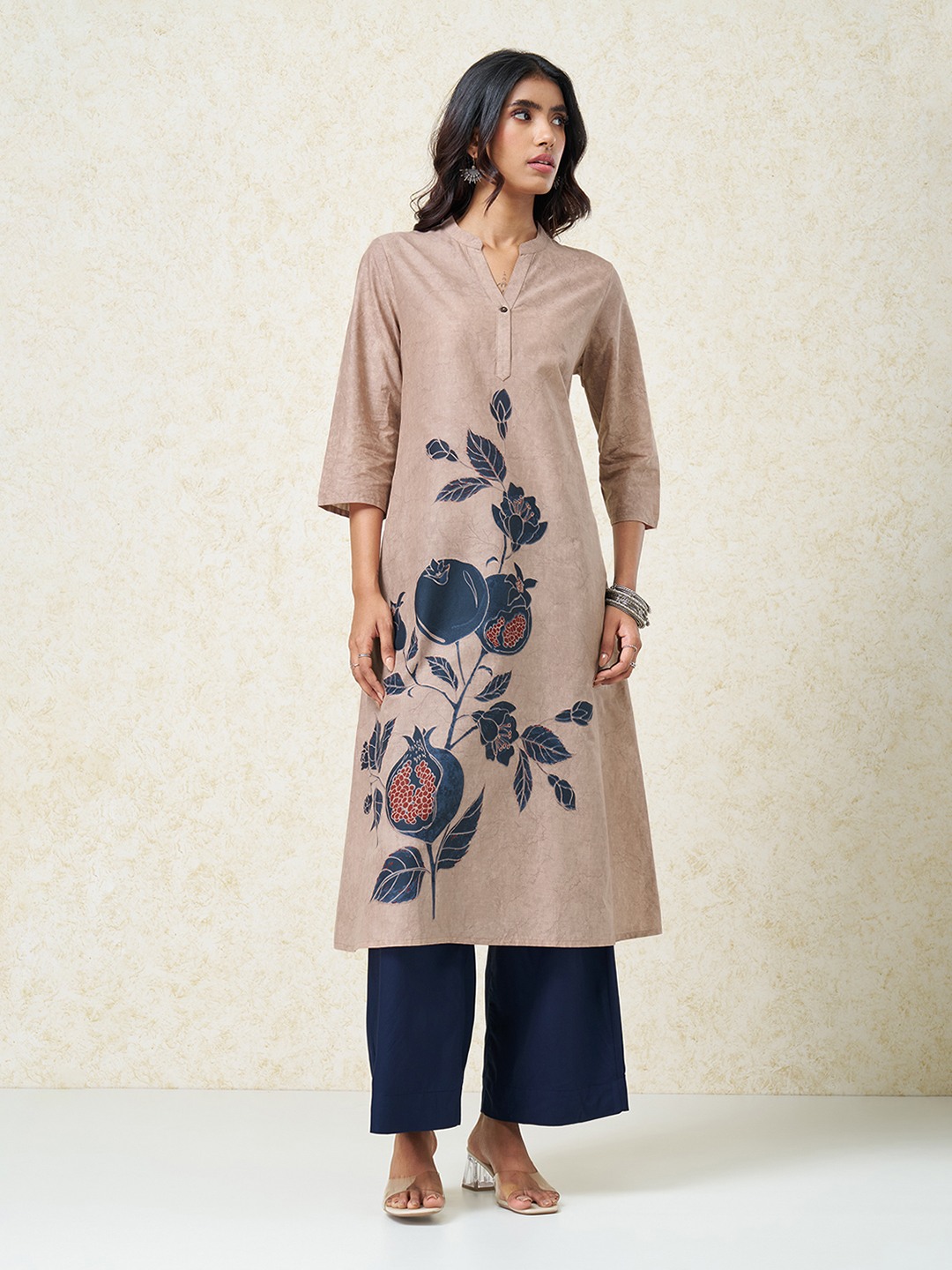 A calm, contemporary kurta designed to balance softness with visual depth. Shaped in a flowing silhouette with a split neckline and 3/4 sleeves, it features a bold botanical placement print that climbs diagonally across the body for a striking yet composed finish. Effortless and refined, it works equally well for workdays and relaxed occasions.