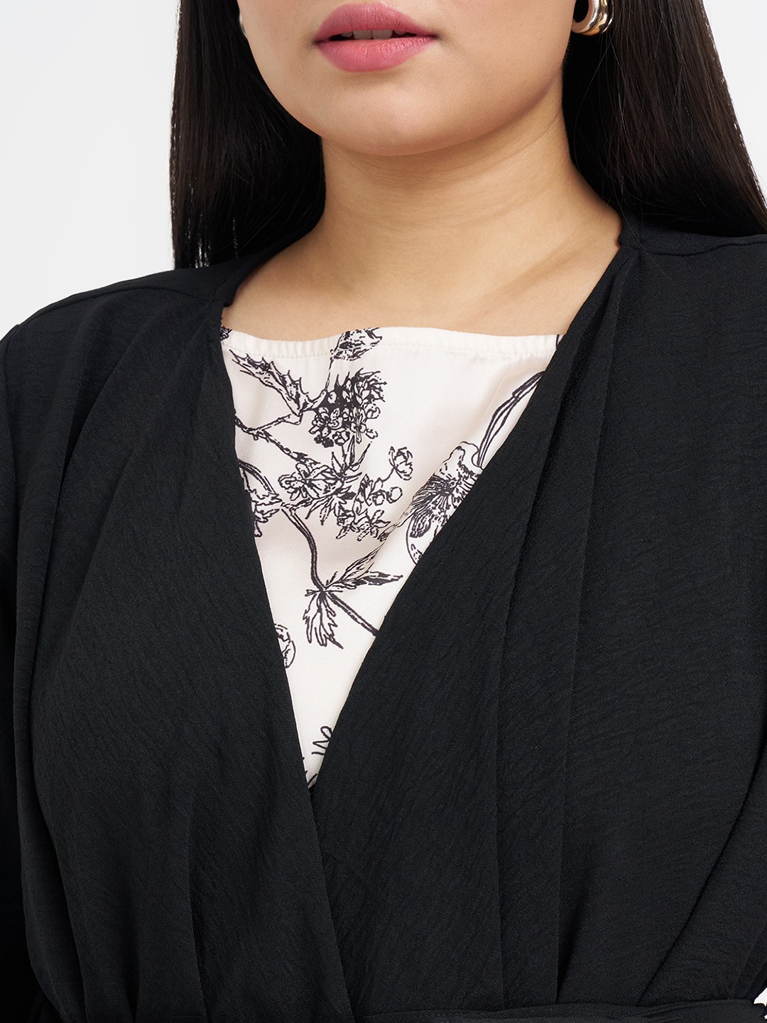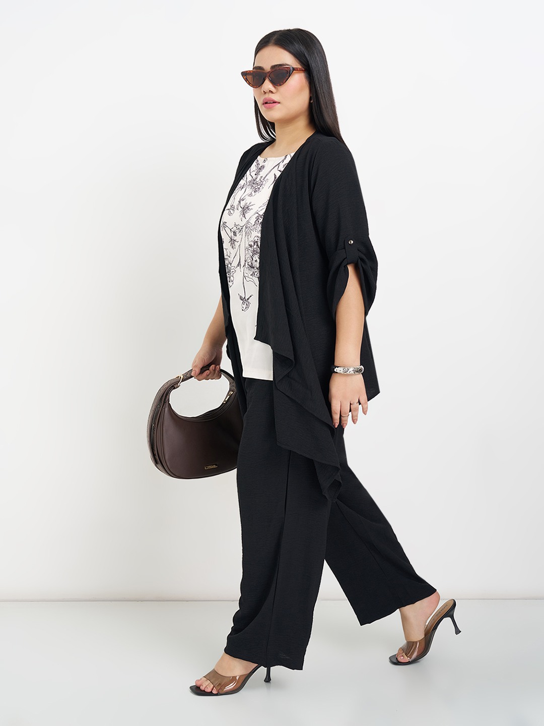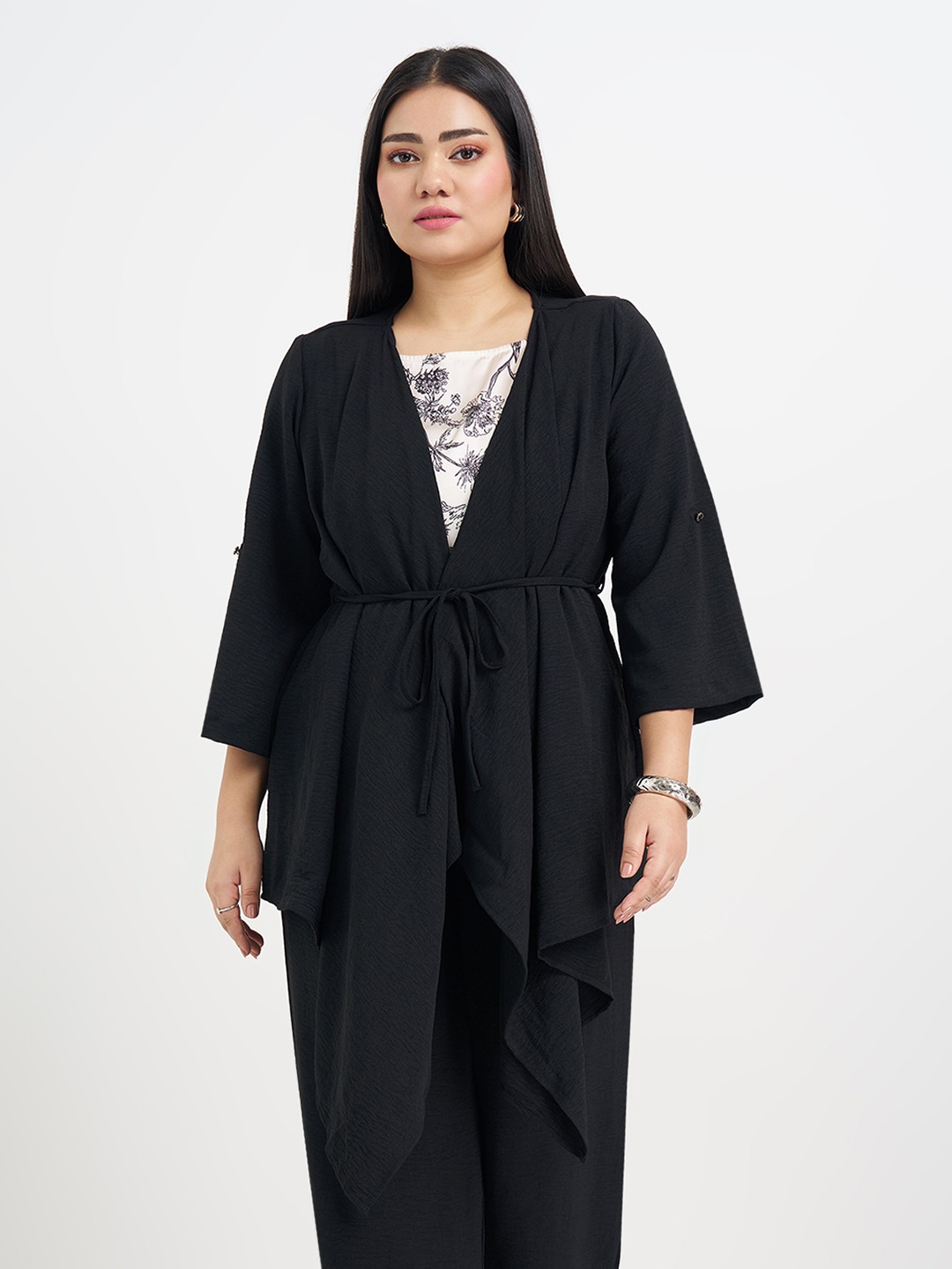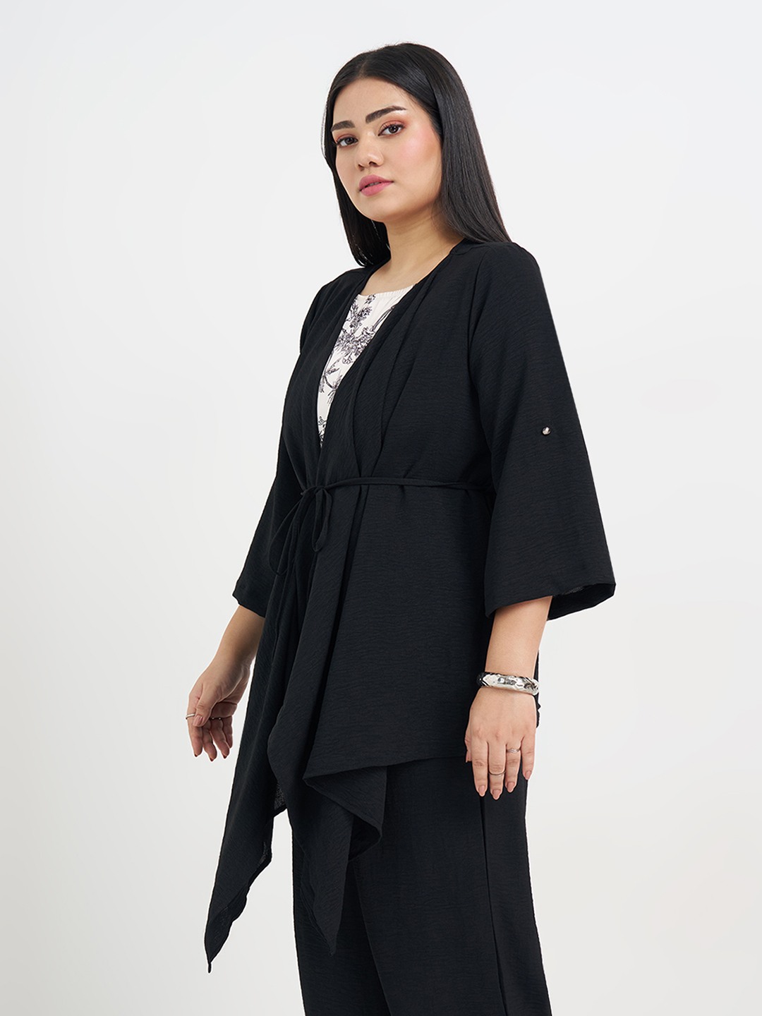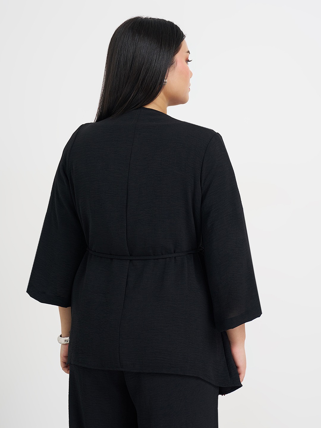 Fluid lines and a soft waterfall drape give this lightweight jacket an effortlessly polished presence. Designed with an open-front silhouette, cascading panels, a self-fabric waist tie and 3/4 sleeves with roll-tab detail, it layers easily without adding bulk. The unlined woven fabric moves gracefully, making it ideal for transitional styling.