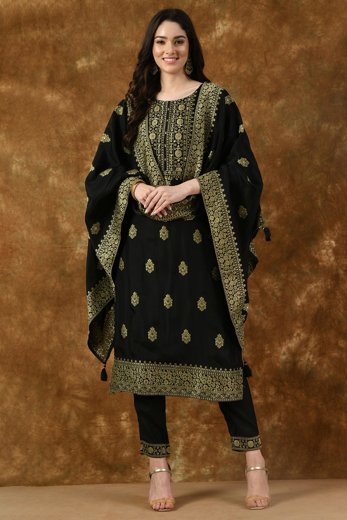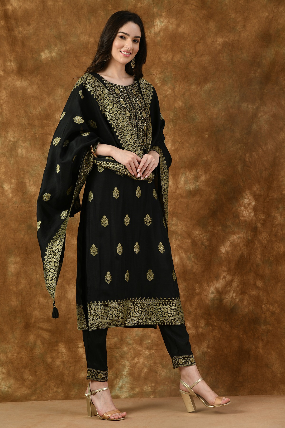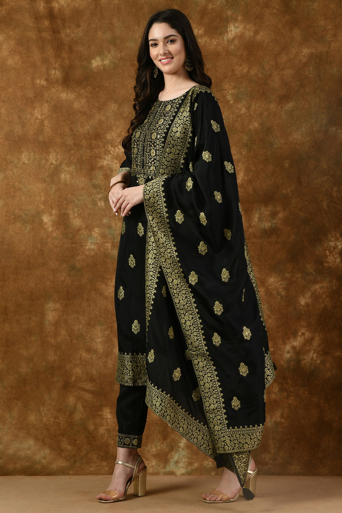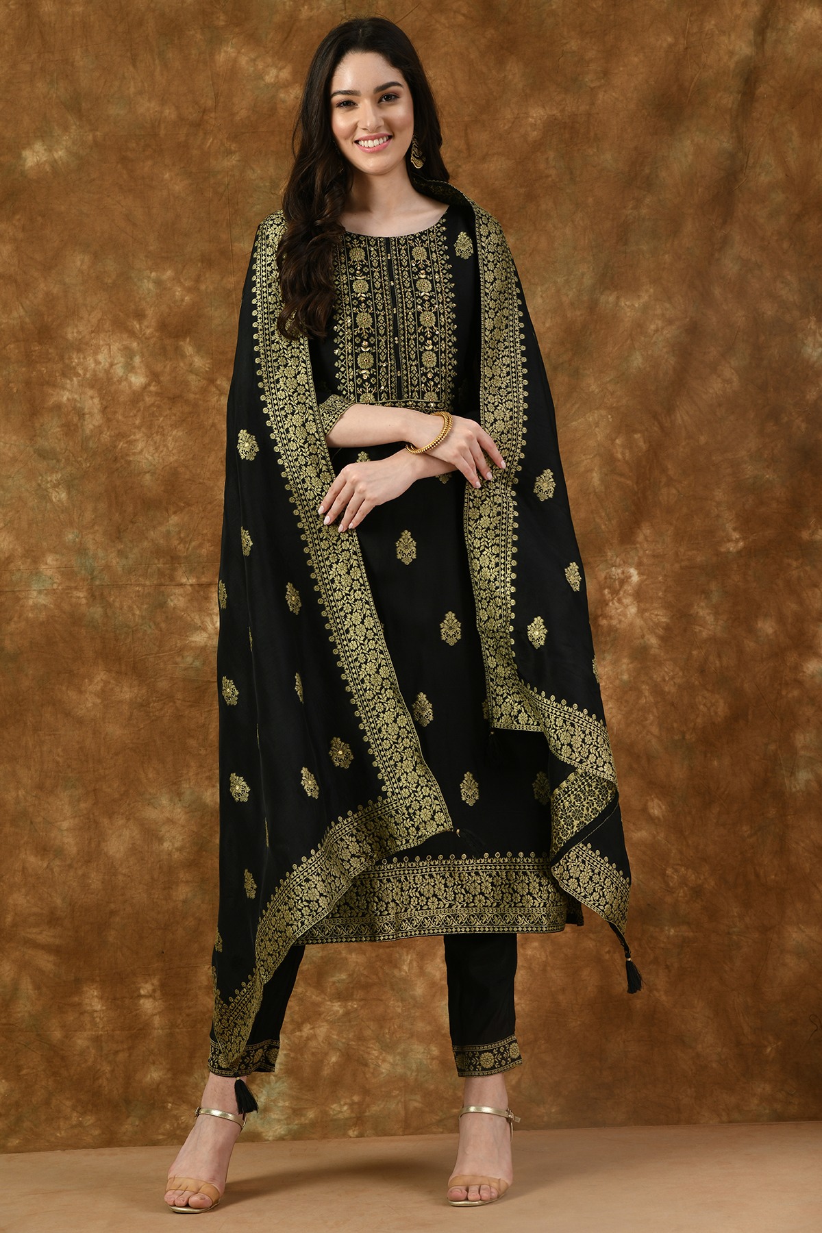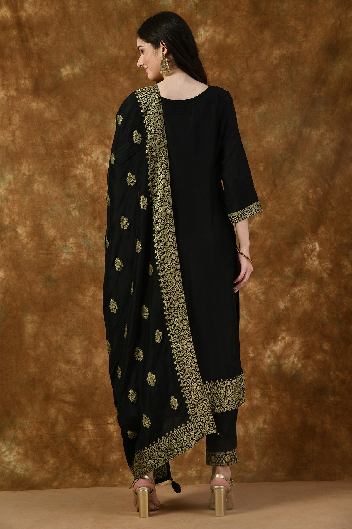 Black embroidered cotton jacquard straight kurta with pant and dupatta, has a round neck, three-quarter sleeves, side slits with straight hemline.