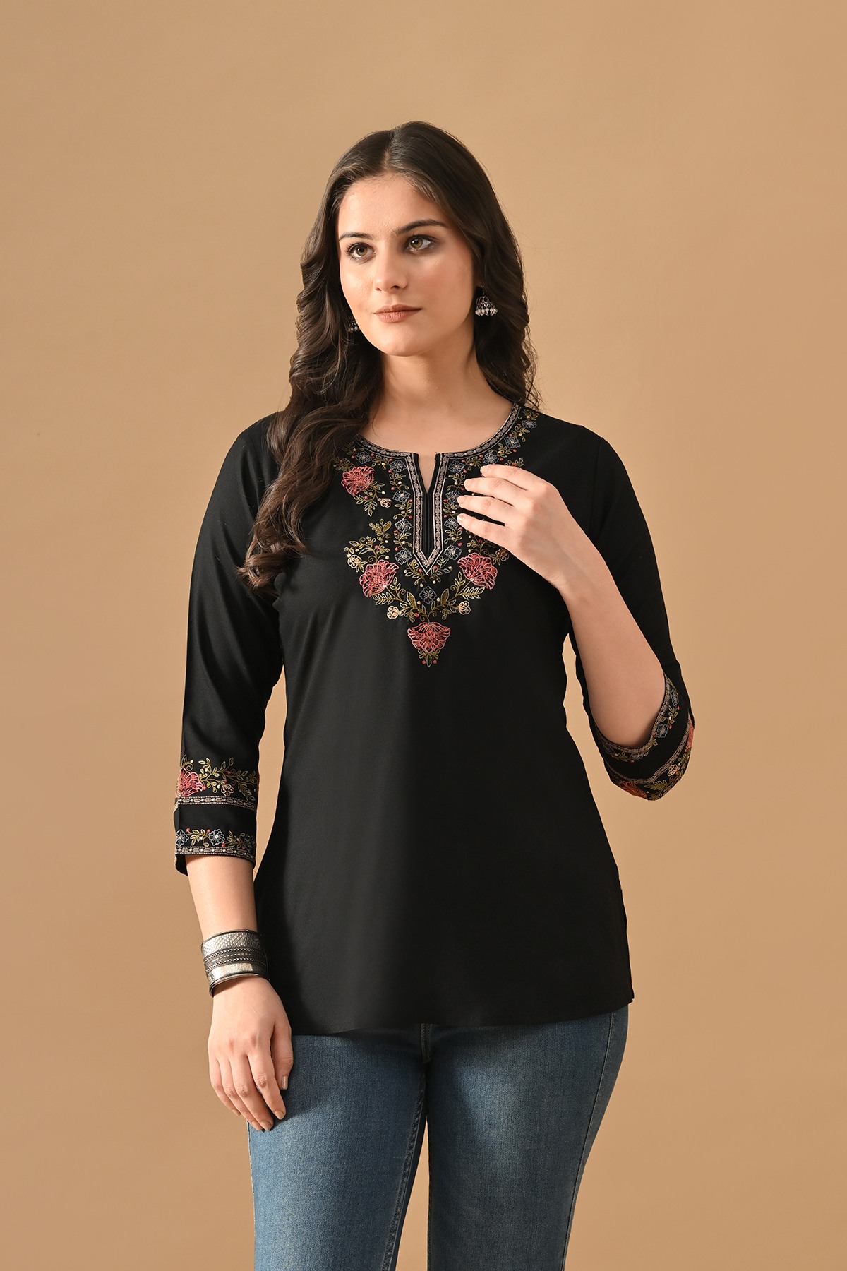 This black embroidered straight top features a graceful round-neckline, three quarter sleeves, and a straight hemline. designed with chic detailing and contemporary elegance, it’s a versatile piece—perfect for elevating both casual outings and semi-formal occasions.