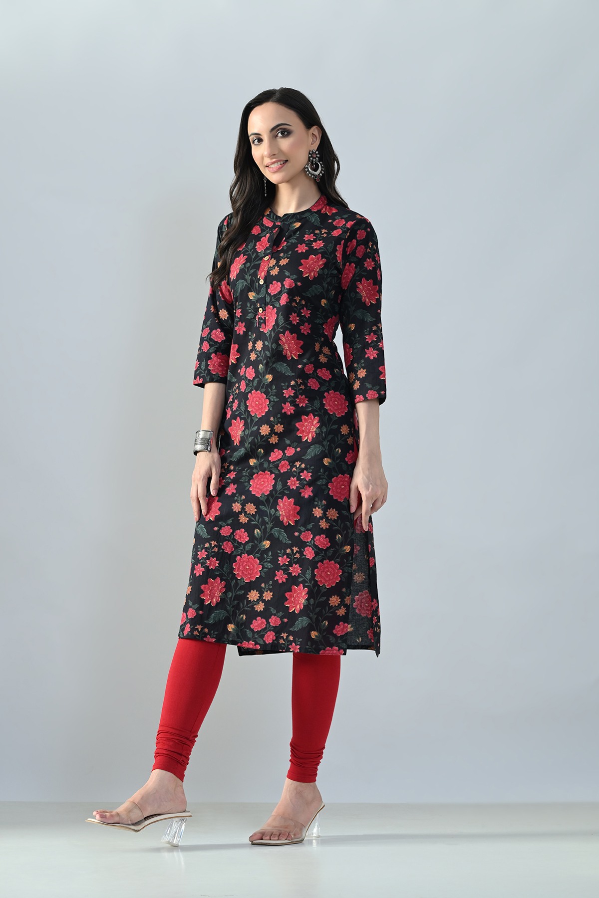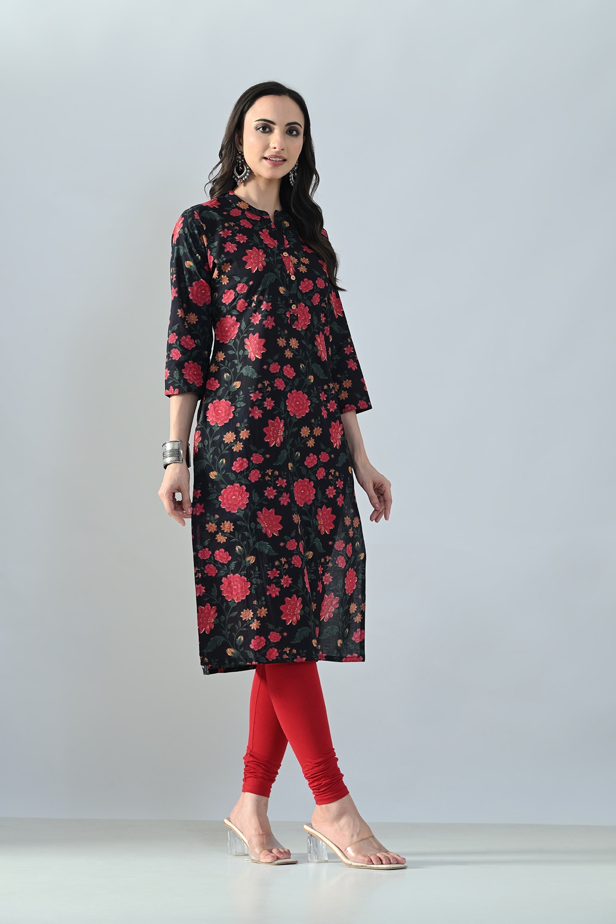 Black Floral-Printed Straight Kurta With A Stylish Mandarin Neckline, Three-Quarter Sleeves, And A Side-Slit Hemline. Blending Comfort And Elegance, It Is Ideal For Casual Occasions.