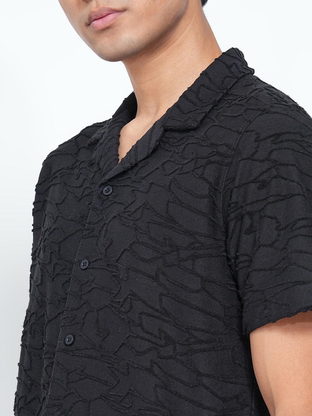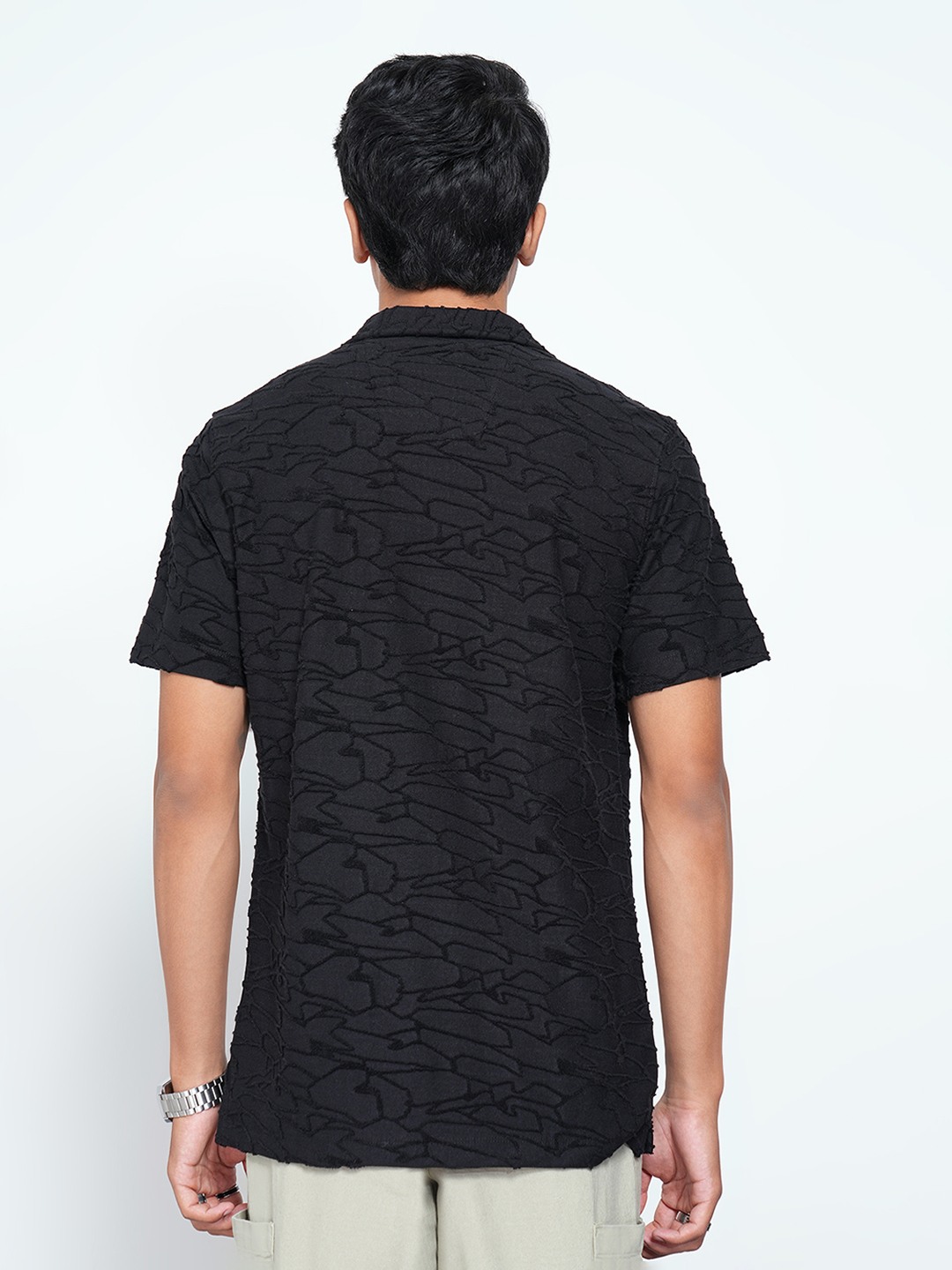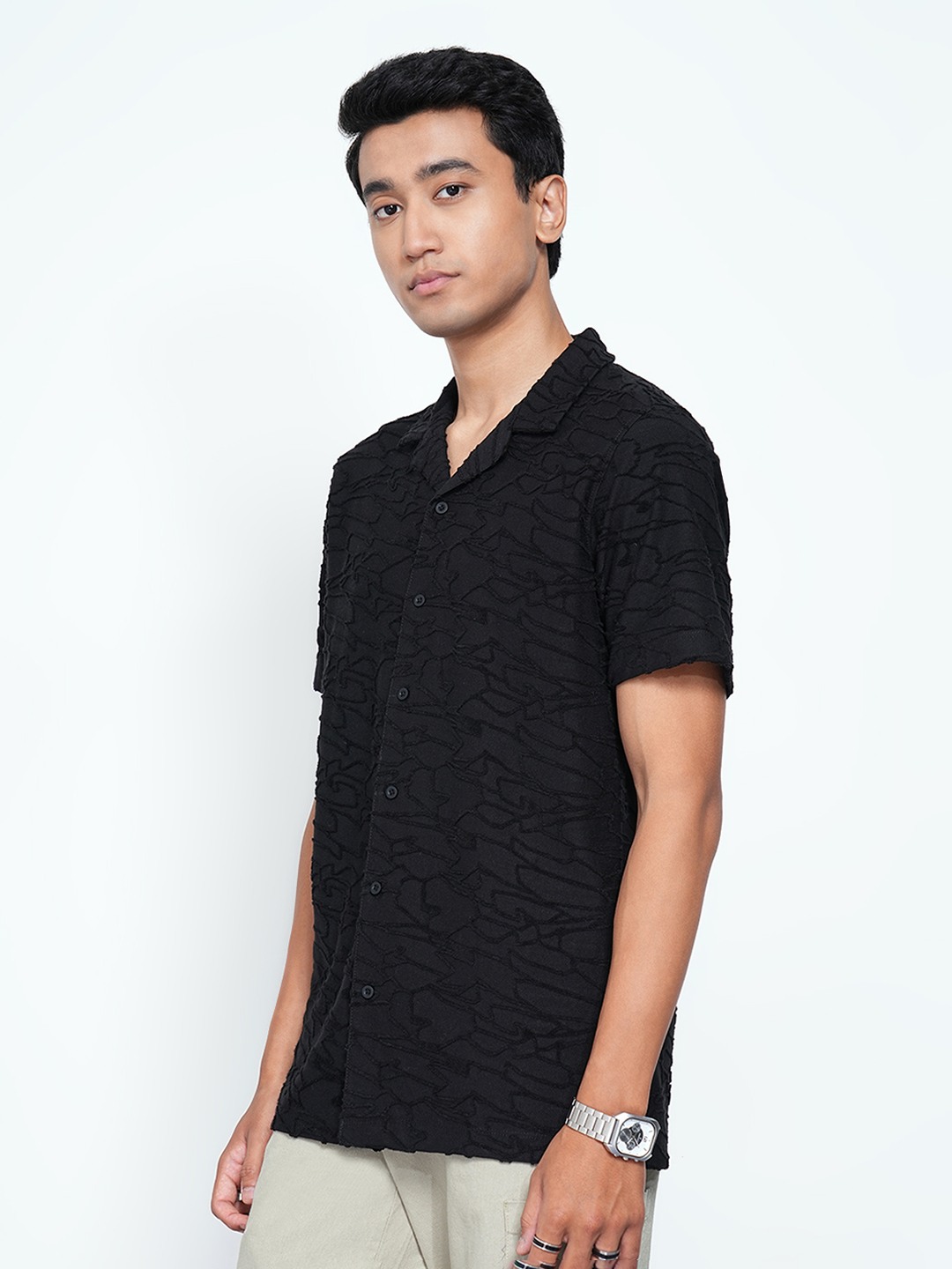 Defined by its tonal jacquard weave, this shirt brings depth and dimension to a timeless silhouette. It features a relaxed camp collar, half sleeves, and a buttoned front for an effortless yet refined look. The subtle raised texture lends a modern, tactile finish.