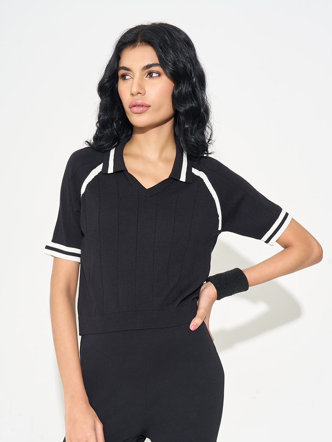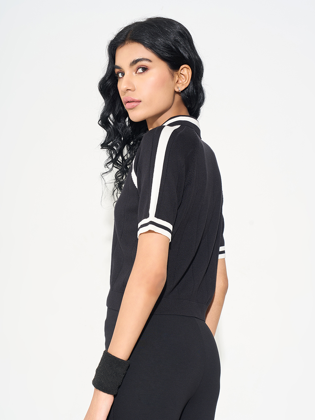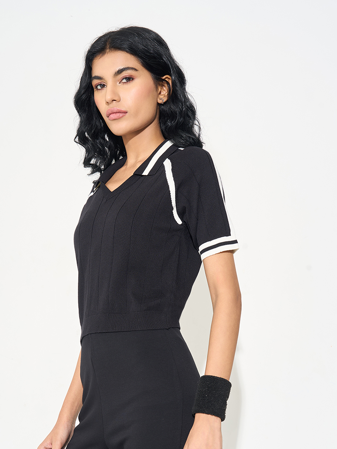 Home/Tops/Ajile by Pantaloons/black johnny collar contrast accent flat knit top