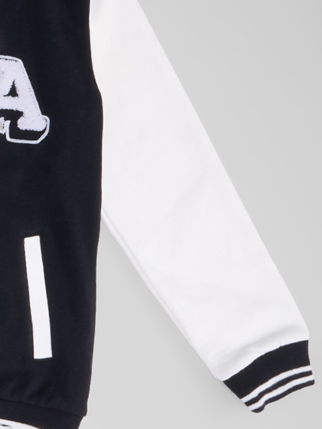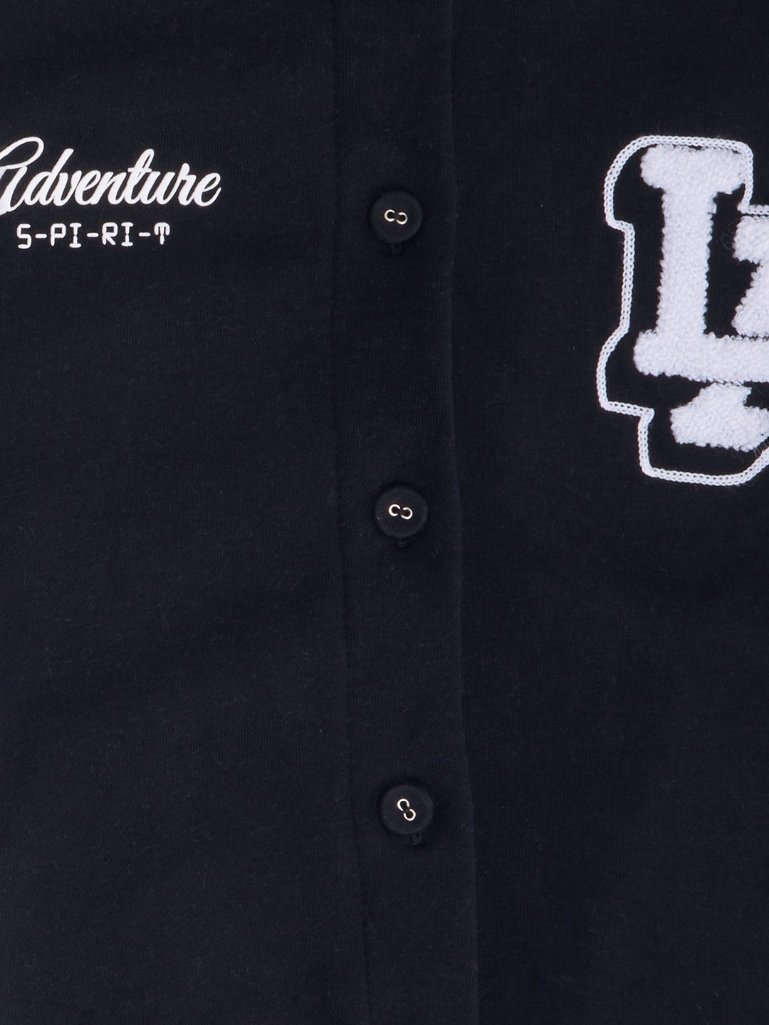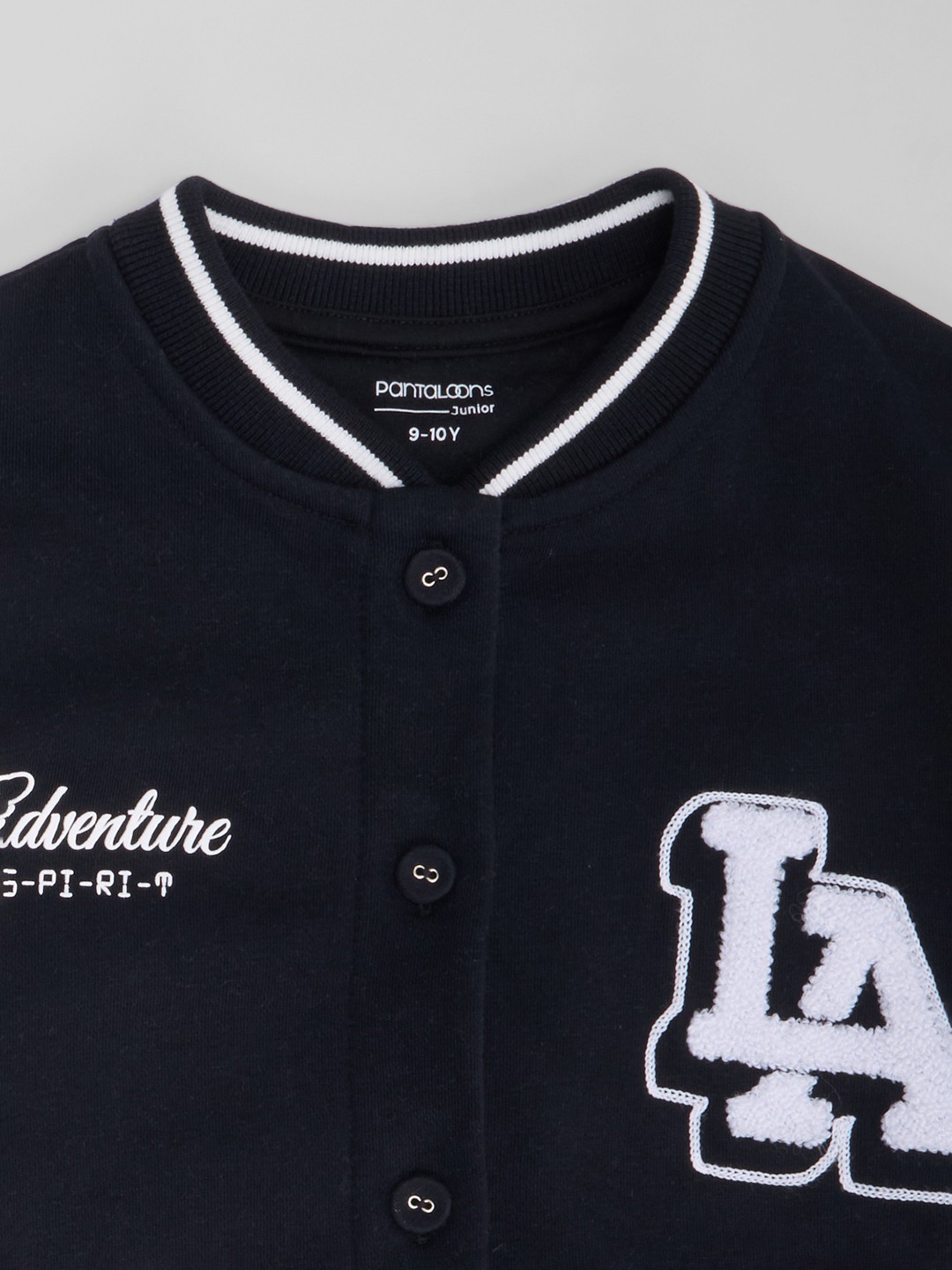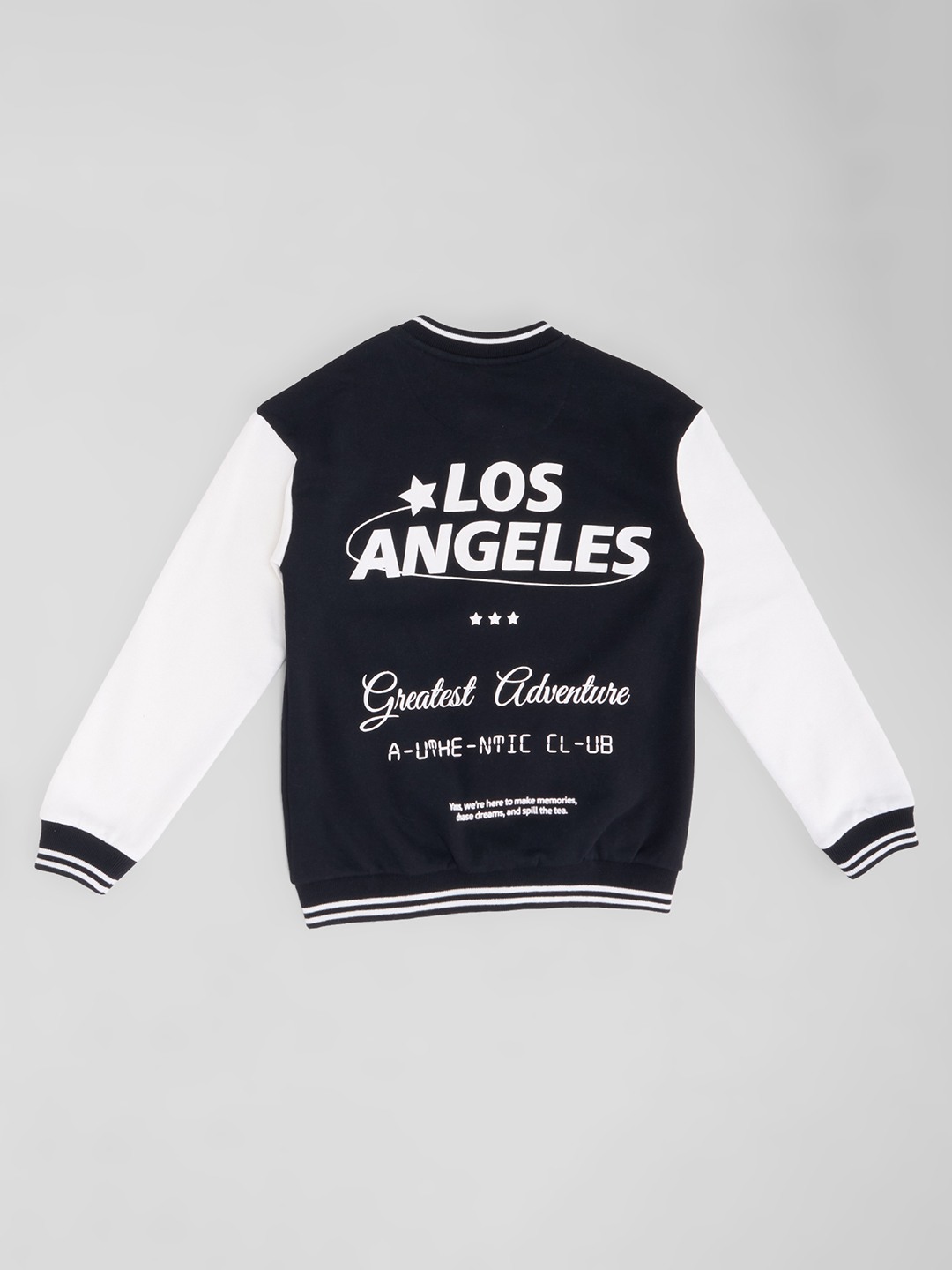 A throwback classic that brings all the cool-kid energy. Featuring contrast sleeves, striped ribbed trims, snap-button closure, and embroidered “LA” detail at the chest, the back is amped with a bold Los Angeles slogan print. The relaxed fit and soft knit body keep it both comfy and on-trend.