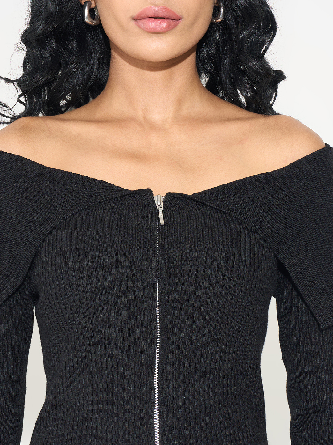 Black Off-Shoulder Rib Knit Zip-Up Top