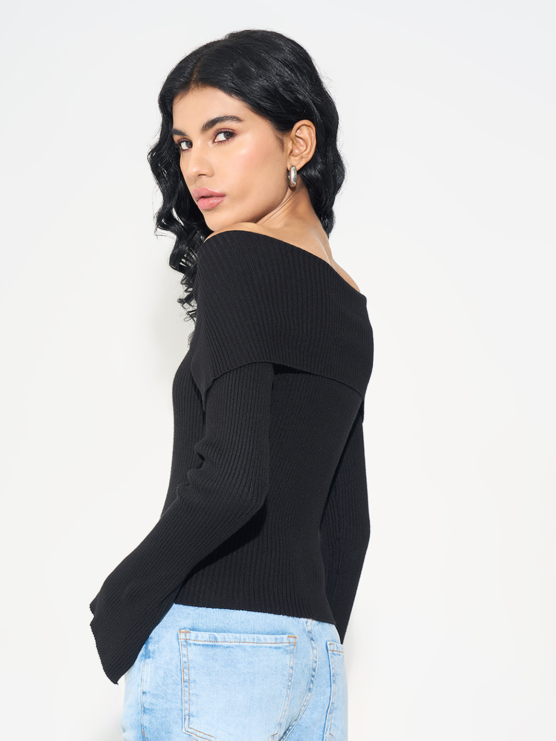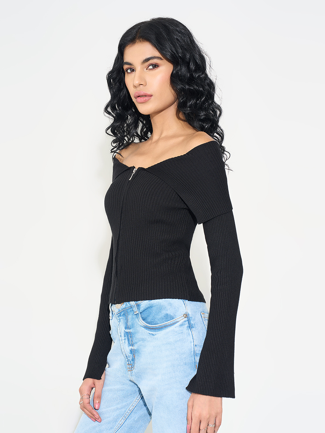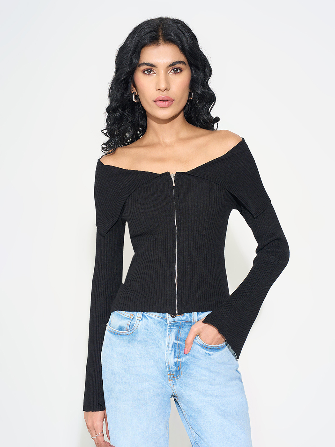 Home/Tops/SF JEANS by Pantaloons/black off-shoulder rib knit zip-up top