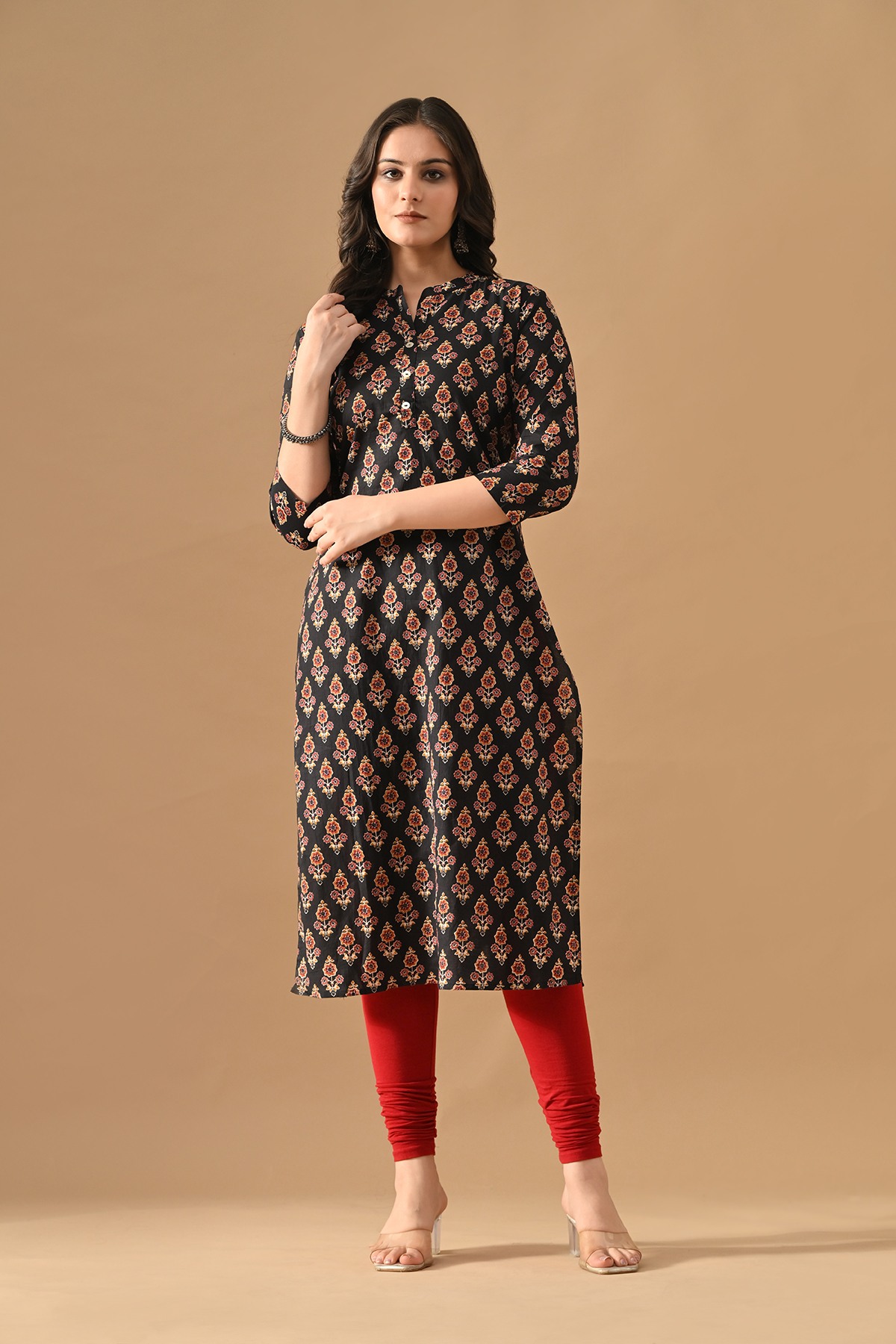 Black floral-printed pintex kurta with mandarin collar neck, three-quarter sleeves, straight hemline, and side slit. elegant and comfortable, perfect for casual outings. pair with bottoms for a chic look.