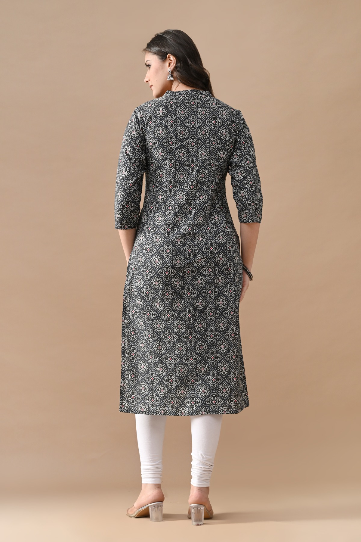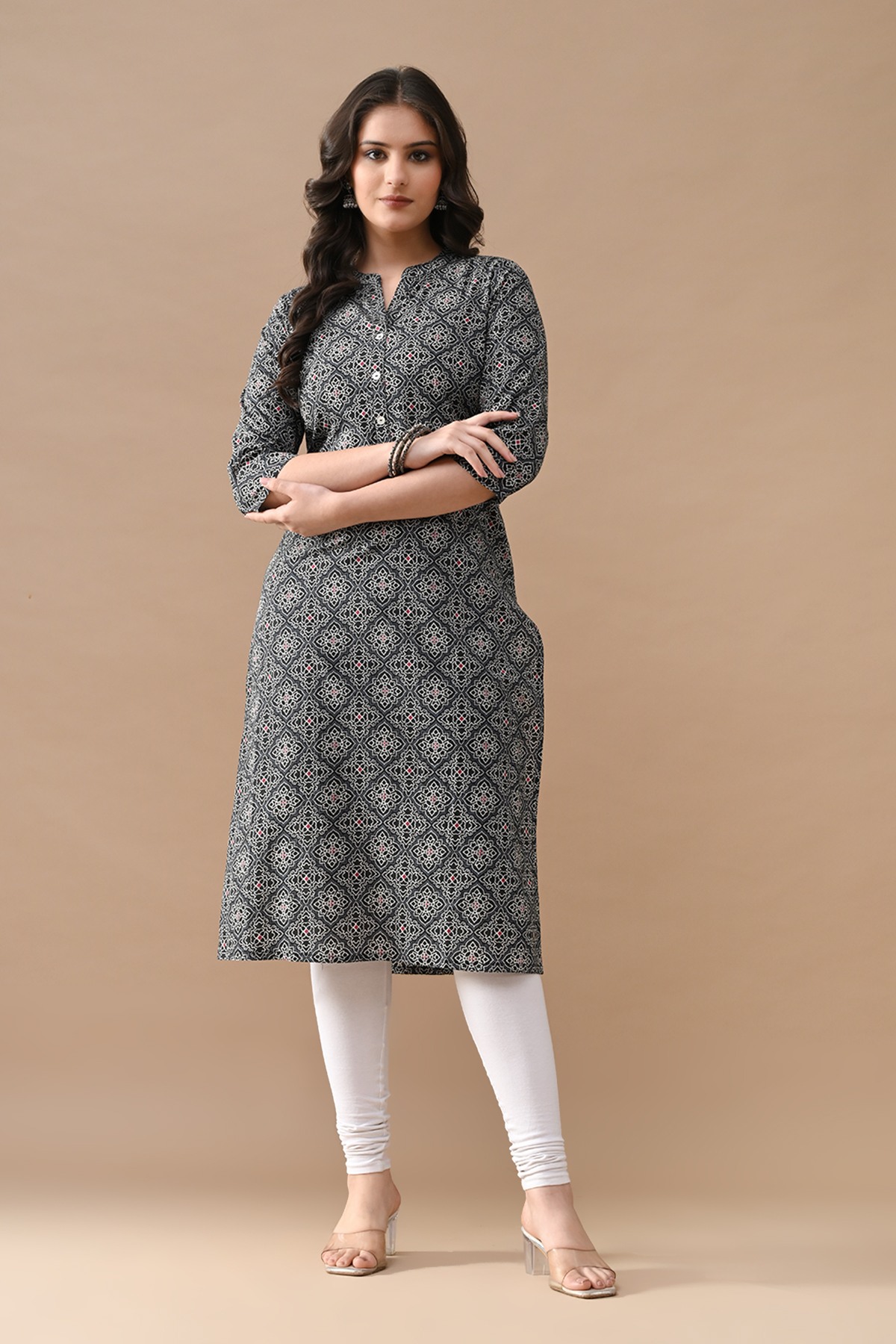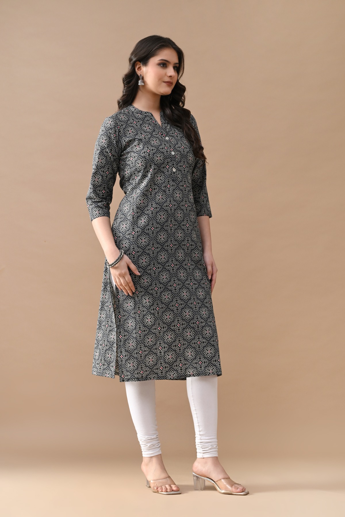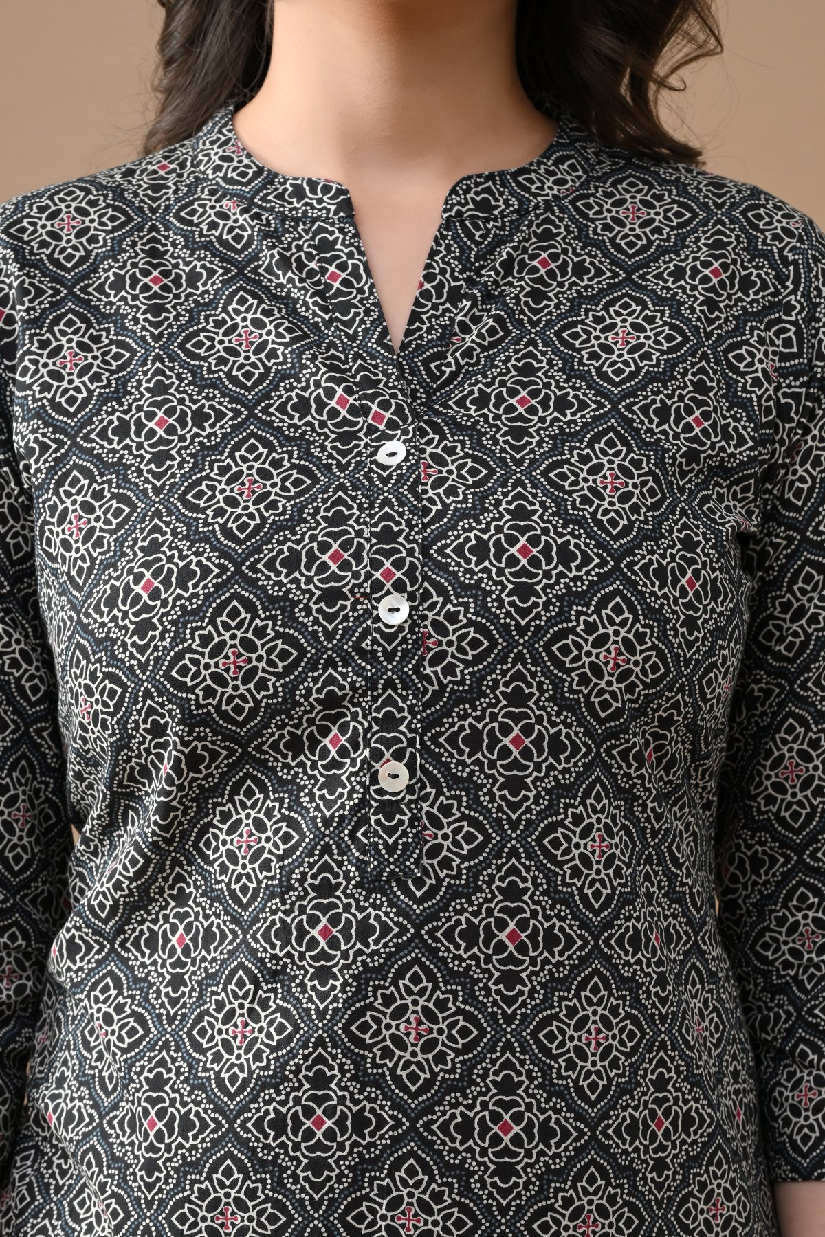 Black printed straight kurta featuring a v-neckline, three-quarter sleeves, a straight hemline, and side slits. elegant and stylish, it’s perfect for casual and semi-formal occasions, ensuring comfort with a touch of sophistication.