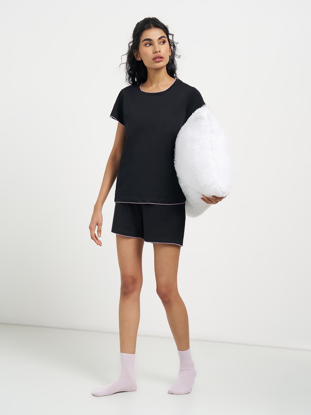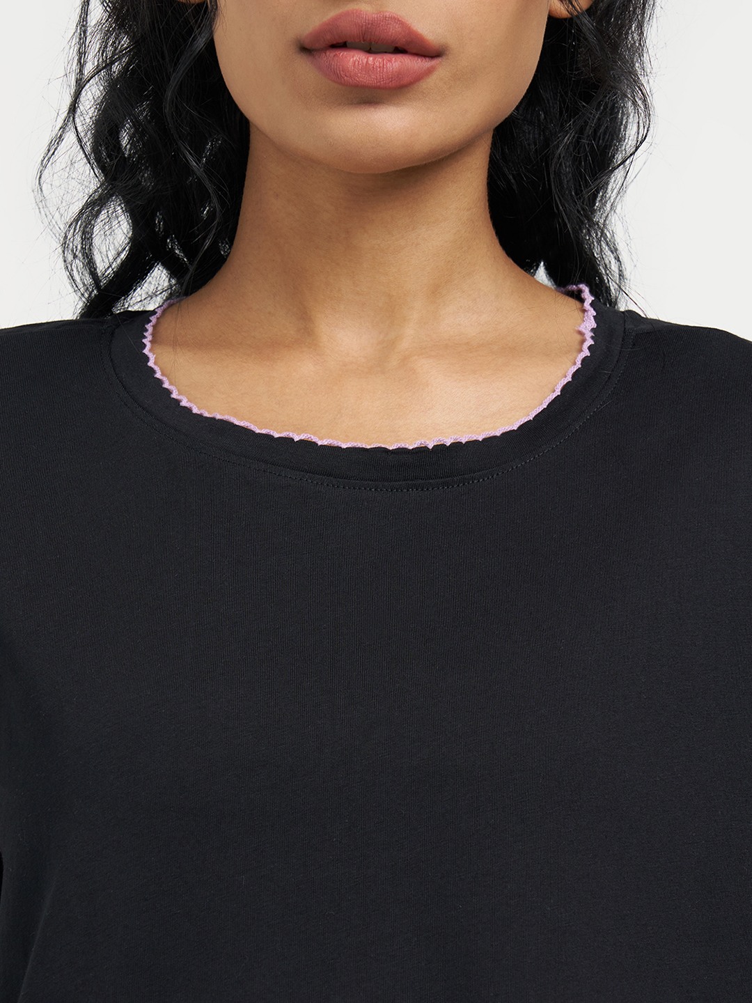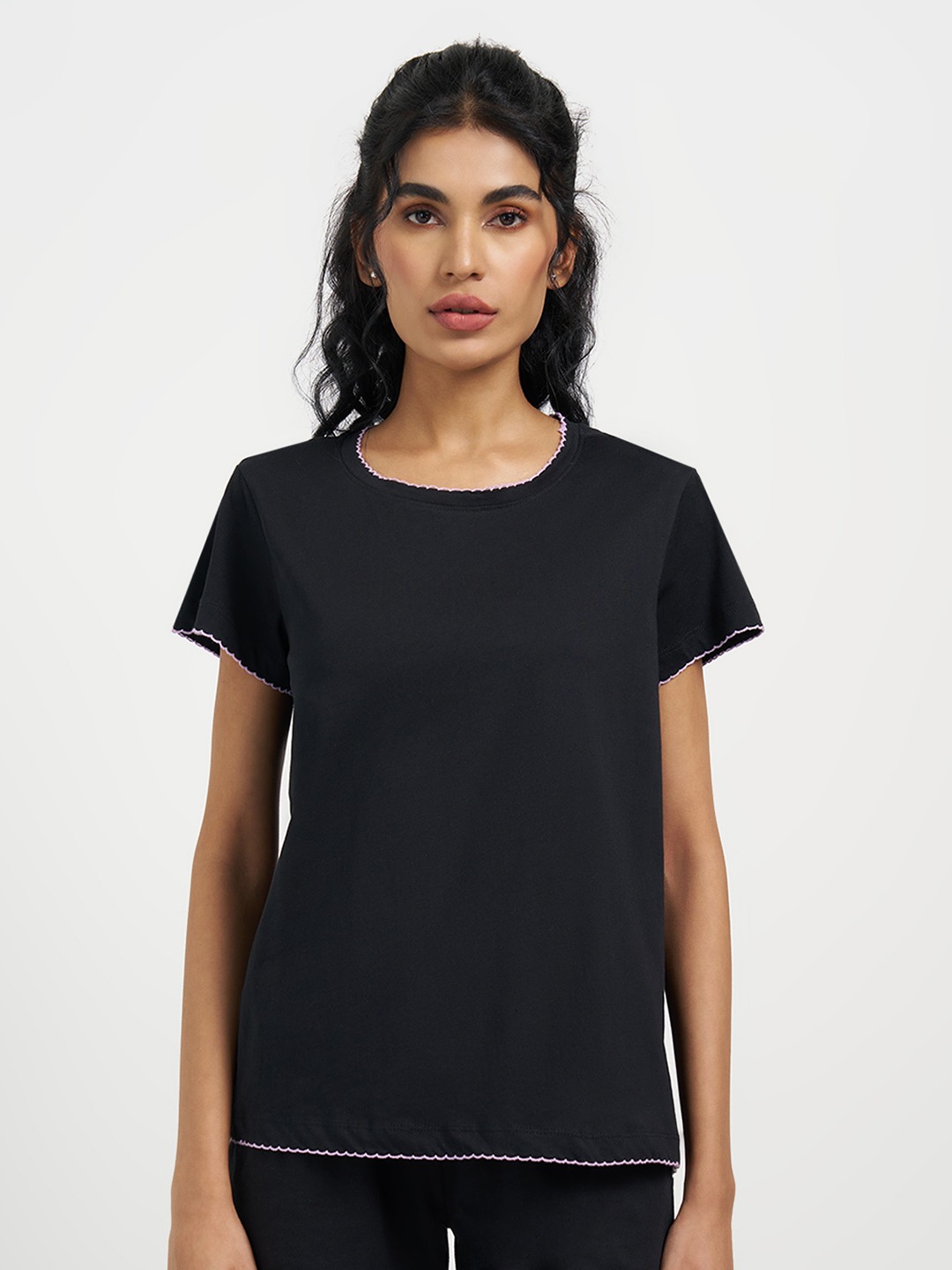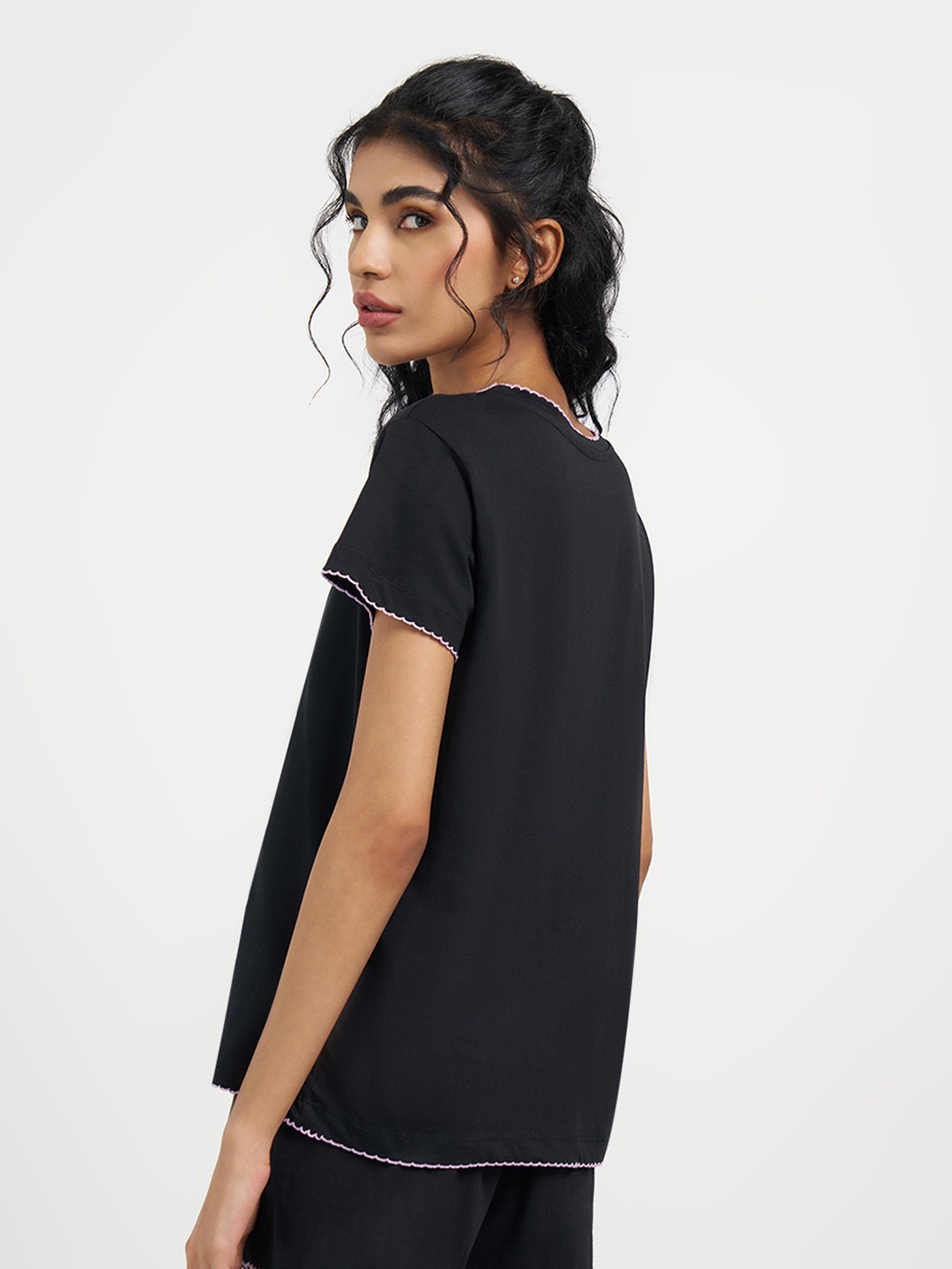 Easy comfort with a clean, no-fuss feel. Cut with a round neckline, short sleeves and a relaxed fit, this sleep T-shirt is finished with contrast trims for a soft, feminine detail. The knit fabric feels breathable and gentle on the skin, making it ideal for uninterrupted rest.