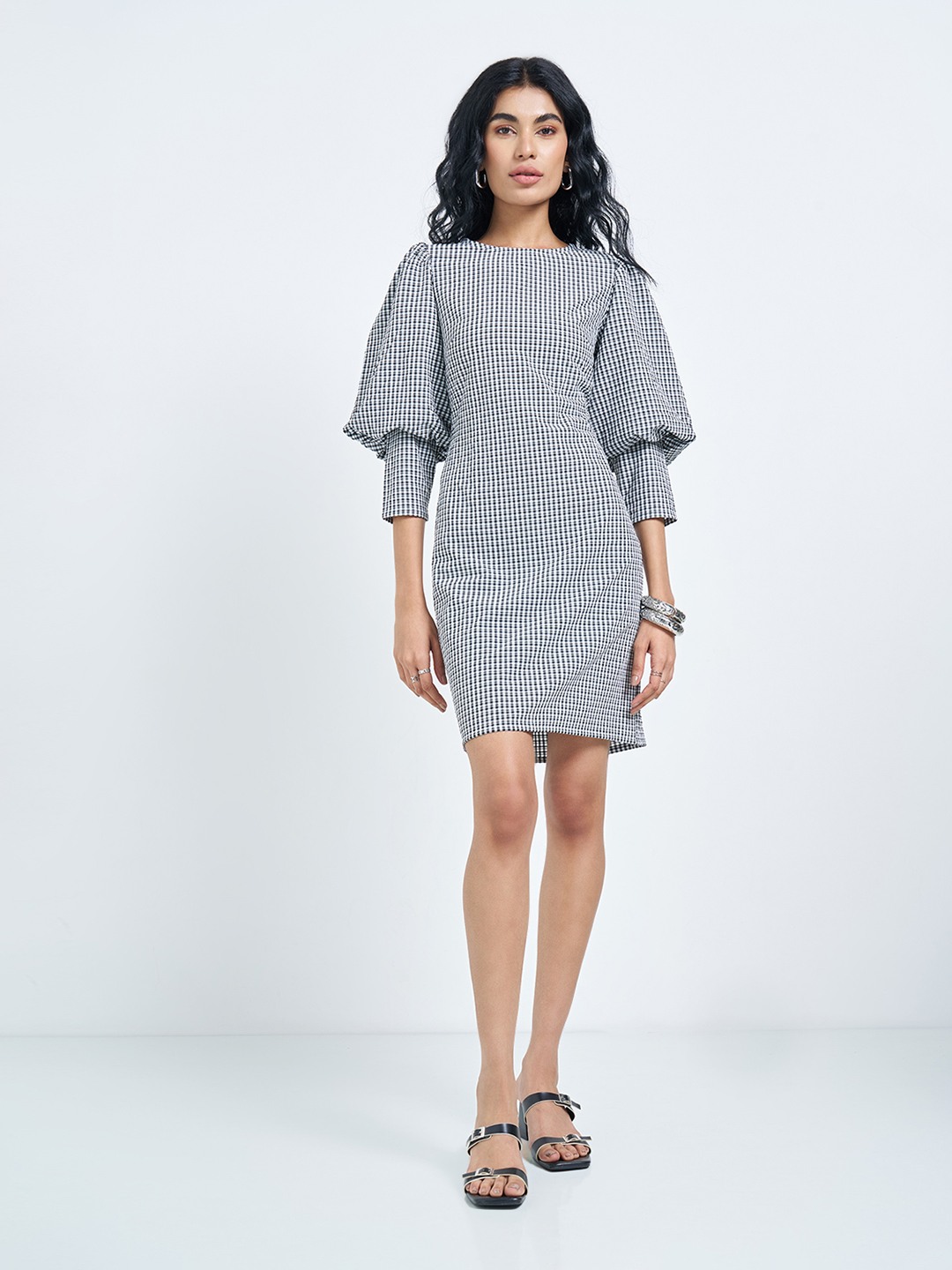 Clean lines meet statement volume in this crisp gingham shift silhouette. Cut with a tailored fit through the body, it features a round neckline, dramatic puff sleeves with cuffed hems, and a neat mini-length that keeps the look sharp. The woven check fabric adds subtle texture while holding the structure effortlessly.