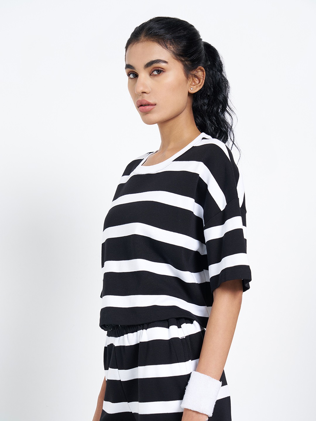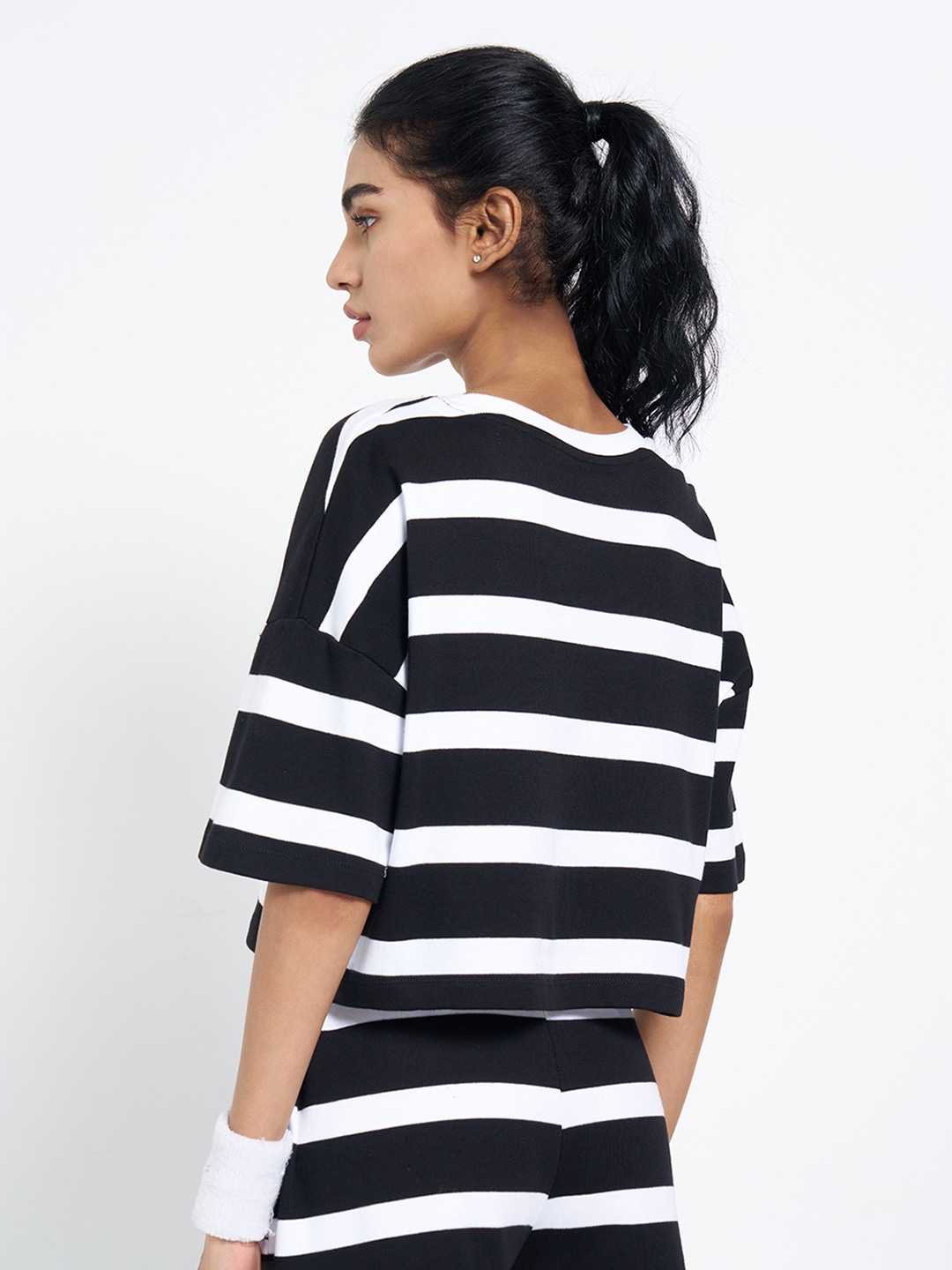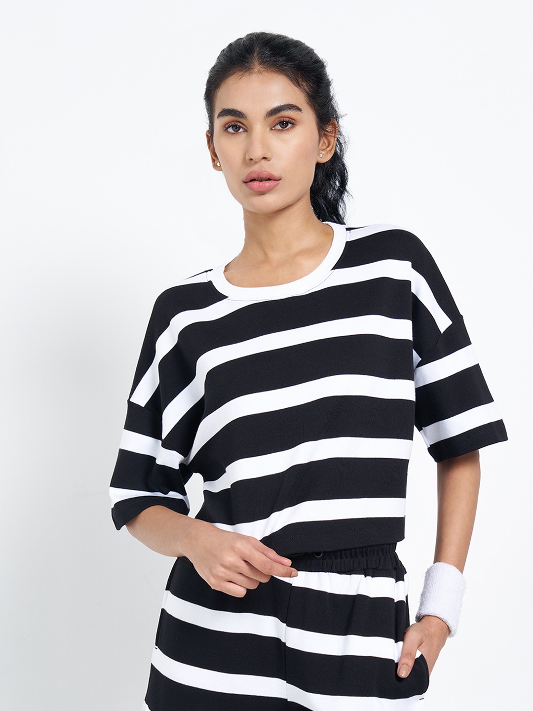 A bold striped cropped top designed with a relaxed, modern silhouette. Cut with dropped shoulders, half sleeves and a crew neckline. The soft knit construction keeps the feel comfortable while maintaining a sharp, coordinated look.