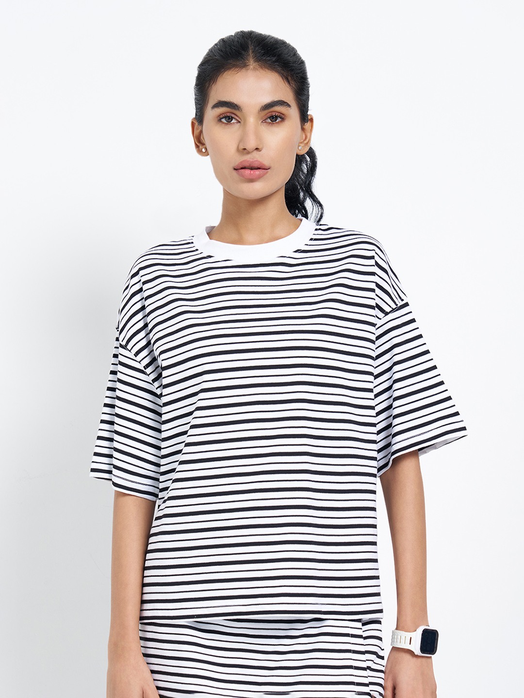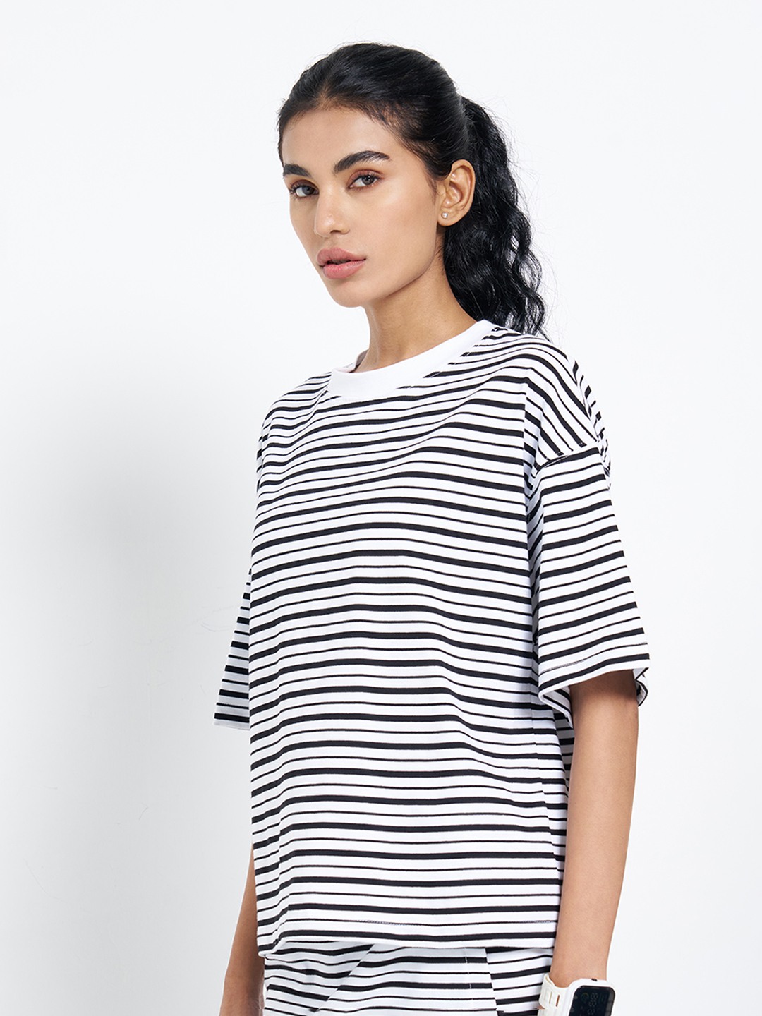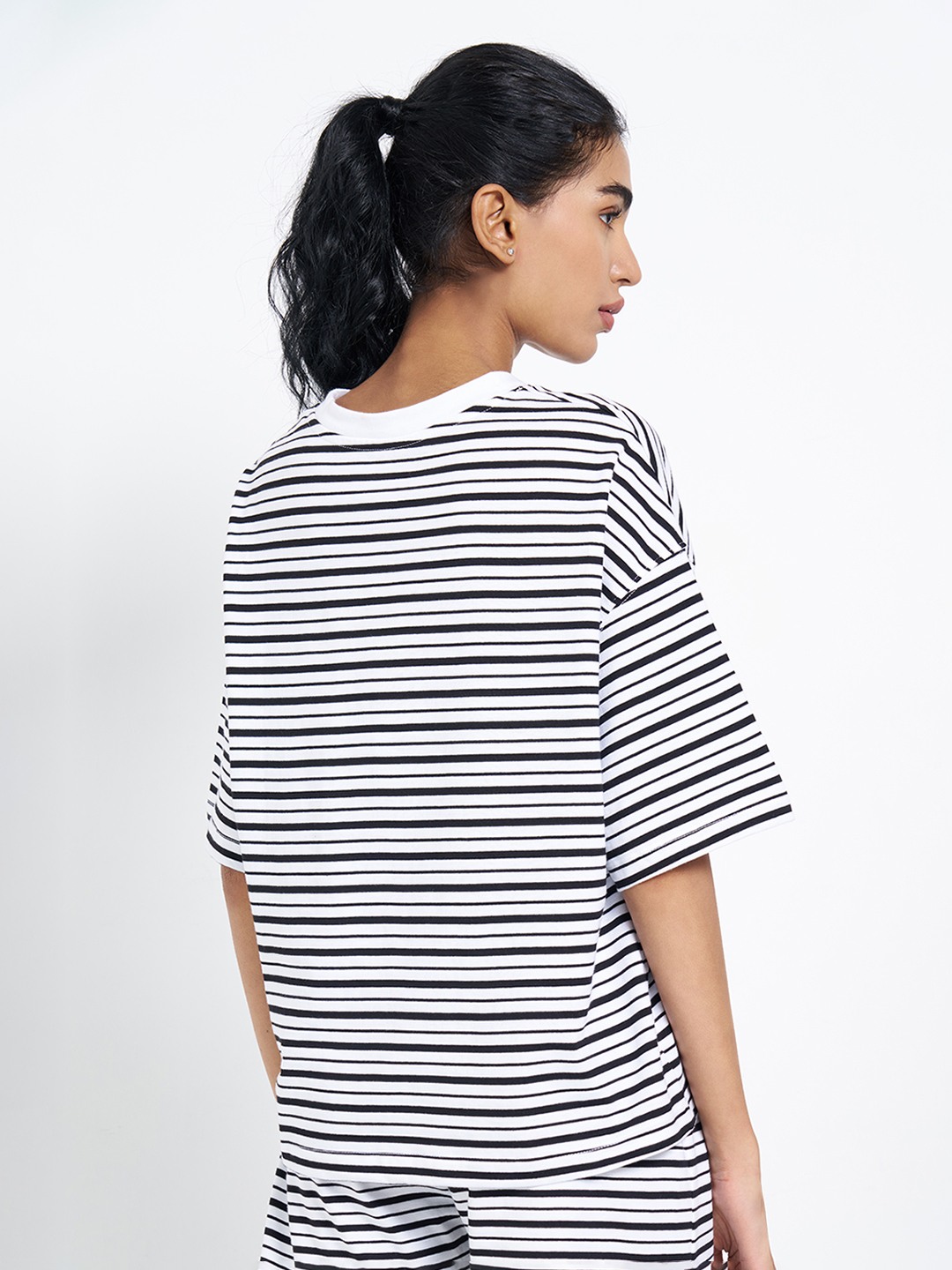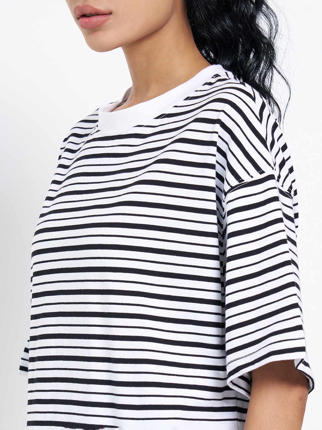 A relaxed oversized top designed for an effortless, off-duty silhouette. Featuring dropped shoulders, half sleeves and a crew neckline, it’s finished with horizontal stripes that enhance its easy, boxy shape. Cut in a soft, breathable knit, it drapes comfortably while allowing unrestricted movement.