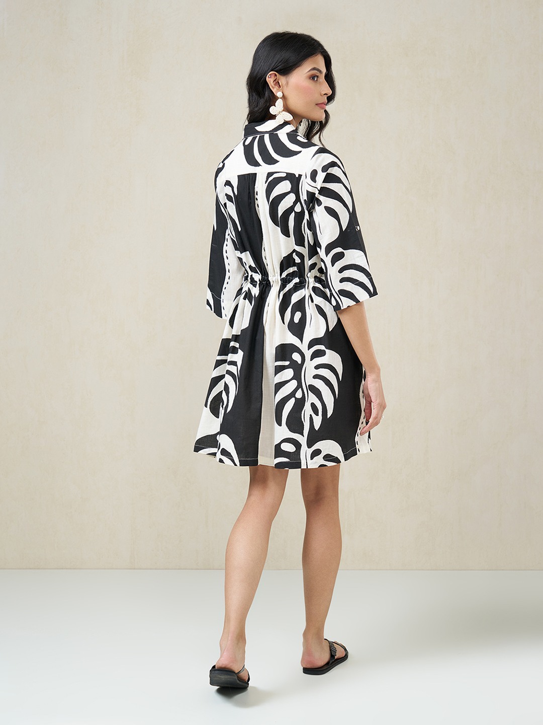 Bold contrast with an easy, summery feel. Designed with a shirt collar, button-up front, adjustable drawstring waist and turn-up elbow sleeves, this mini dress features an all-over tropical leaf print in a relaxed, flared silhouette. The lightweight woven fabric keeps it breathable and comfortable in warm weather.