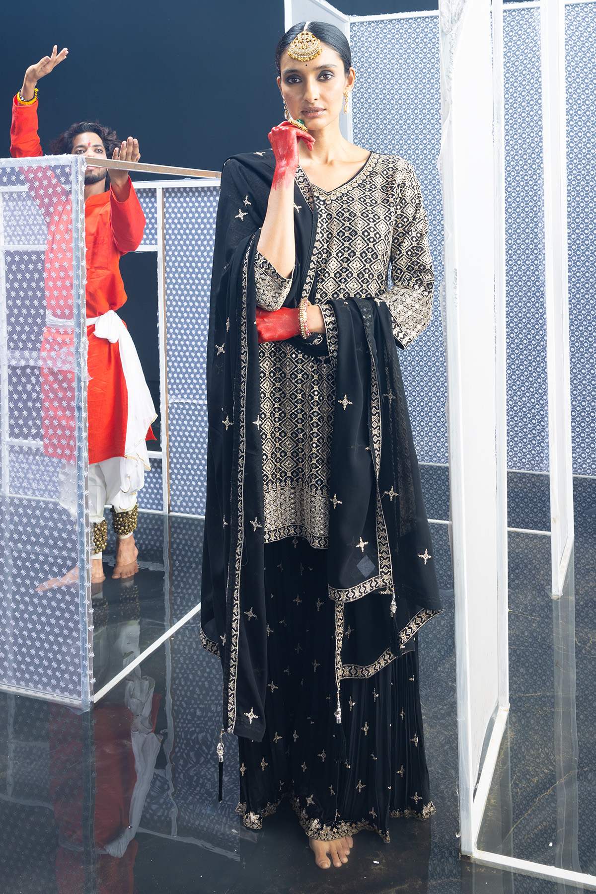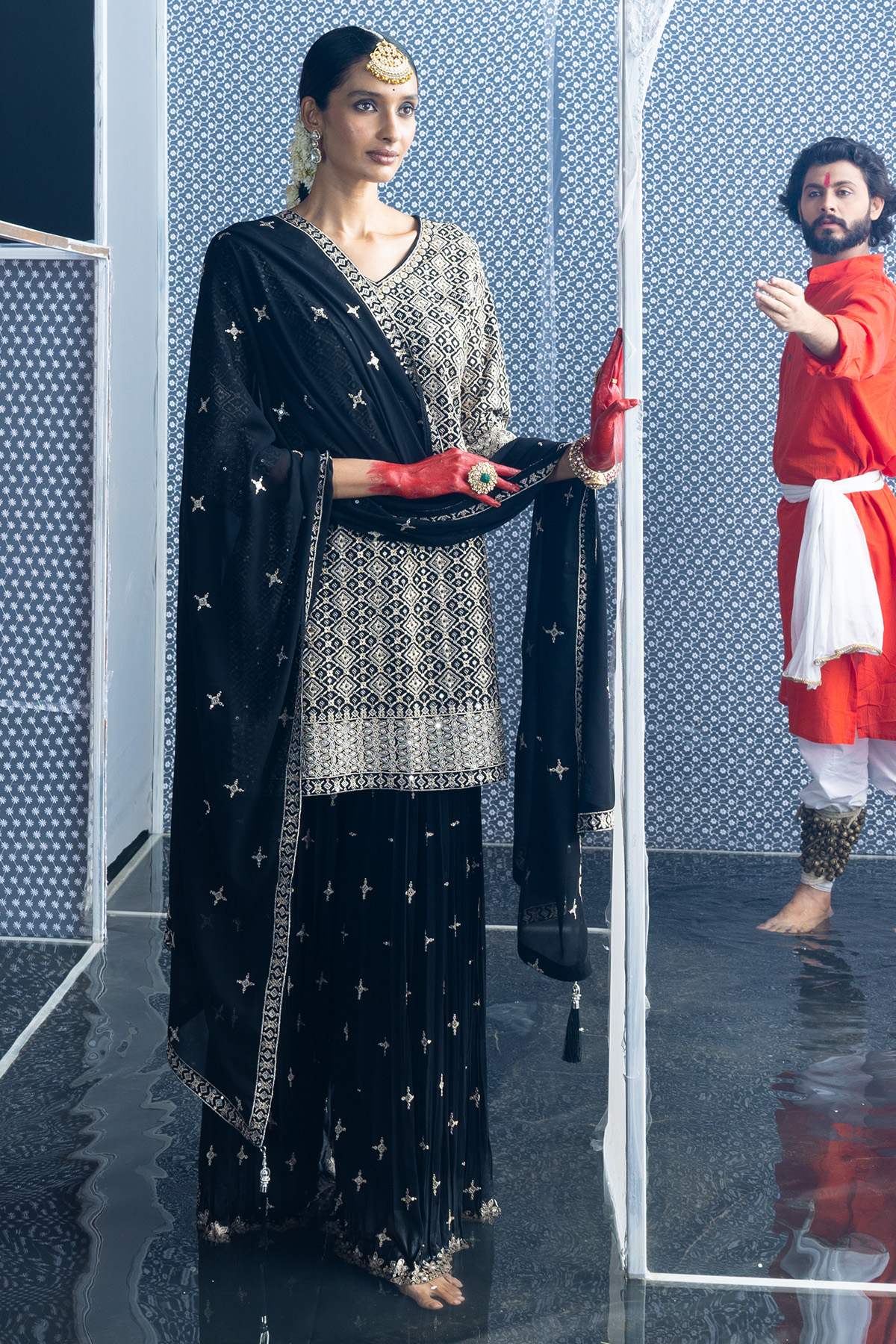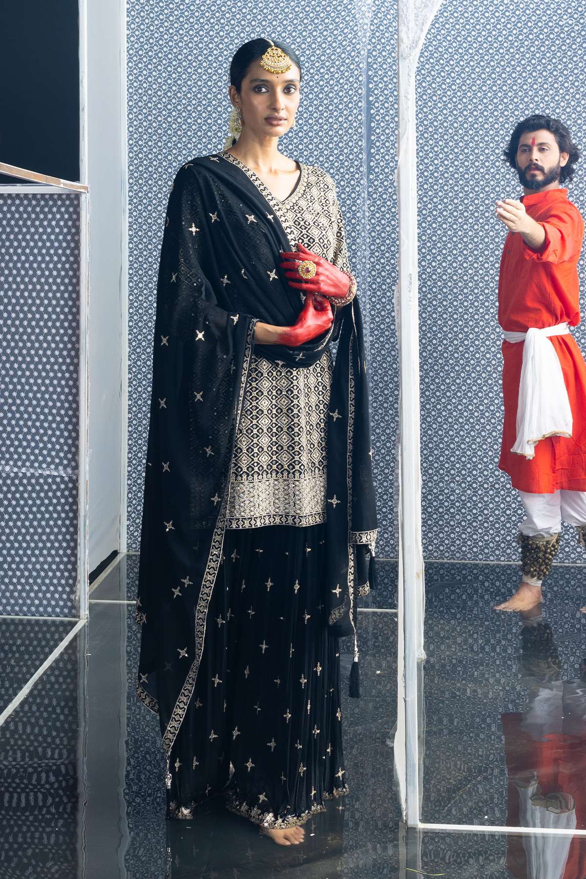 Black zari embroidered short kurta with side slit, paired with sharara pants and adorned with tassels on the dupatta. featuring intricate hand embroidery and a round neckline, this ensemble combines traditional elegance with contemporary style, perfect for festive occasions.