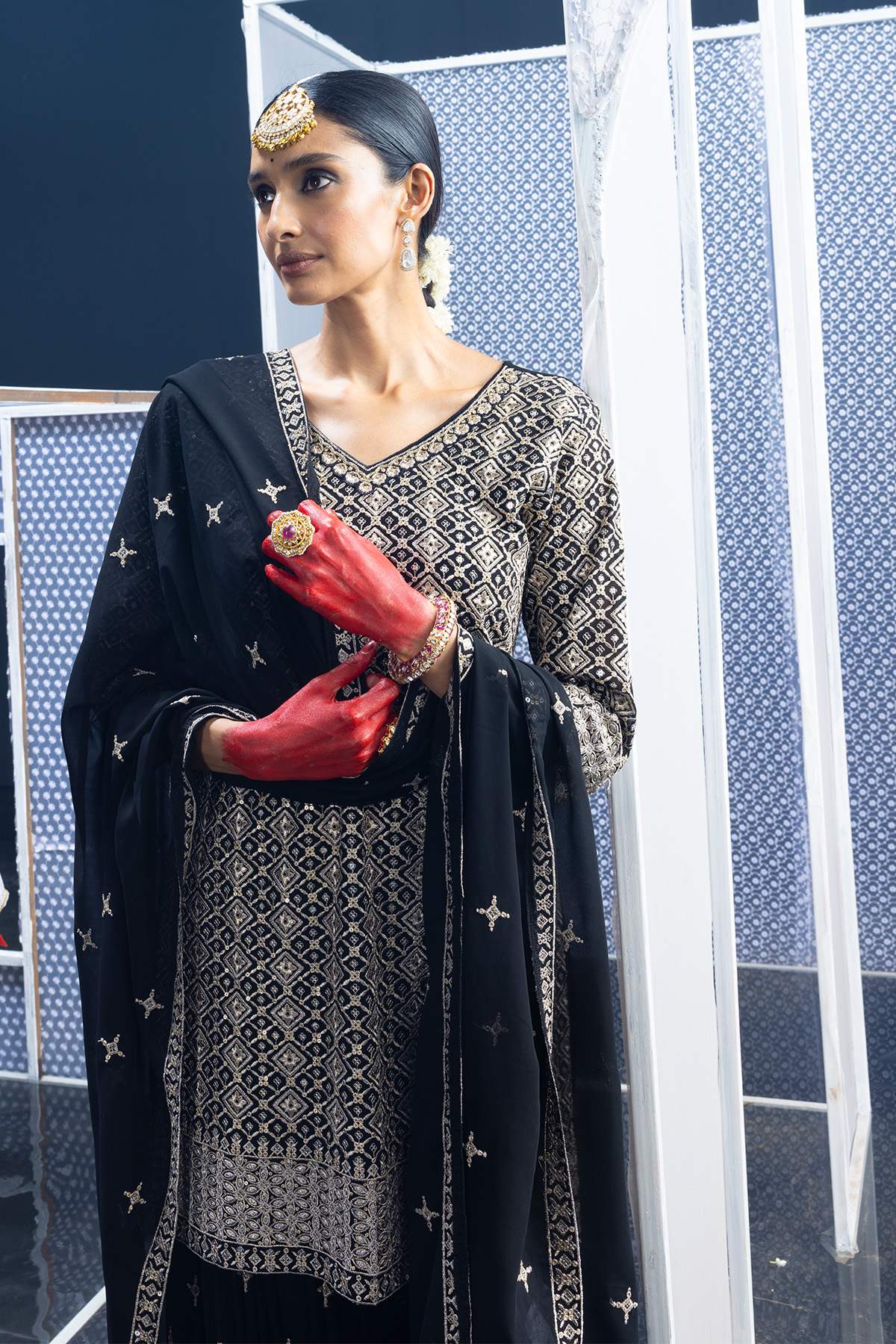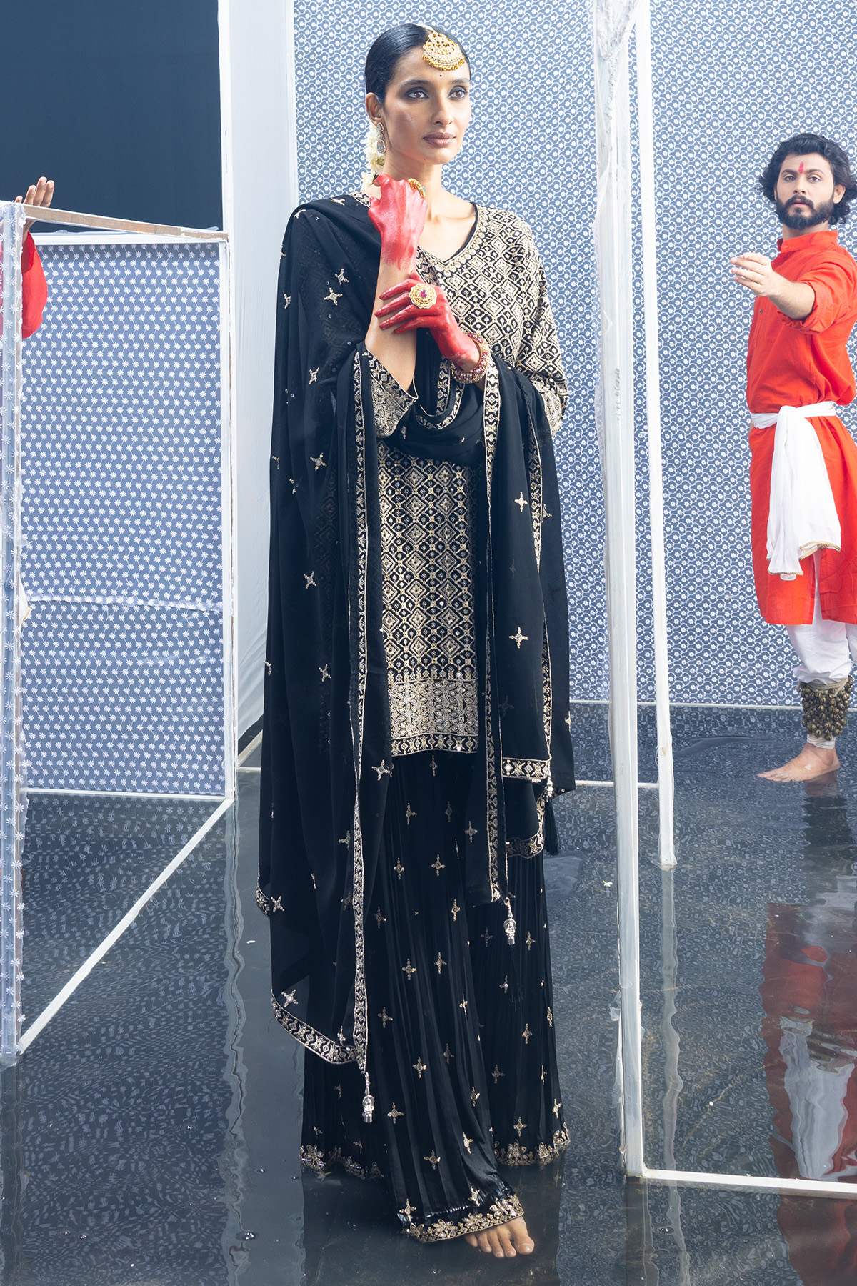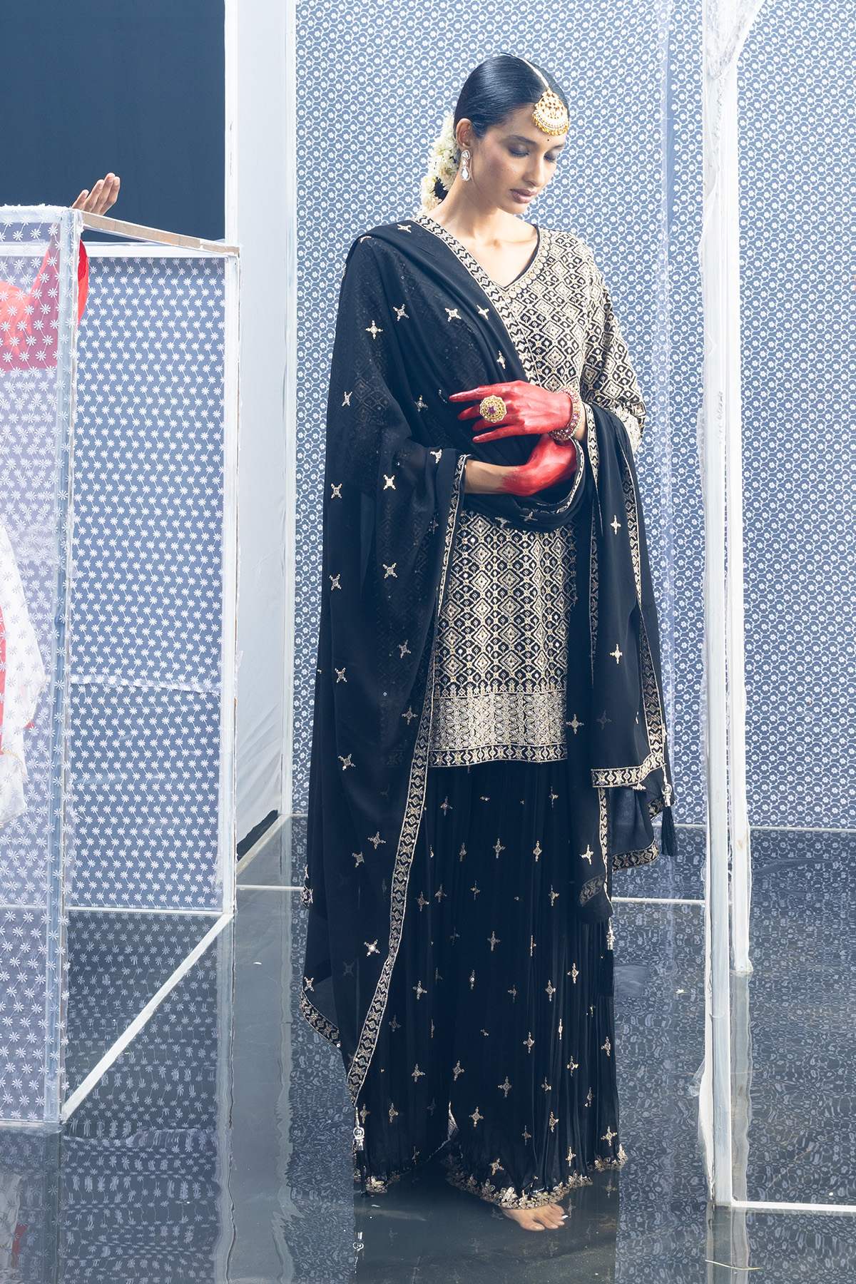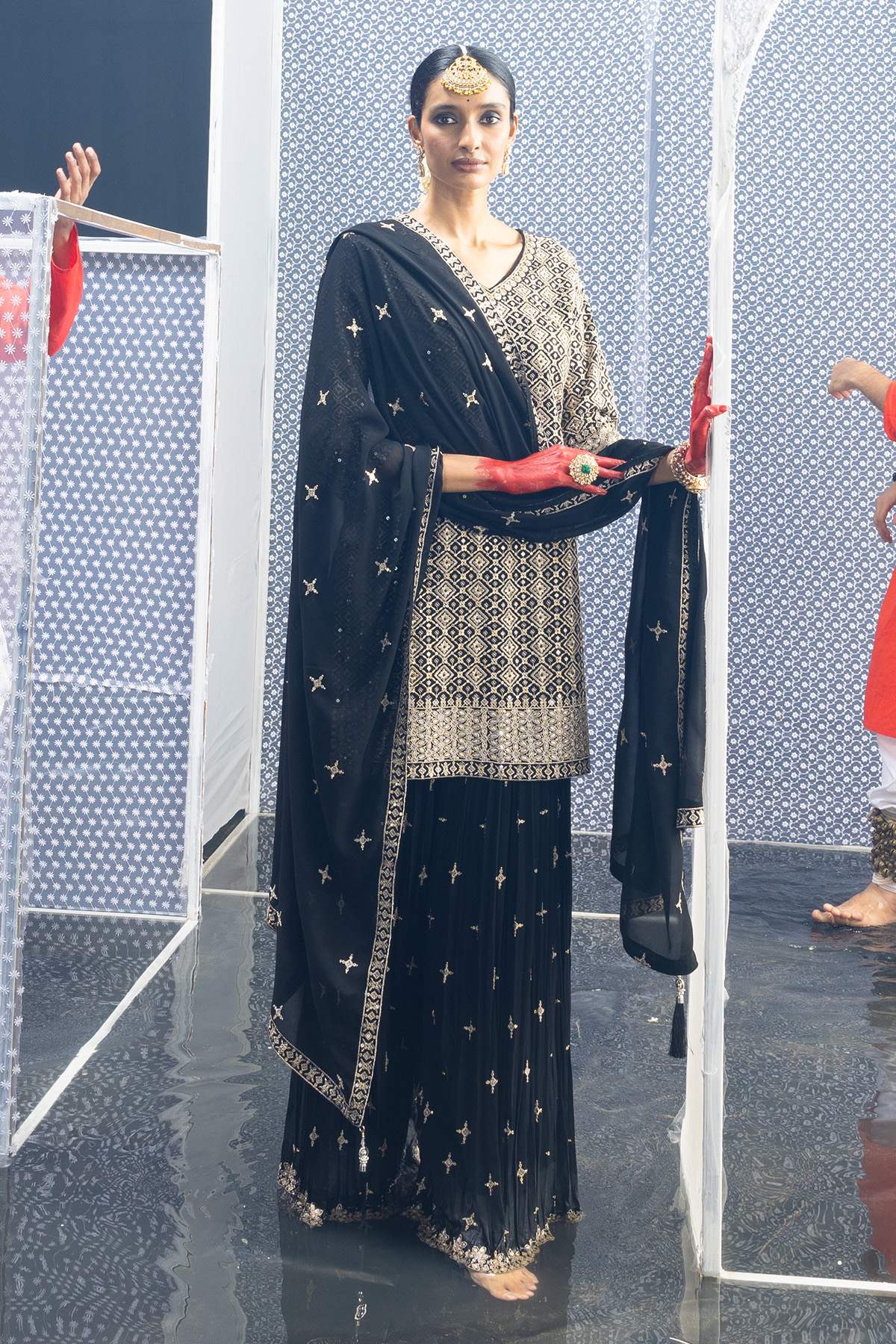 Black zari embroidered short kurta with side slit, paired with sharara pants and adorned with tassels on the dupatta. featuring intricate hand embroidery and a round neckline, this ensemble combines traditional elegance with contemporary style, perfect for festive occasions.