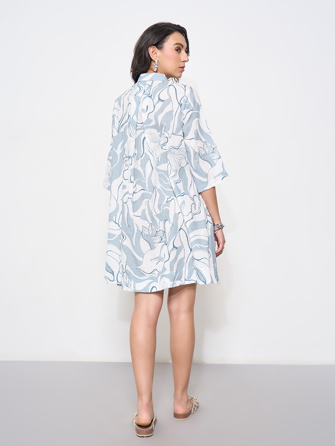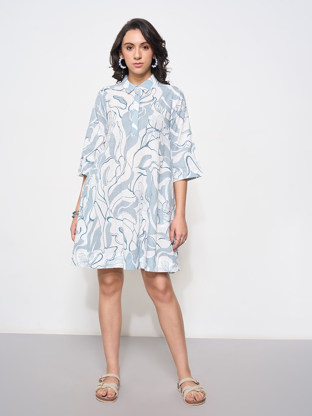Unfolding an easy rhythm of print and motion, this shirt dress fuses structure with breezy modernity. Detailed with a collared neckline, half button placket and relaxed A-line fit, it showcases fluid abstract motifs in soft blue tones. The lightweight woven fabric lends a graceful drape and serene appeal.