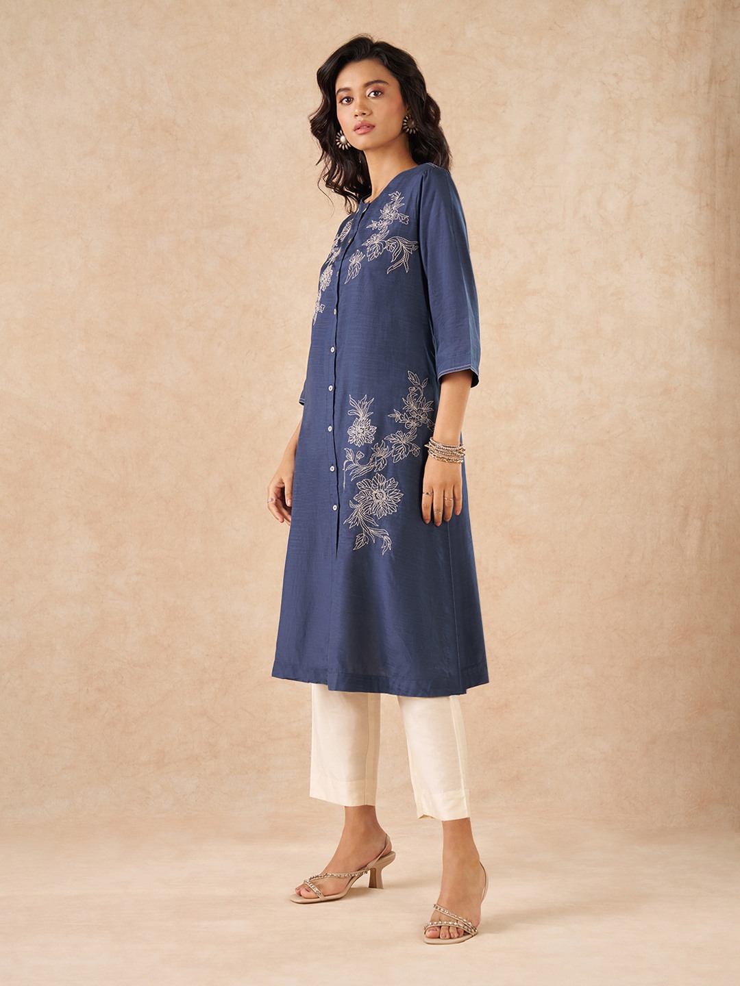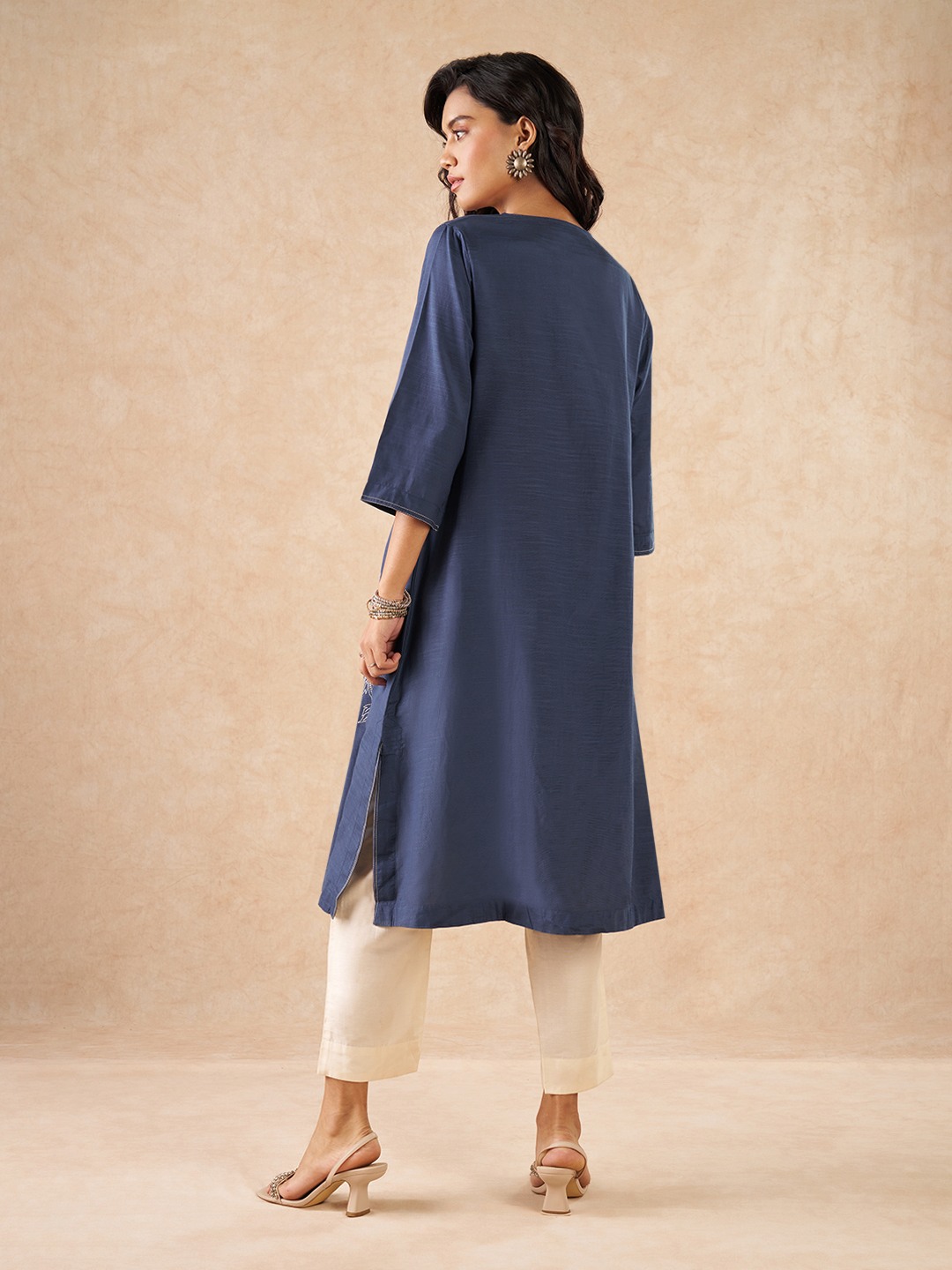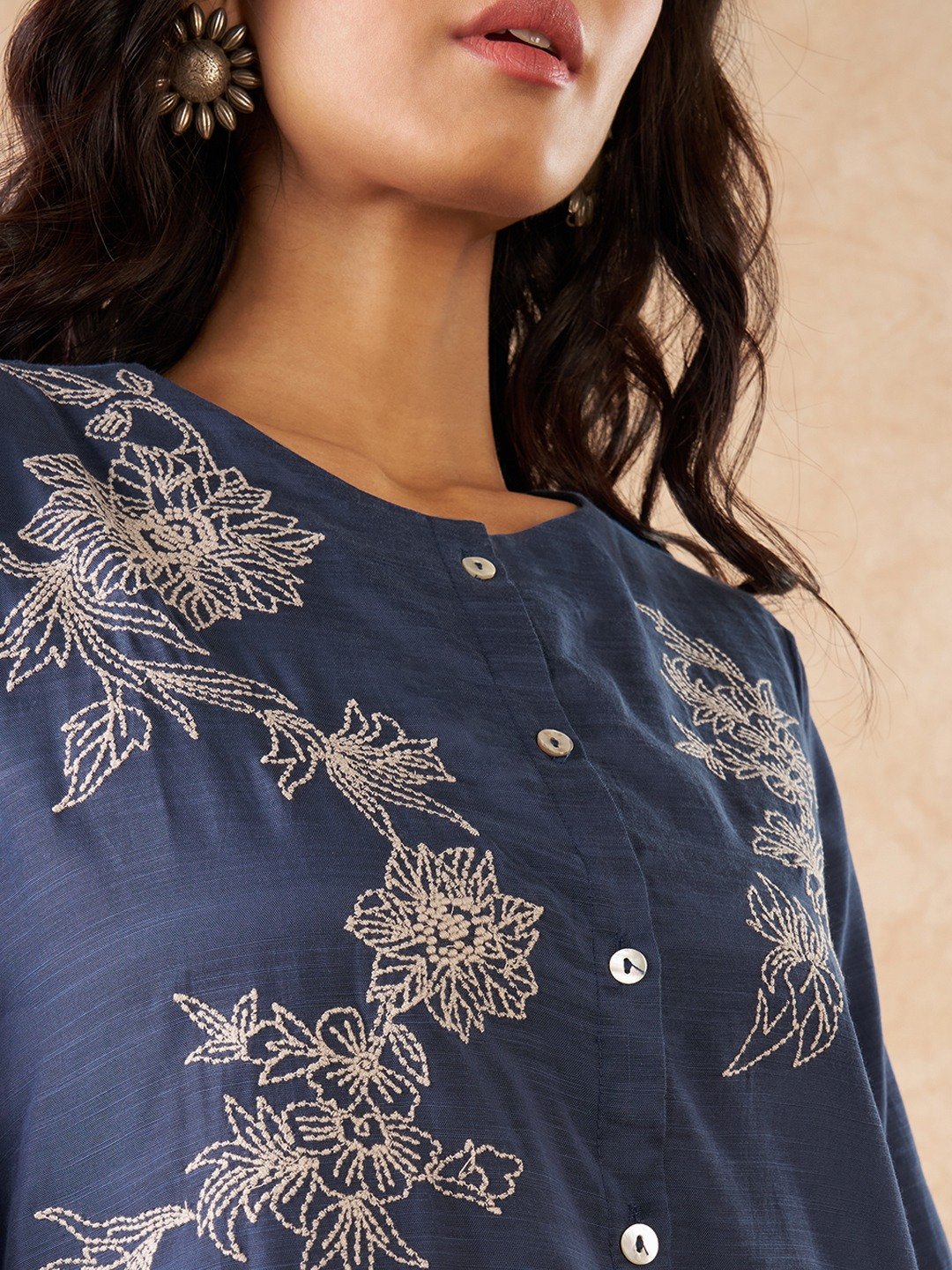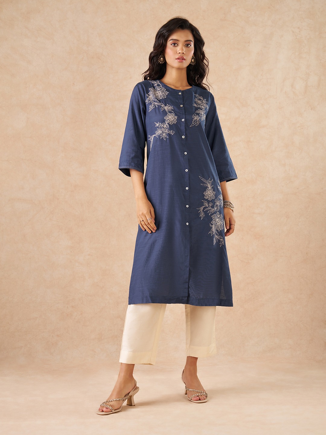 This elevated kurta is from our Down To Earth collection. Featuring bold, confident prints on sustainably crafted Ecovera Shantung with a softly textured sheen, the collection balances striking colour contrasts with delicate embroidered accents, expressing grounded elegance through thoughtful design, modern versatility, and conscious sophistication. Designed in a straight silhouette, this kurta features a round neckline with a buttoned placket, 3/4 sleeves and placement floral embroidery across the front, crafted in breathable cotton-viscose for a polished yet easy drape.