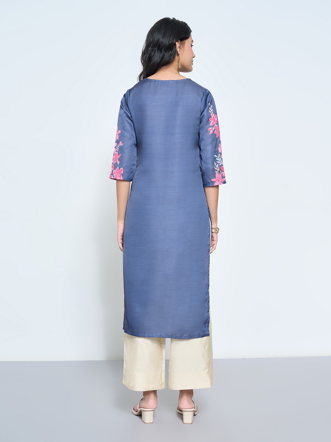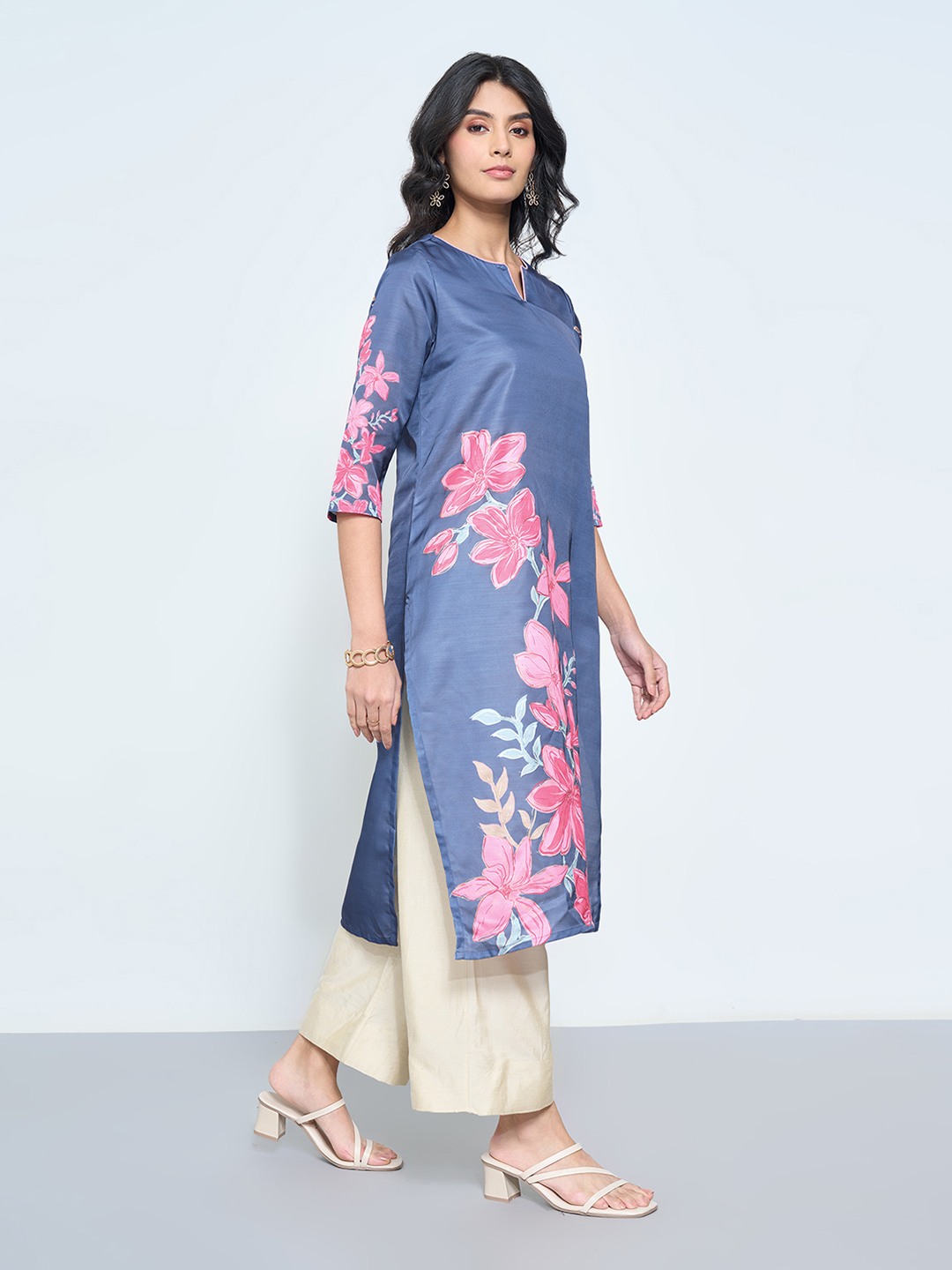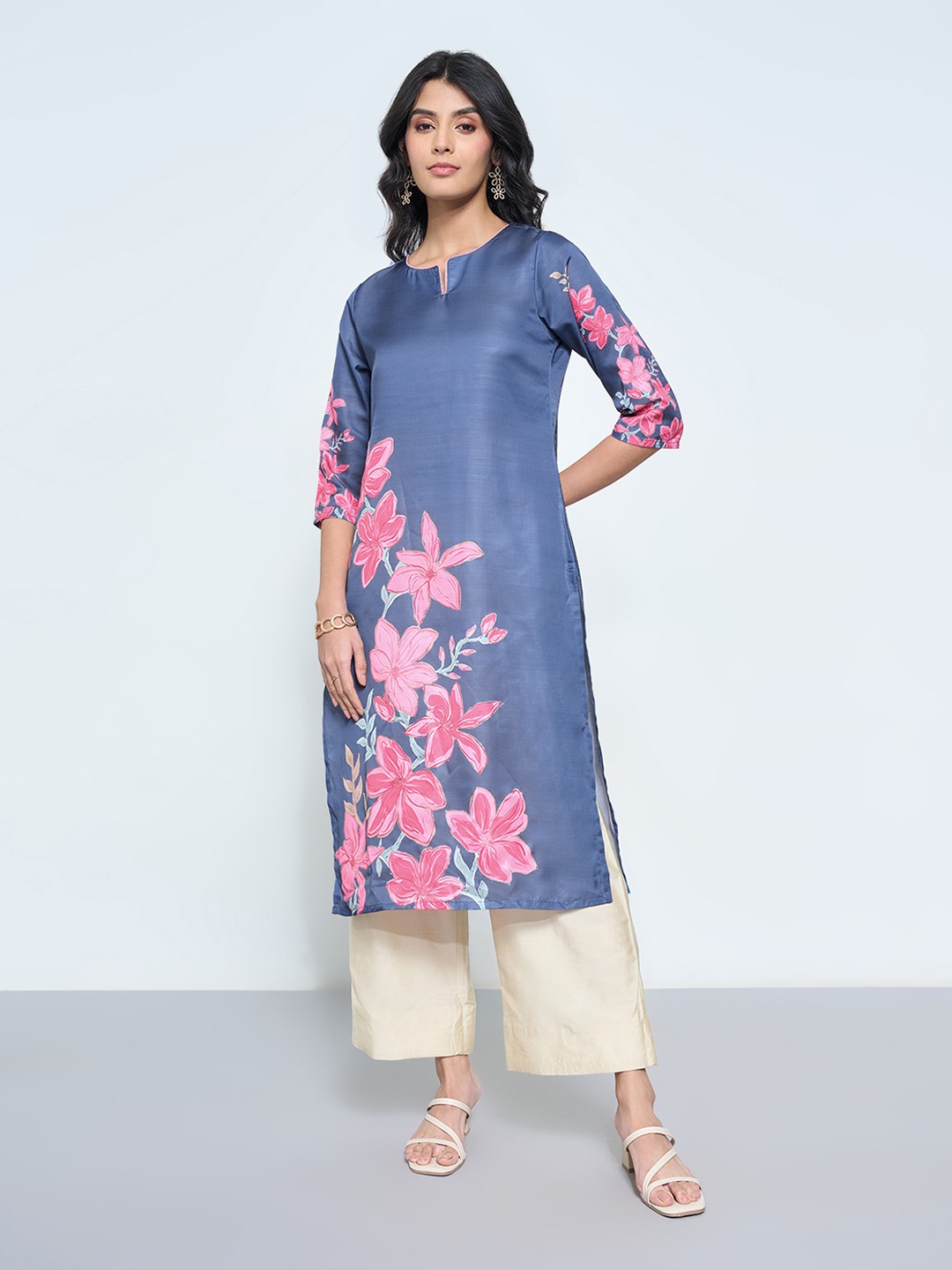 Fresh and luminous, this kurta blooms with placement florals in soft tones. The sleek silhouette is finished with a round V-neckline, 3/4 sleeves and a subtly lustrous surface that lends a refined festive glow. Its minimal shape allows the bold florals to take centre stage.