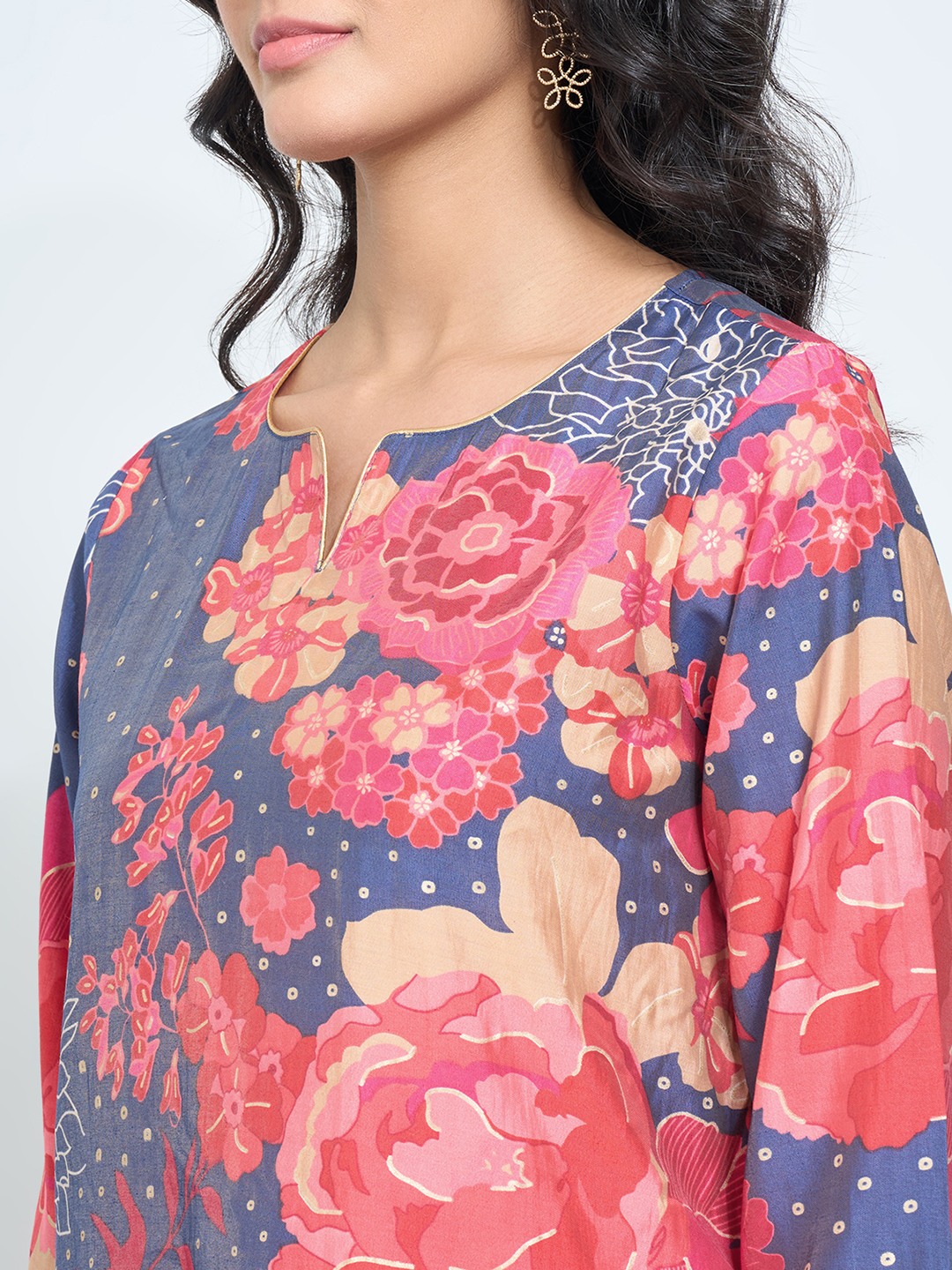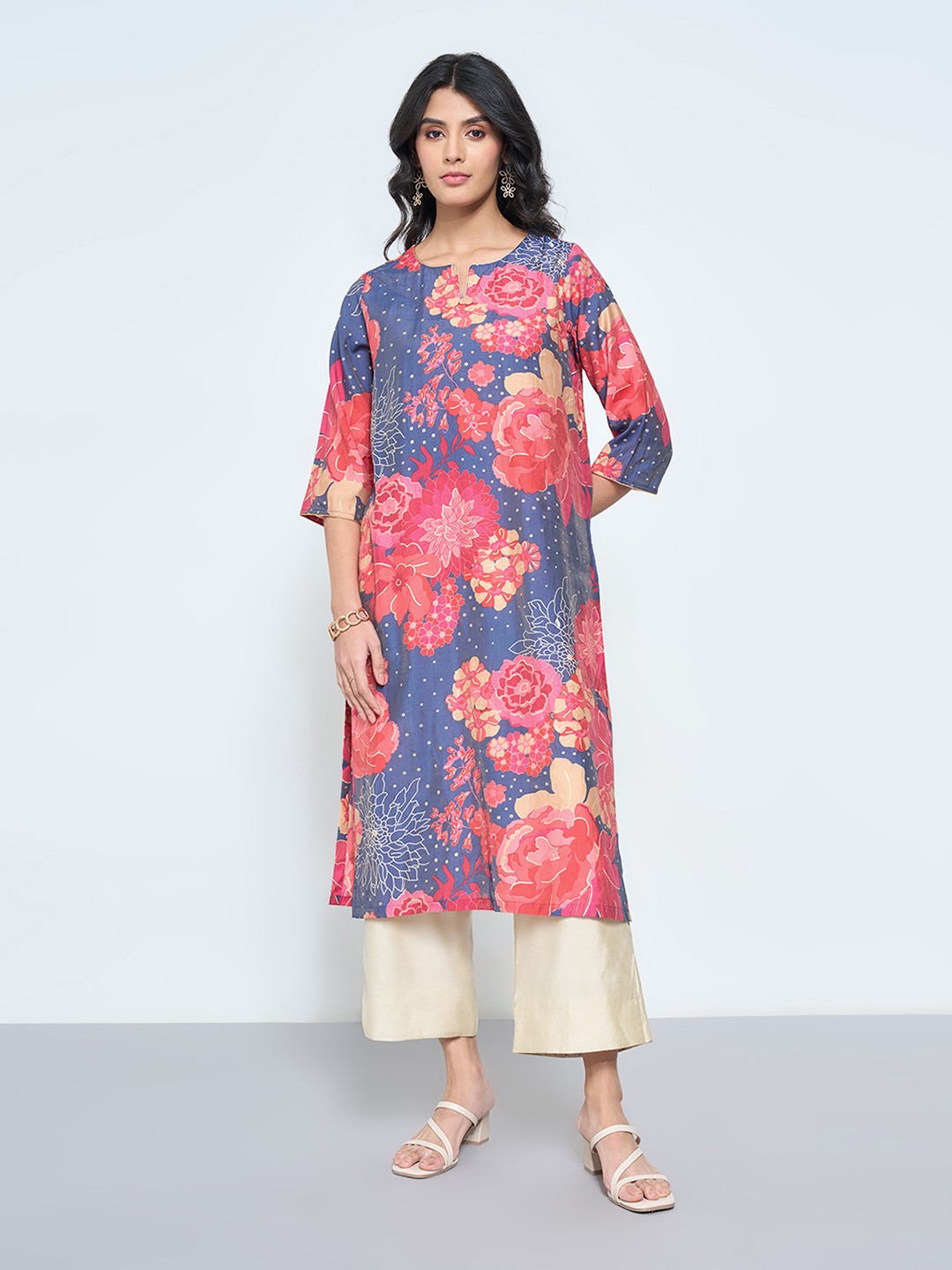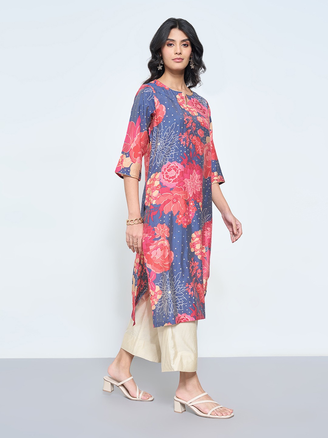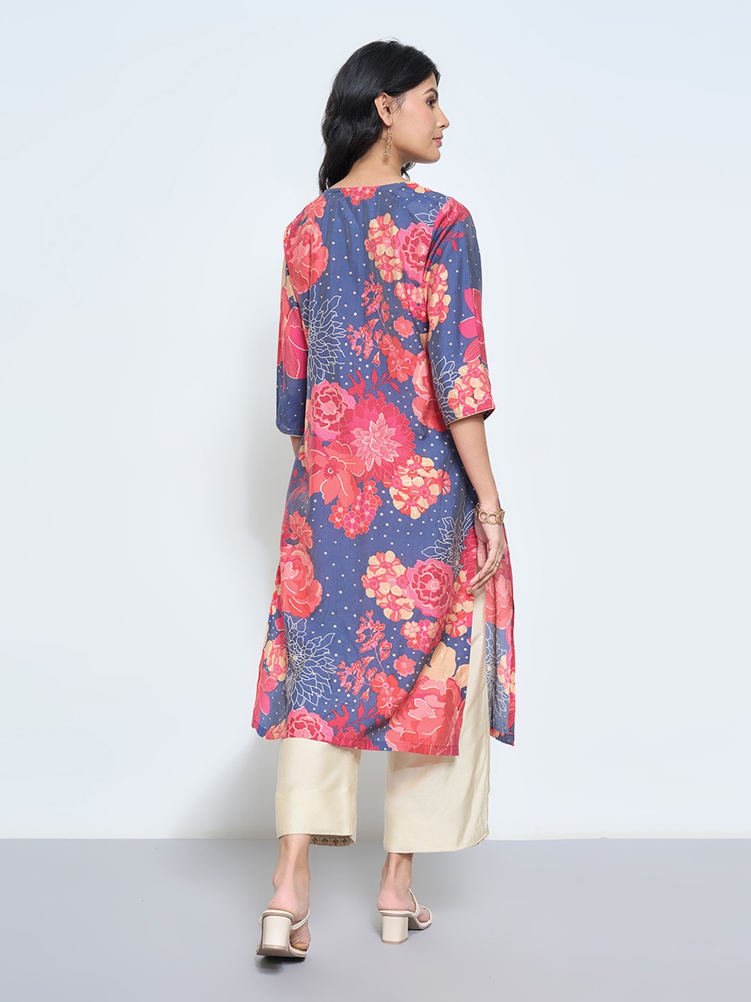 A burst of coral florals brings a vivid flourish to this festive kurta. Cut in a contemporary silhouette, it’s detailed with a round slit neckline, 3/4 sleeves, and a lustrous base that catches the light beautifully. The interplay of soft sheen and saturated hues gives it a refined yet lively presence.
