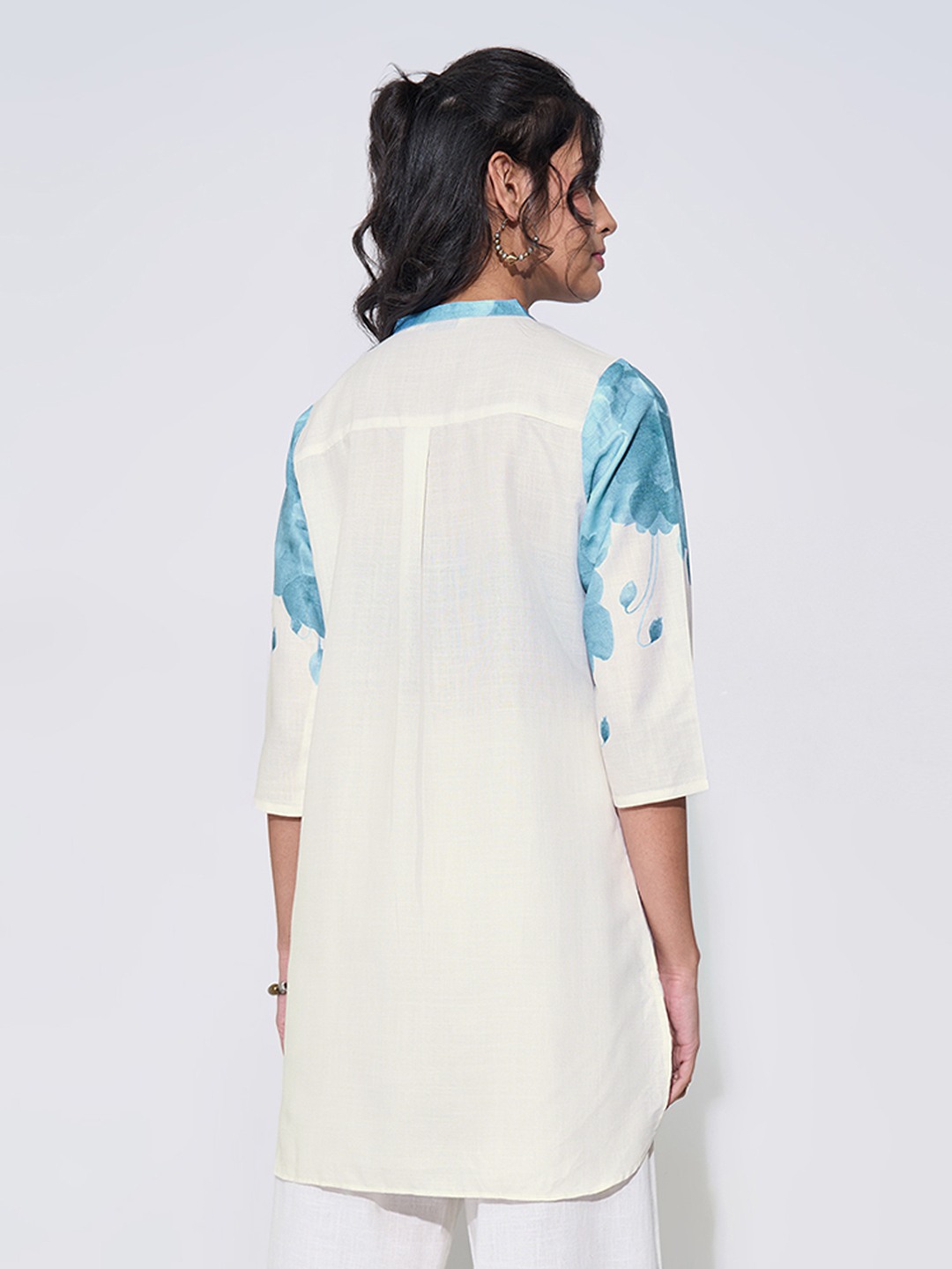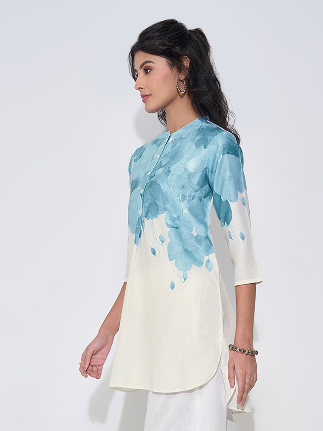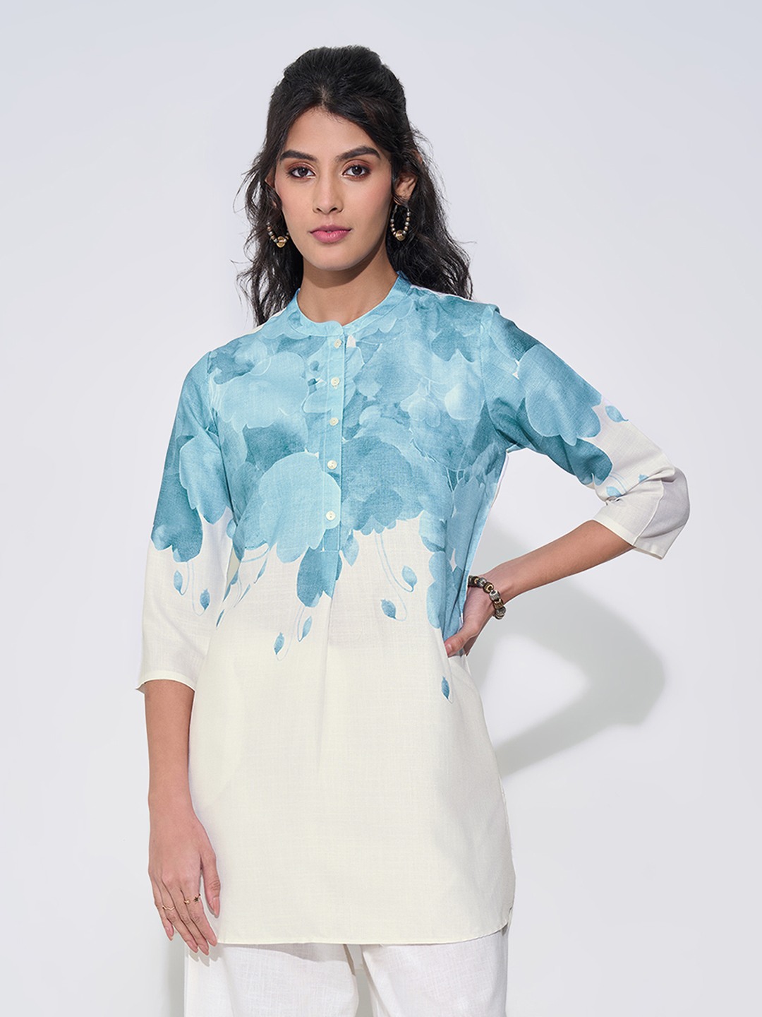 Refreshing and graceful, this tunic brings together a crisp white base with painterly blue floral accents. Designed with a mandarin collar, half placket of buttons, and 3/4 sleeves, it falls to a straight hem for an effortless drape. Crafted in a breathable woven fabric, it makes a perfect blend of polish and ease.