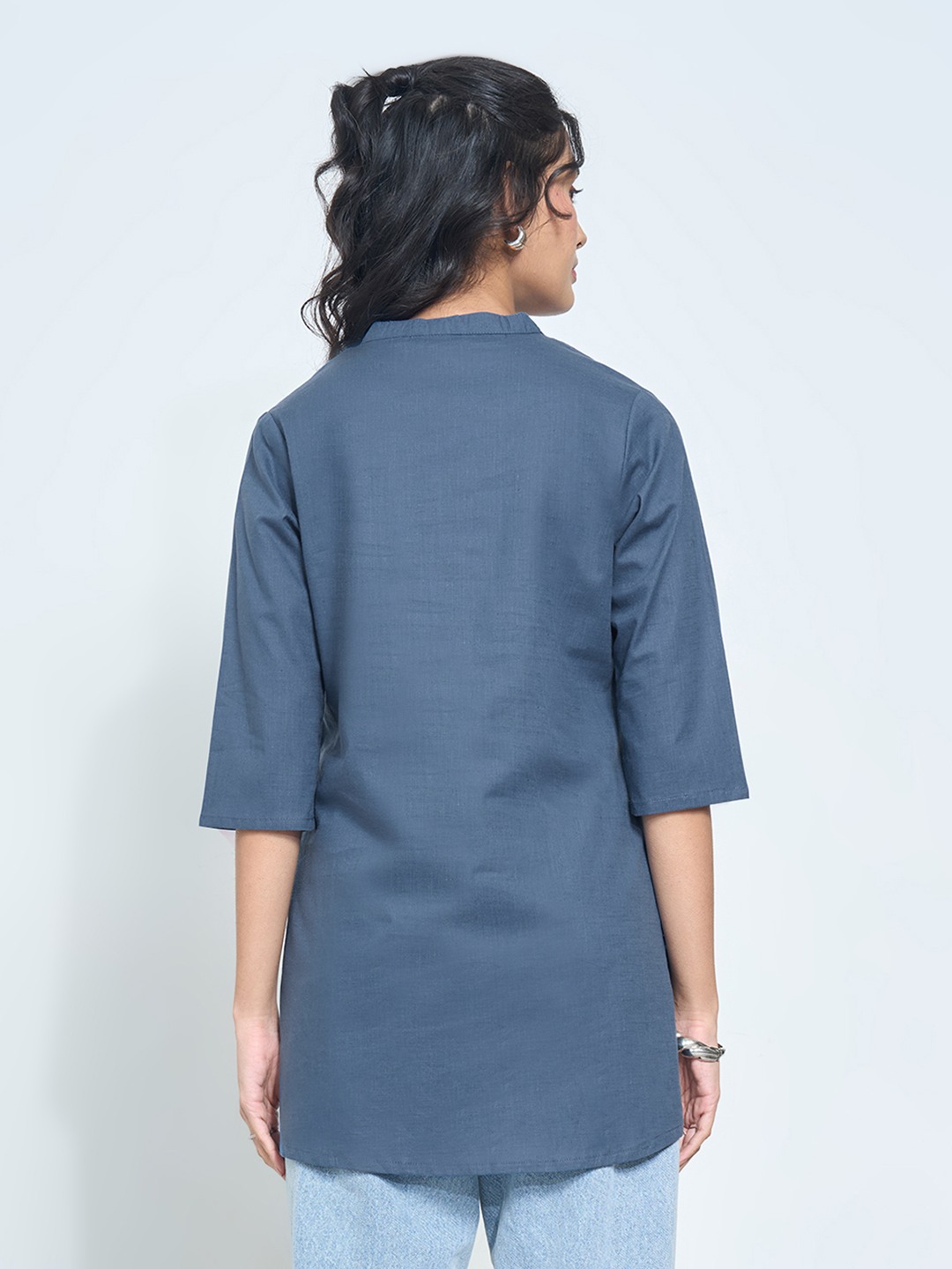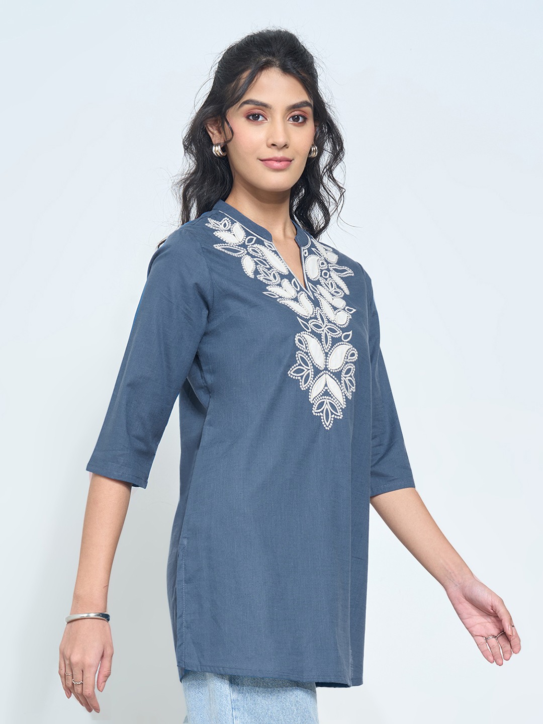 Modern and minimal, this tunic is accentuated with intricate embroidery along the neckline. It features a banded split neck, 3/4 sleeves and a relaxed fit that offers effortless ease. The clean silhouette and soft fabric make it a versatile everyday essential.
