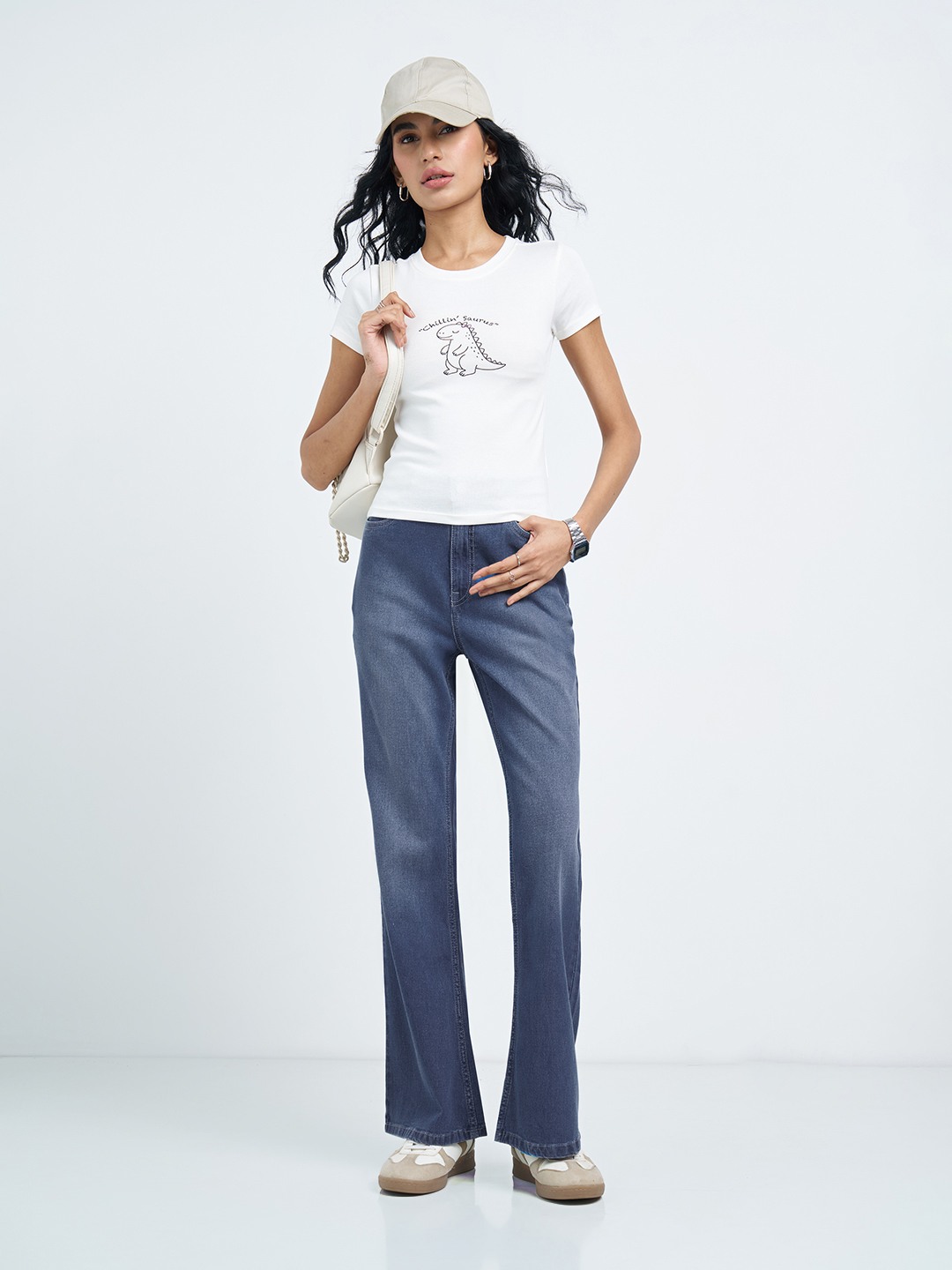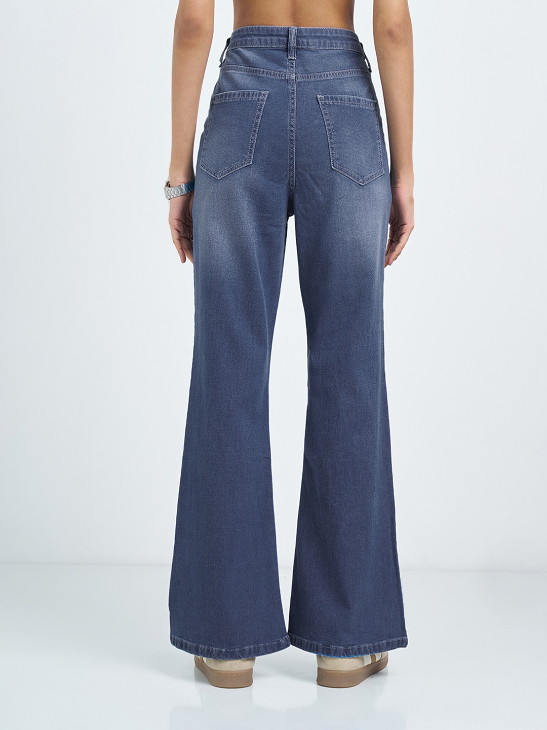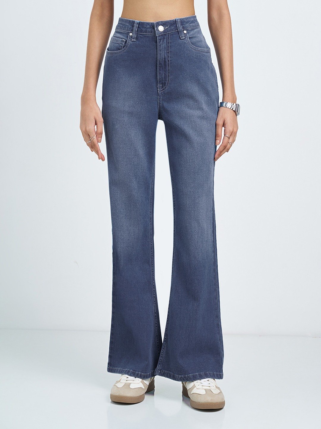 Long lines, clean attitude. High-rise bootcut silhouette with classic five-pocket construction, zip fly and a soft faded mid-wash that adds depth without distress. Structured denim skims the leg before opening into a subtle, balanced flare.