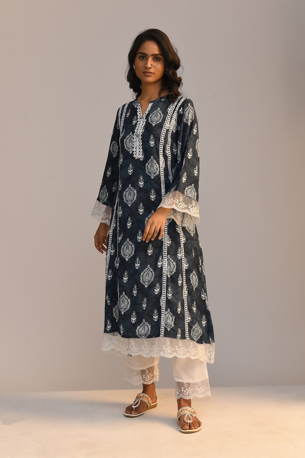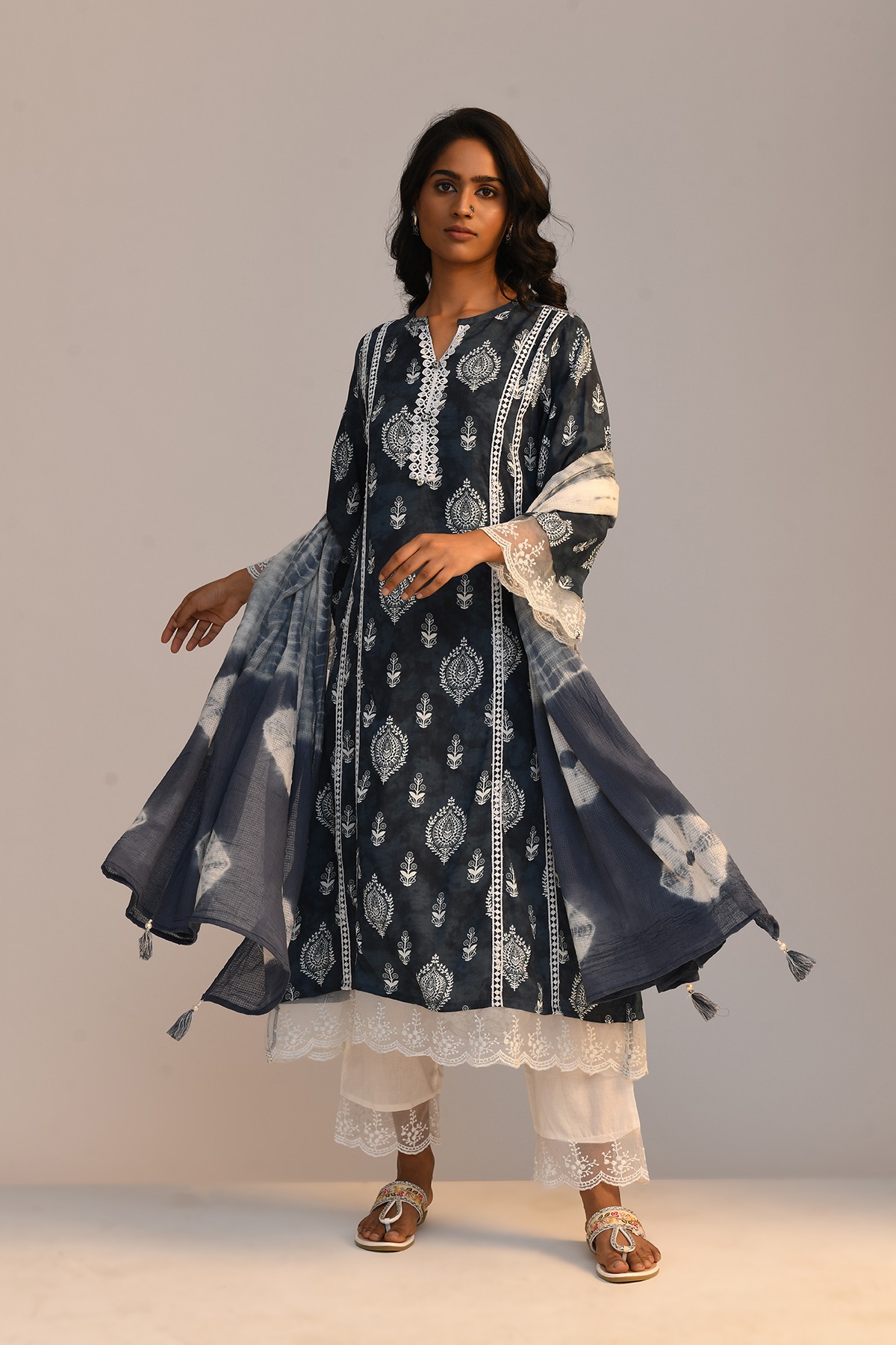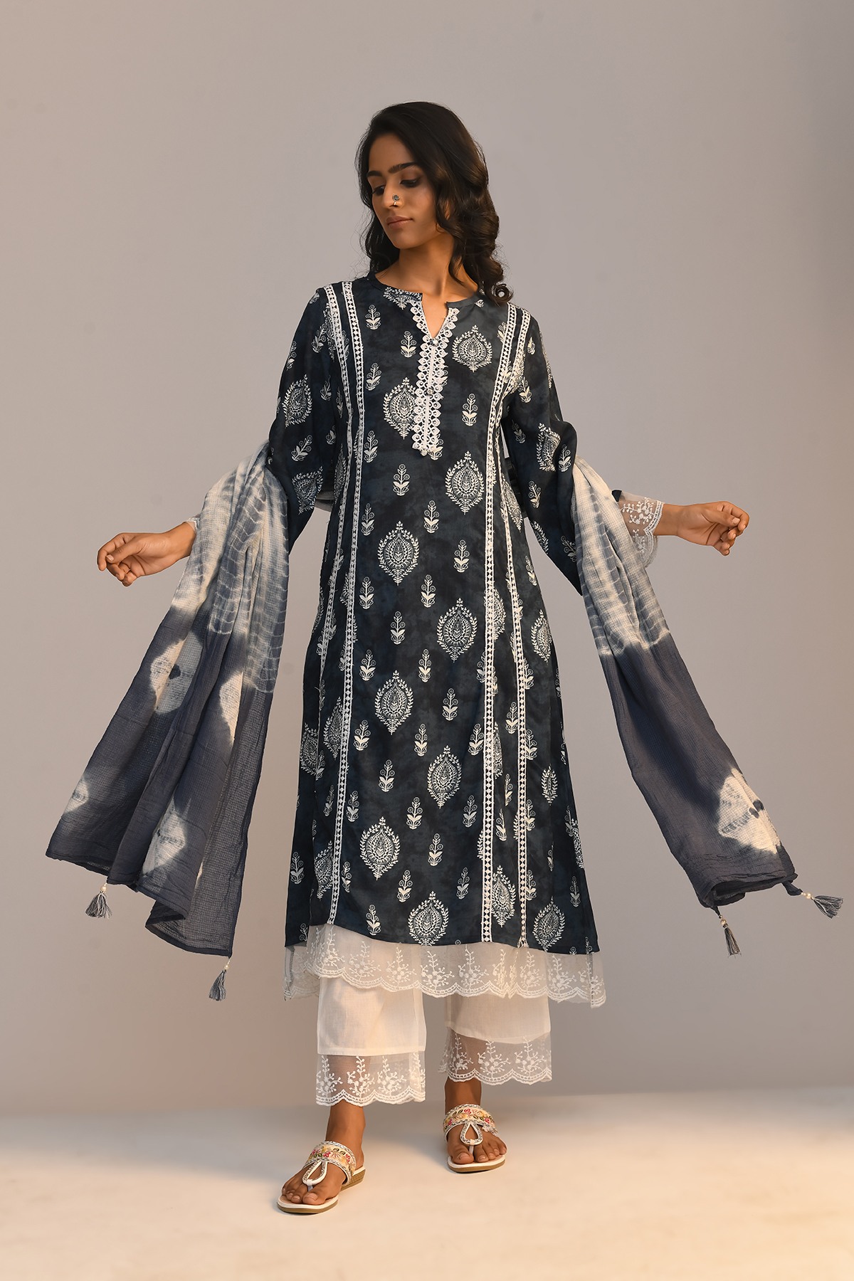 Elevate your style with this blue printed kurta set. the mandarin collar, long sleeves, and A-line hemline bring a flattering silhouette, while lacework adds a touch of elegance. paired with pants and a dupatta, it's perfect for any occasion.