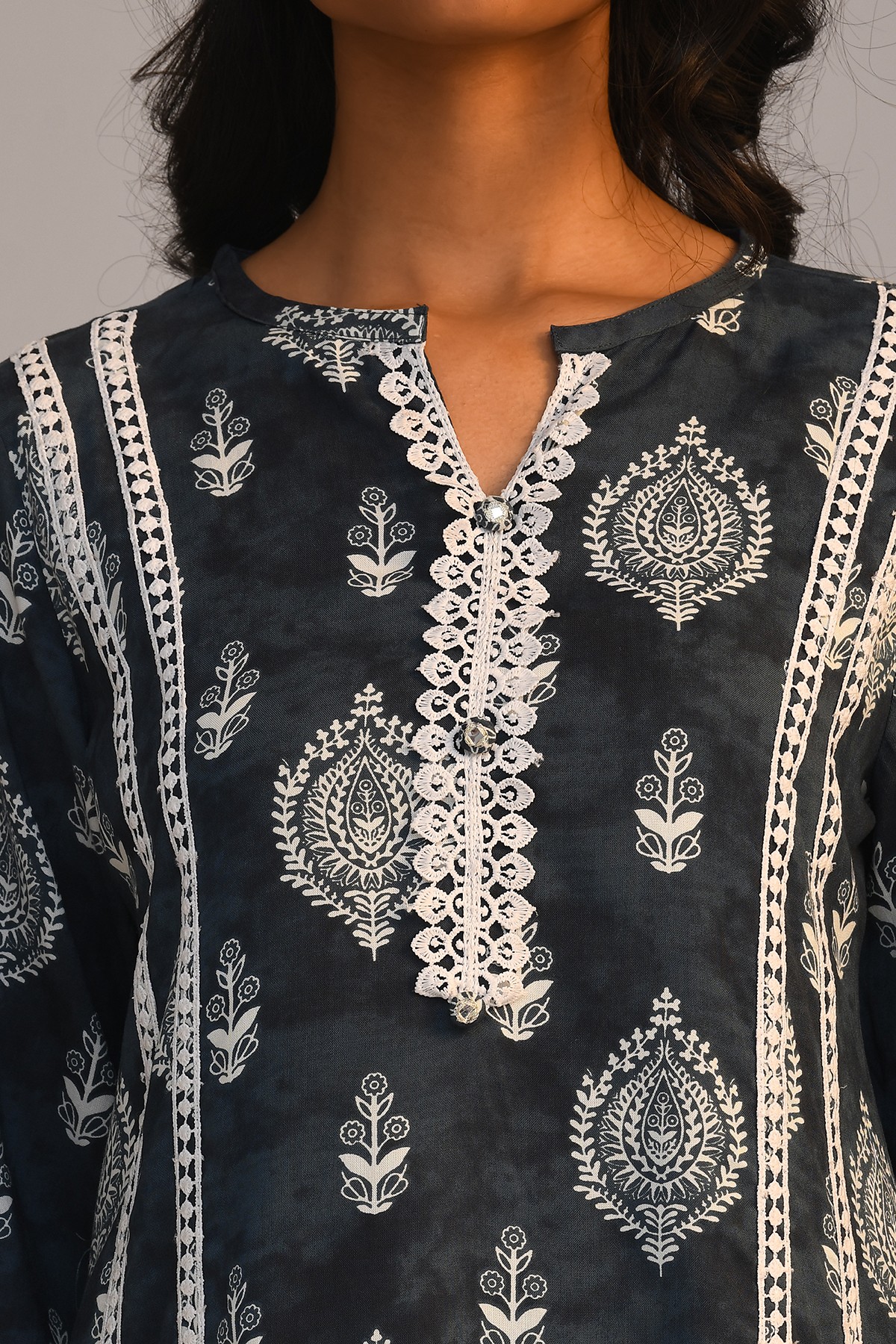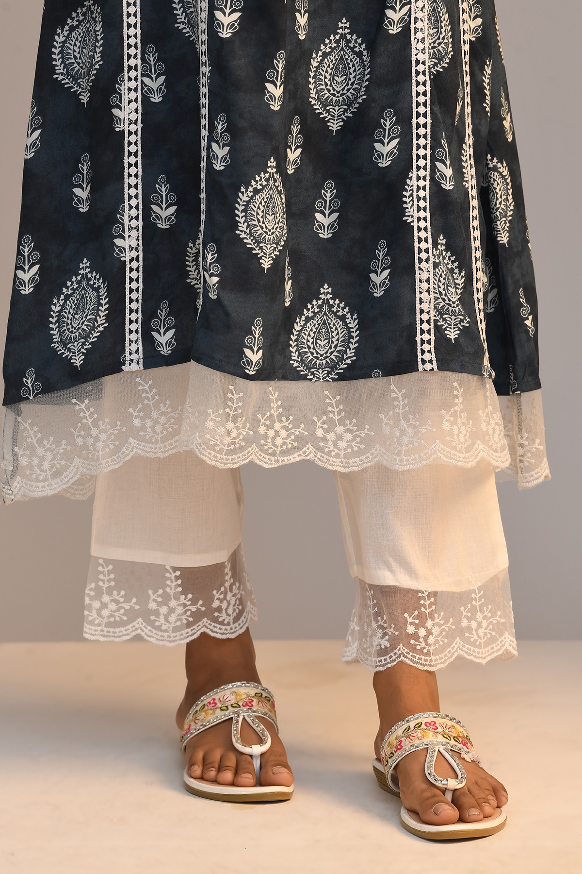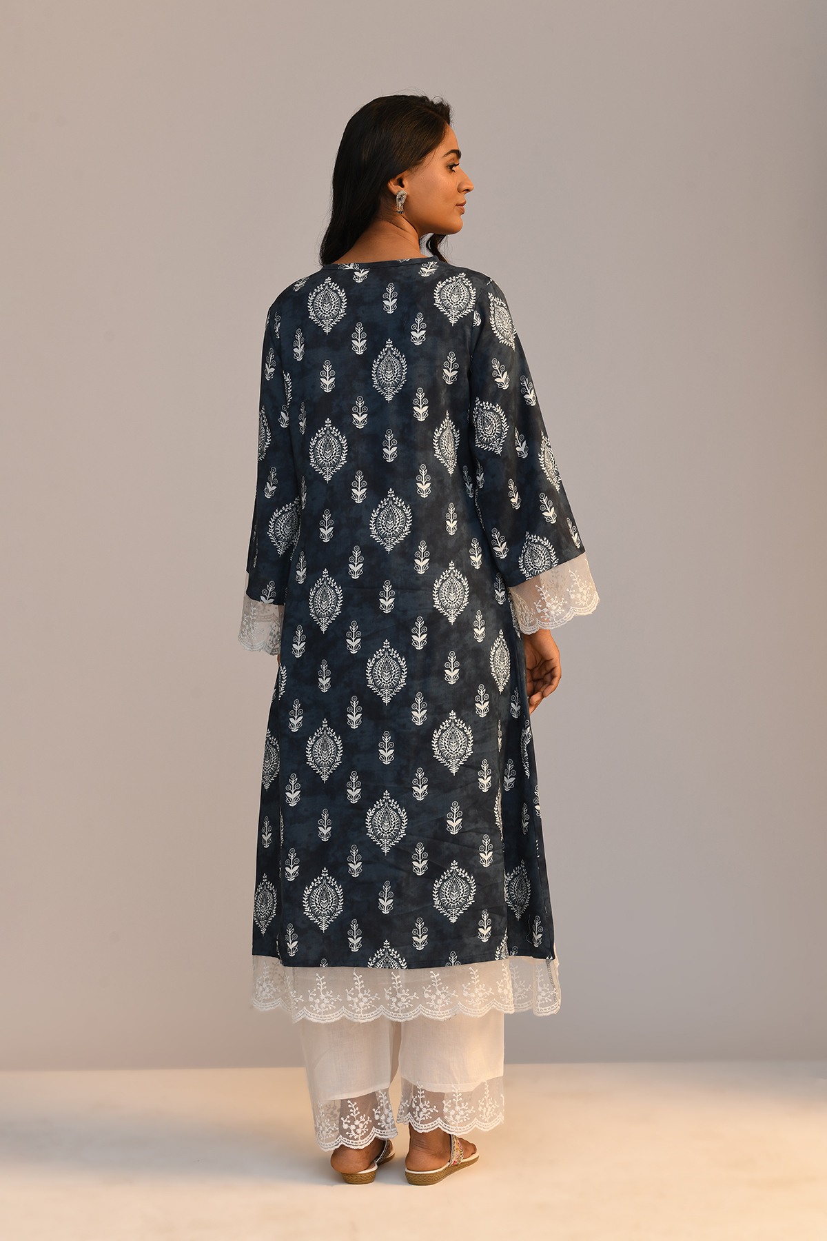 Elevate your style with this blue printed kurta set. the mandarin collar, long sleeves, and A-line hemline bring a flattering silhouette, while lacework adds a touch of elegance. paired with pants and a dupatta, it's perfect for any occasion.
