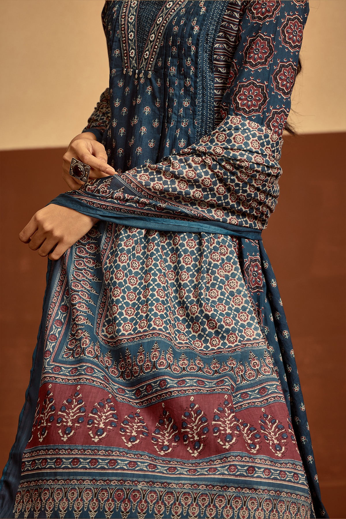 A chic blue printed kurta set featuring a v-neckline, three-quarter sleeves, and a flared hemline. The matching pant and dupatta complete the look, making it perfect for festive occasions or semi-formal gatherings. Stylish, elegant, and versatile.