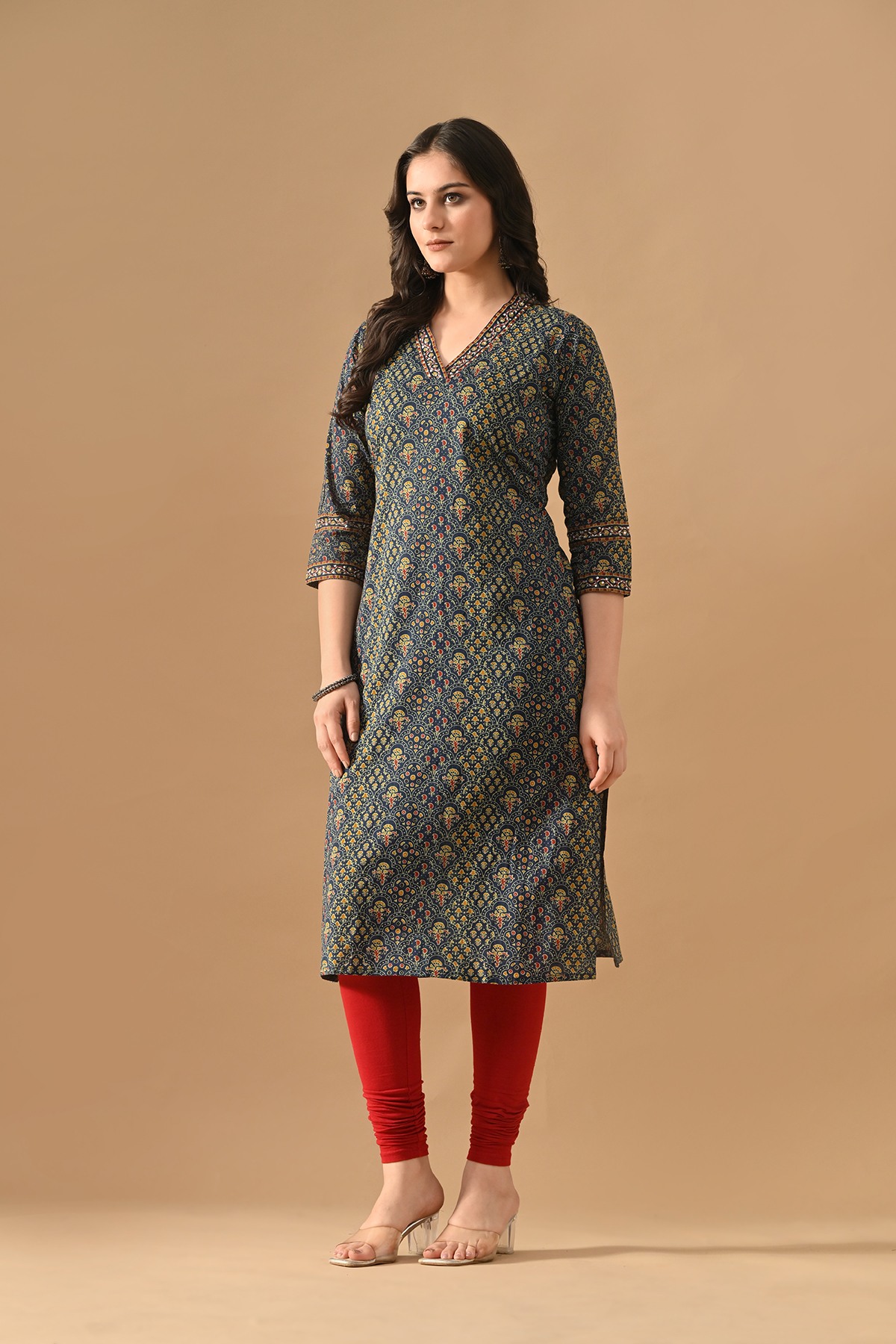 Embrace effortless style with this blue floral-printed kurta featuring v-neck, three-quarter sleeves, a straight hemline, and side slits, it offers a perfect balance of elegance and comfort for casual outings or daily wear.