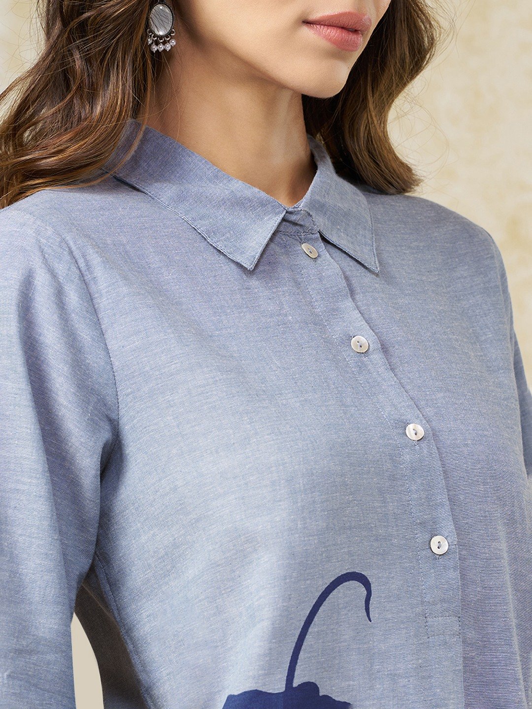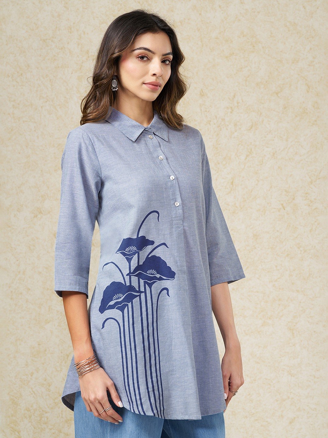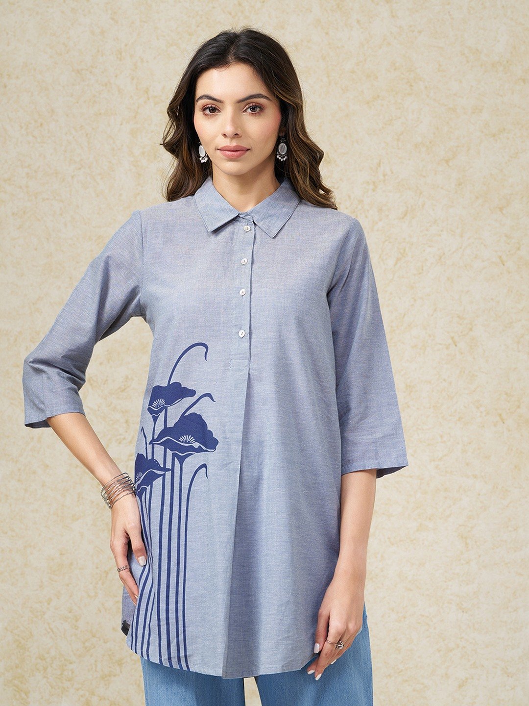 Graphic placement gives this tunic a clean, contemporary edge with a hint of artistry. Designed with a classic collar and a half placket, it features 3/4 sleeves and a bold vertical floral motif that elongates the silhouette while keeping the look refined. The relaxed structure and crisp detailing make it an easy statement piece.