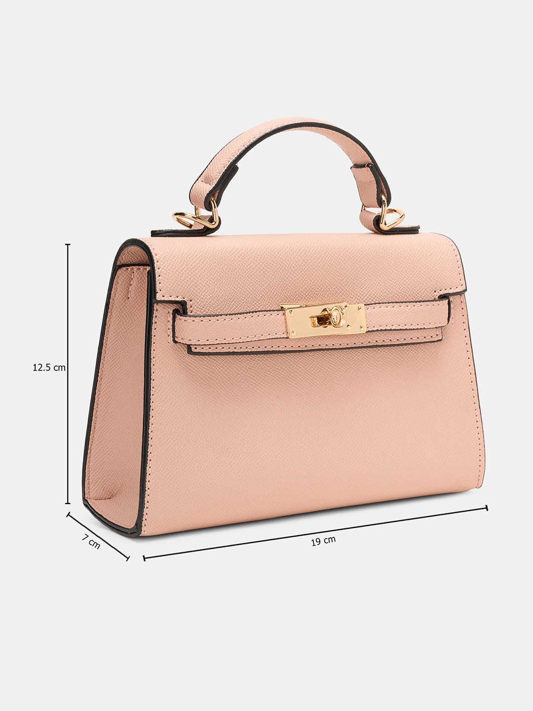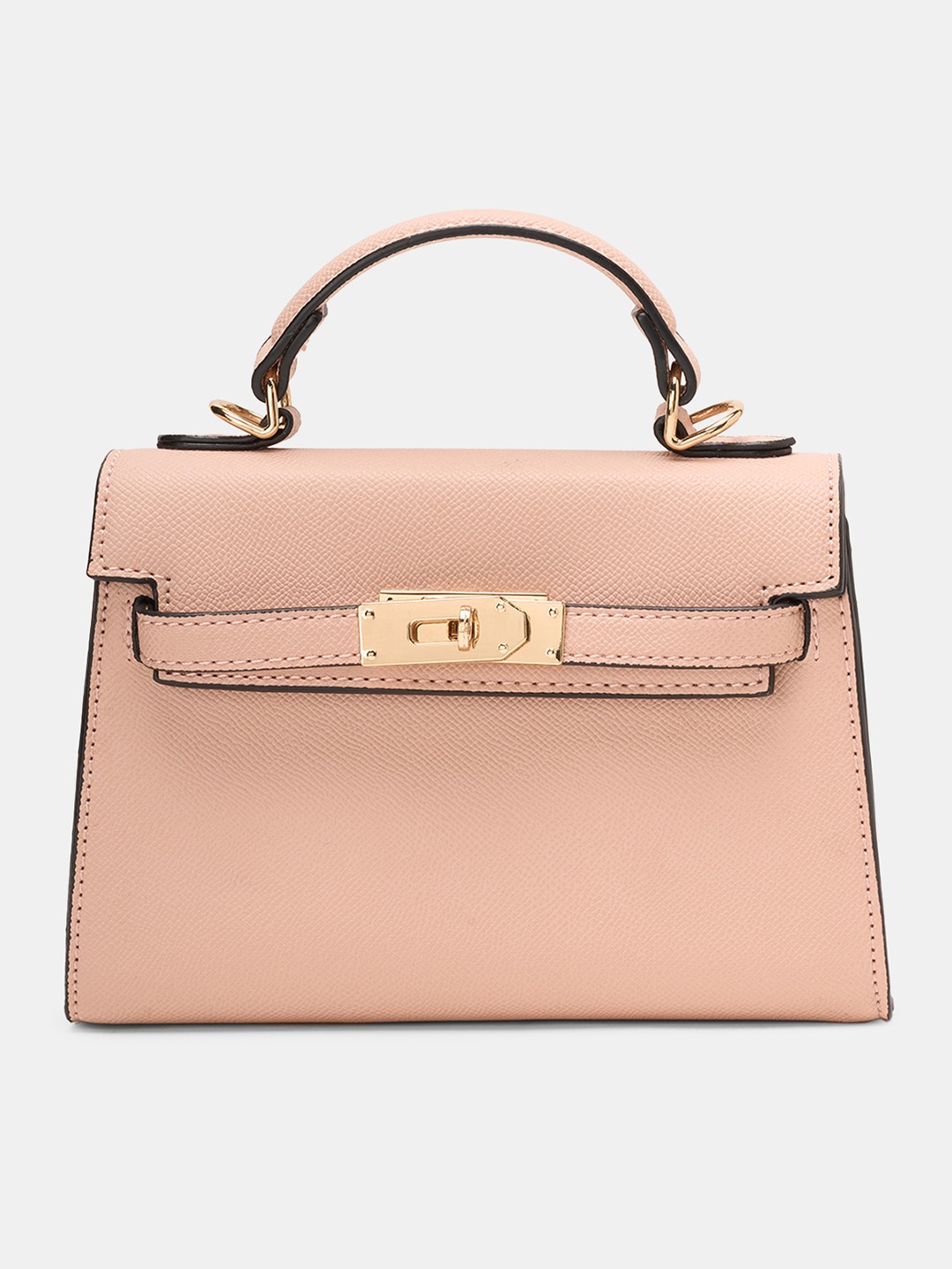 Understated yet refined, this crossbody bag captures timeless sophistication in a soft blush hue. It features a textured faux leather finish, a structured silhouette with a metallic twist-lock closure, and a detachable shoulder strap for versatile wear. Compact yet functional, it’s ideal for carrying essentials with polished ease.