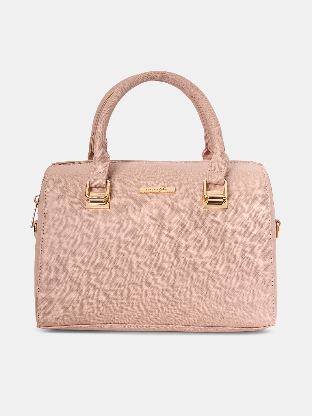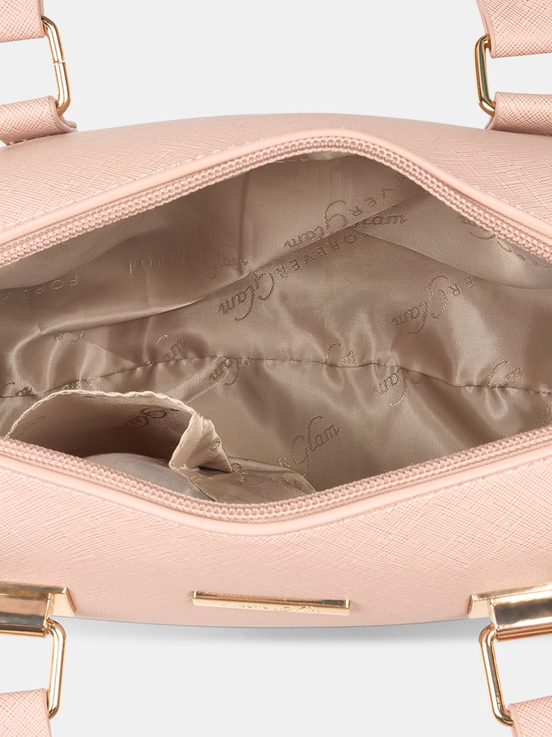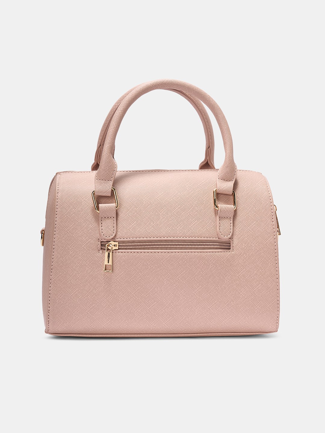 Polished and versatile, this bowling bag lends a refined touch to everyday styling. Designed with a structured silhouette in saffiano texture, twin top handles, and a detachable crossbody strap, it is finished with gold-toned accents. A zip closure and back pocket add to its functional charm.