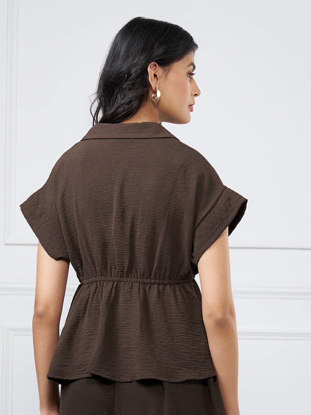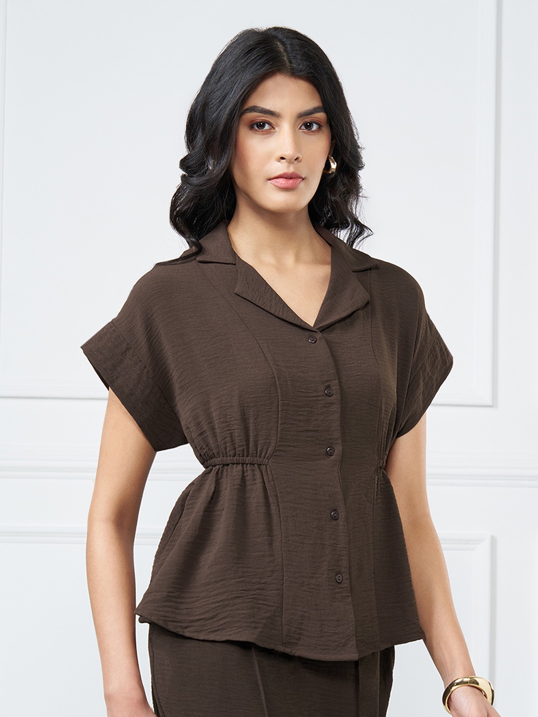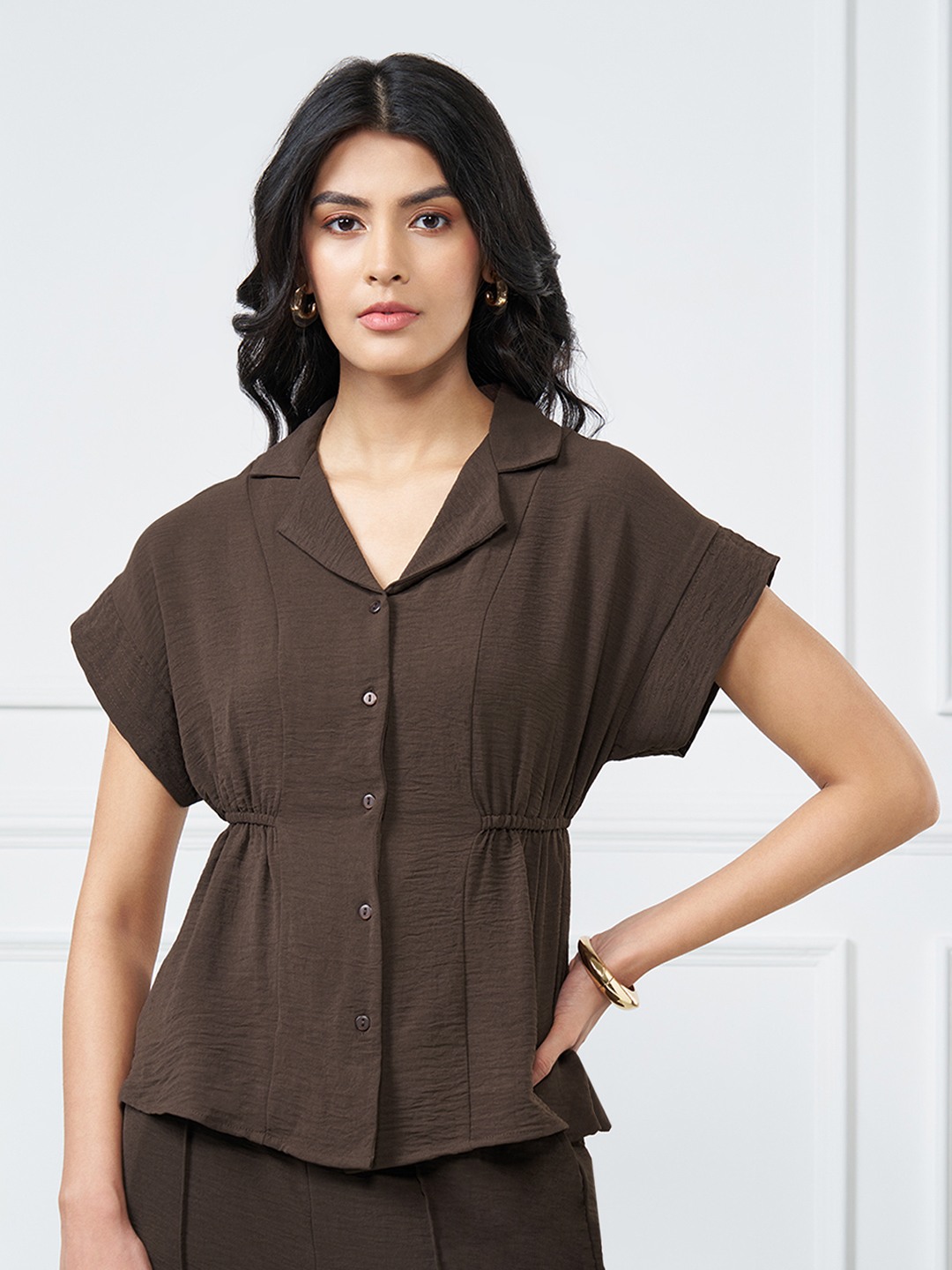 Soft structure, easy attitude. Designed with a collared neckline, button-down front and dolman sleeves, this top features gentle waist ruching that shapes the fit without stiffness. The lightweight crushed-texture fabric stays breathable and comfortable through the day.