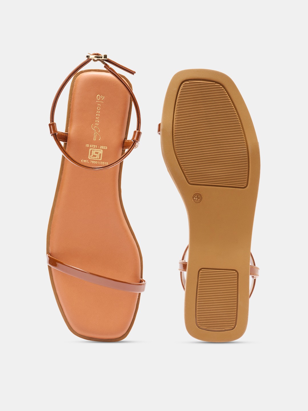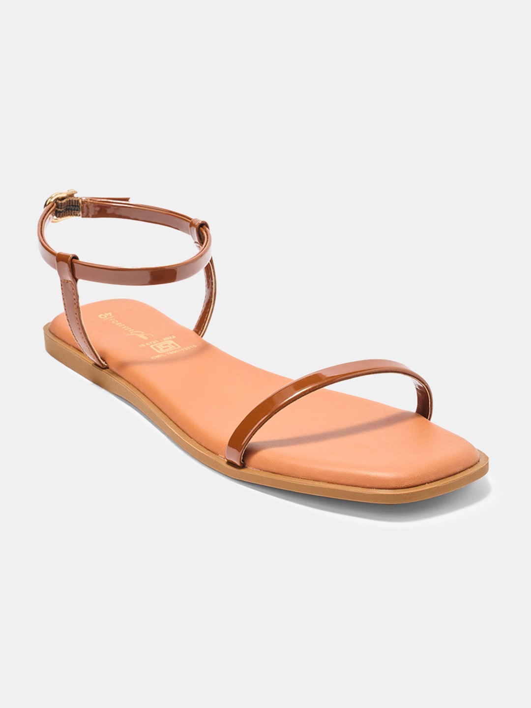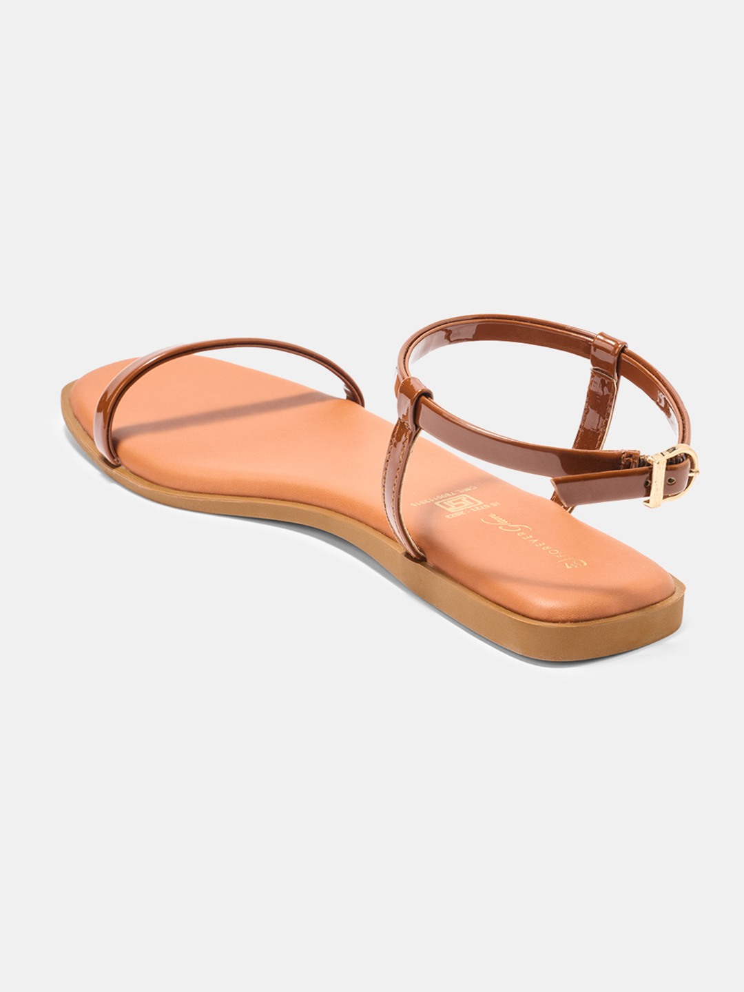 Minimal and chic, these flats feature a square toe with slim patent straps for a modern edge. The ankle buckle fastening ensures a secure fit, while the cushioned sole adds comfort for all-day wear. A sleek design that blends effortlessly into both casual and refined looks.