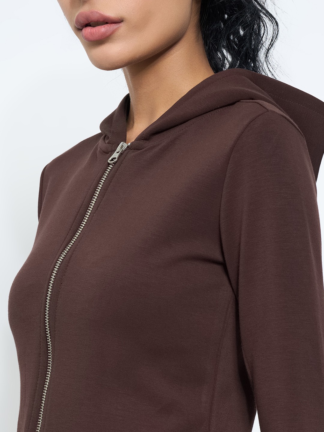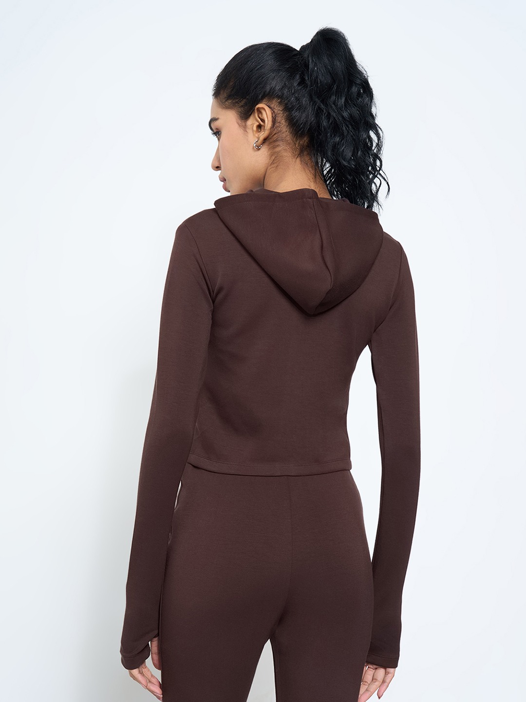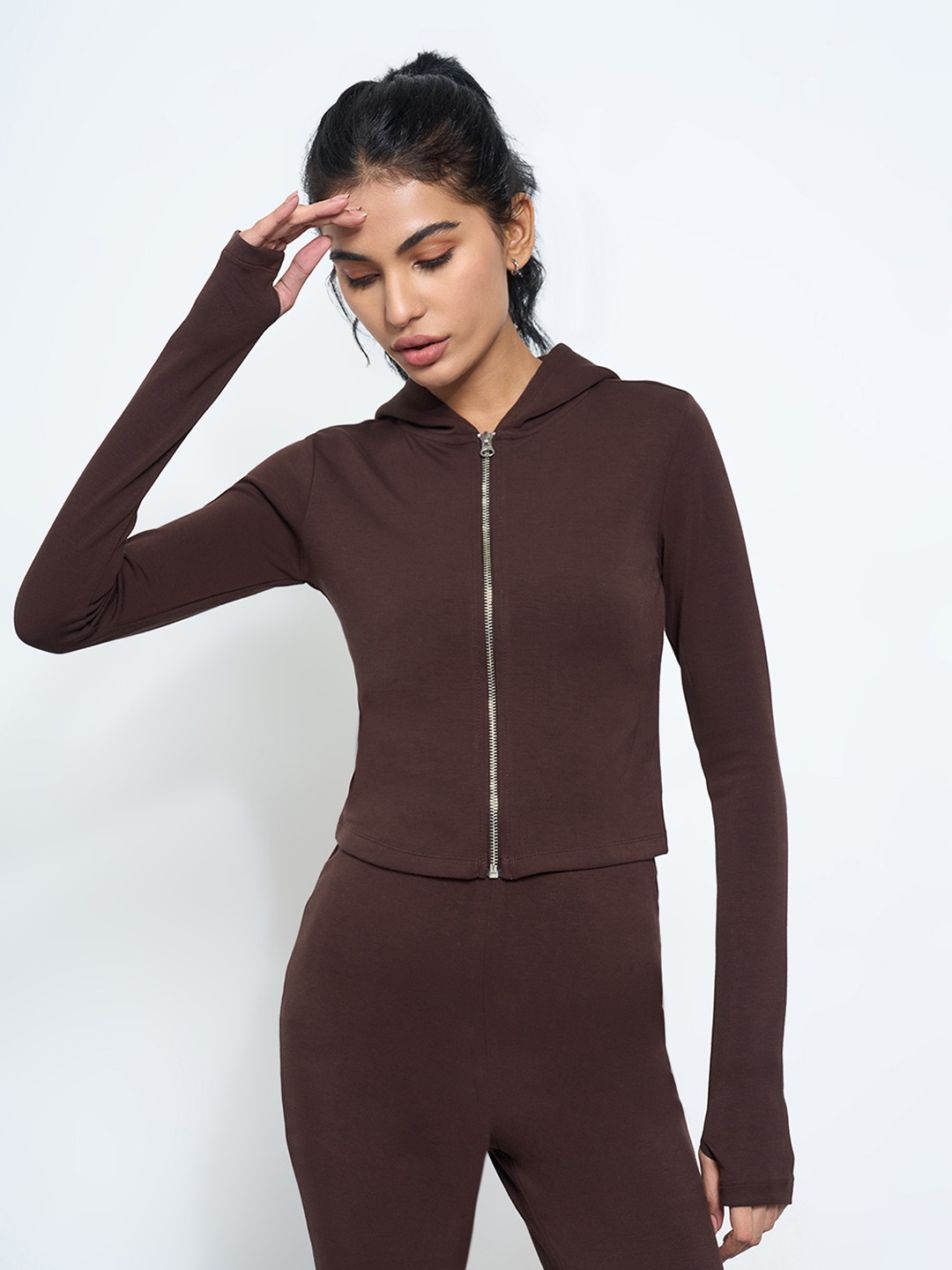 A streamlined take on everyday comfort with a sleek, fitted profile. This zip-up hoodie sweatshirt is crafted in a soft stretch knit that ensures ease and flexibility. Designed with a cropped length, front zip closure and thumbhole sleeves for a sporty, modern edge.
