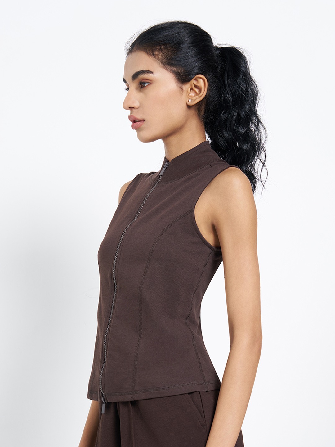 Sleek lines and a sculpted fit give this sleeveless top a sharp, performance-led edge. Designed with a high collar and full-length zip fastening, it features contoured seam detailing that enhances the streamlined silhouette. The stretch knit construction offers flexibility and comfort while maintaining a clean, structured profile.