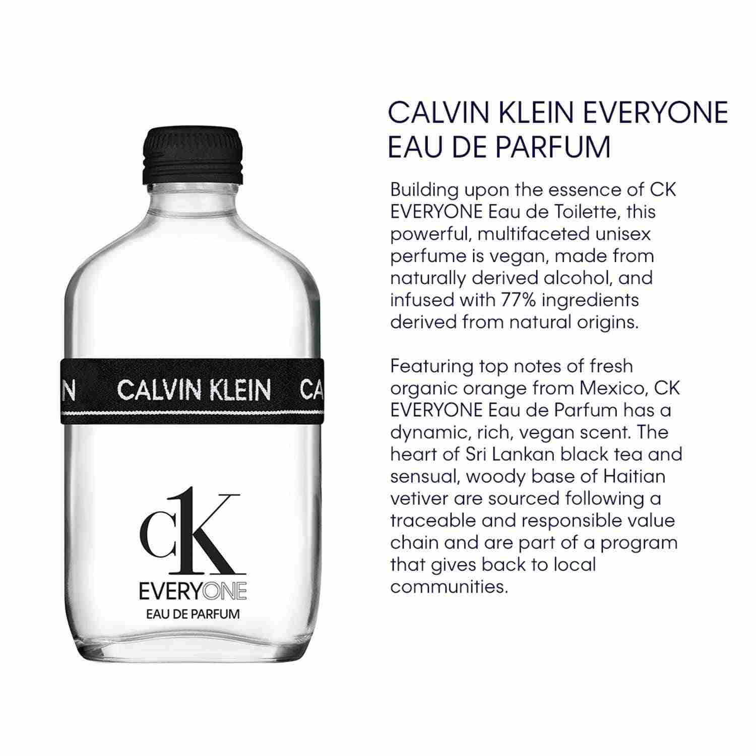 Cast a lasting impression everywhere you go with the Calvin Klein Everyone Eau De Parfum (100ml). This refreshing unisex perfume is infused with a harmonious blend of vibrant orange, soothing black tea, and the warm notes of haitian vetiver for a tantalizing citrusy fragrance that is ideal for both men and women. Also, this Calvin Klein EDP is a vegan perfume with a long-lasting formula that ensures hours of freshness to keep your body odor-free.
