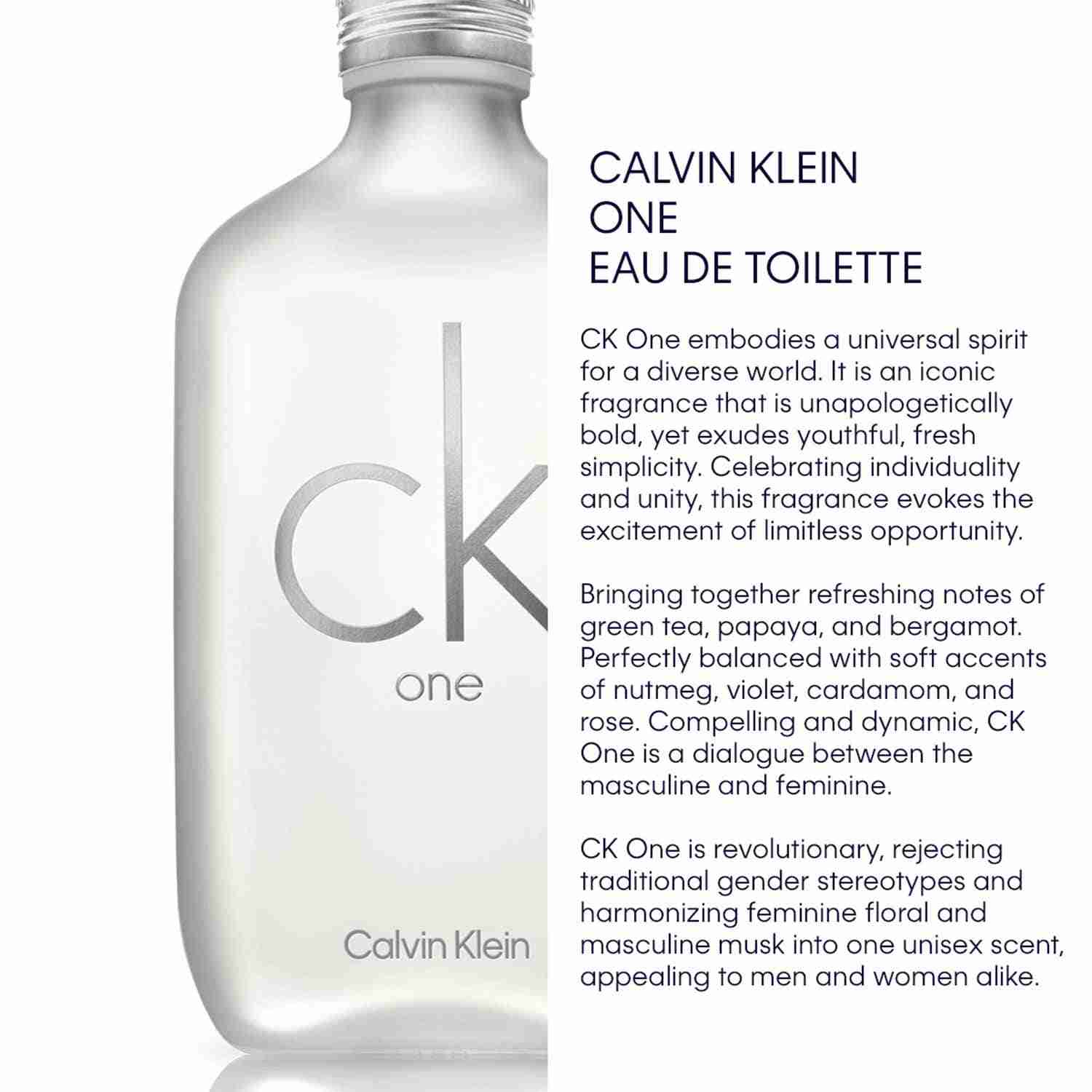 Add fragrance to your surrounding with the Calvin Klein One Eau De Toilette - (100ml). It is an iconic fragrance for modern times. Bold and clean, yet down-to-earth and universal. This Calvin Klein perfume offers a refreshing green tea fragrance with rose and violet, culminating in a finish of musk and amber.