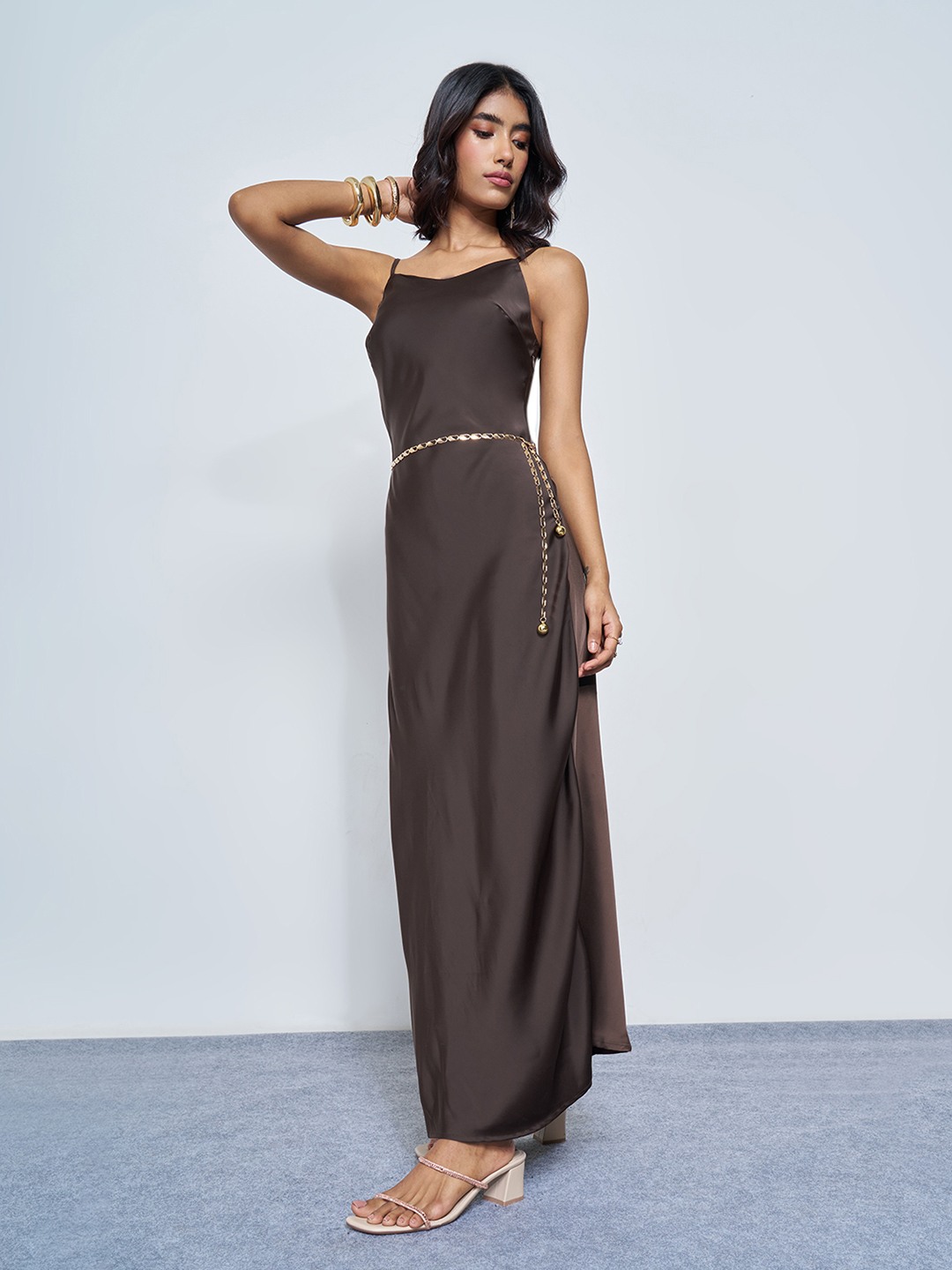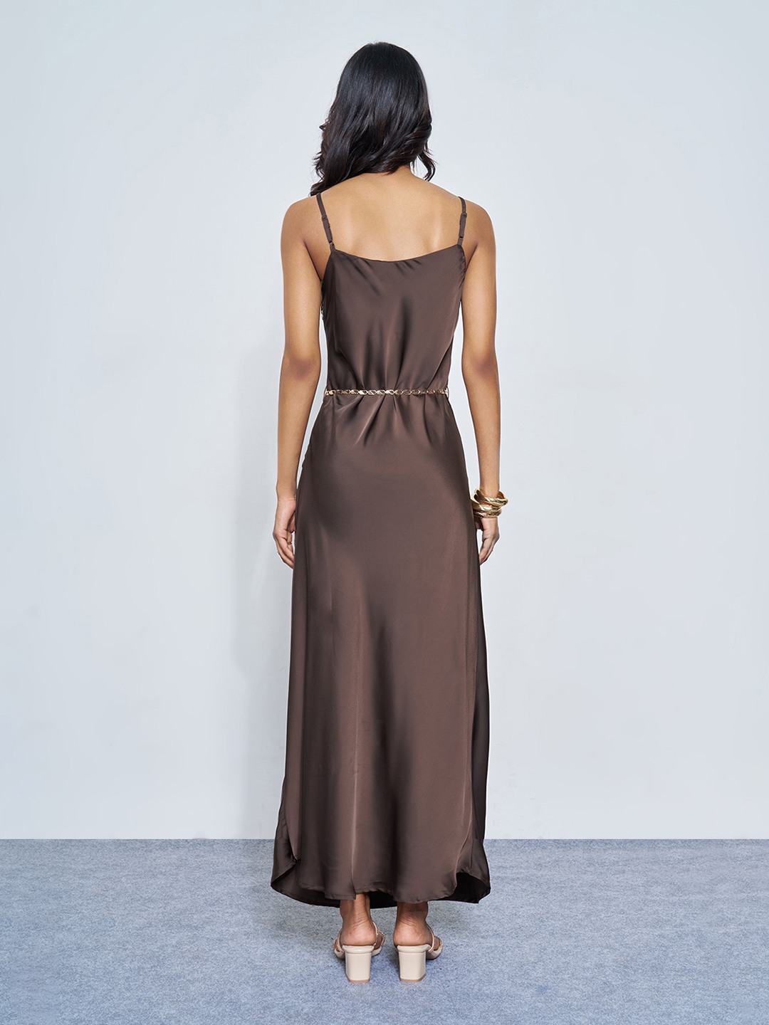 Sleek and sensual, this dress flows with a satin sheen that catches the light beautifully. Featuring slender shoulder straps, a fluid flattering silhouette, and a delicate chain belt accentuating the waist, it exudes effortless evening glamour. The smooth drape and minimal finish lend a timeless, elegant appeal.