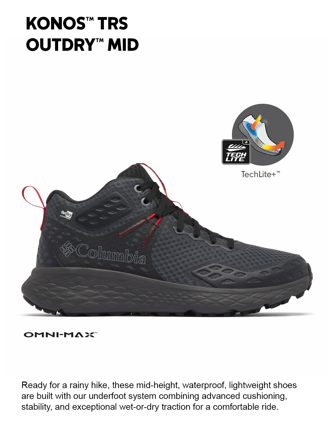 Omni-MAX™ delivers nonstop underfoot energy by combining adaptive cushioning, enhanced stability, and increased traction for fusion performance on variable terrain Technical mesh upper with no-sew overlays for added durability and support OutDry™ blocks moisture with an impenetrable waterproof-breathable membrane bonded to an outer shell so your feet stay dry and comfortable in the rain Pull loop on back for easier on and off Mid-height cut for support around your ankles Navic Fit™ System delivers comfort and stability with a unique lace-webbing system that keeps your heel in place for a more secure fit while running or hiking TechLite+™ midsole provides elevated cushioning, stability, and energy return with extra-light responsive foam, for long lasting comfort on any terrain Midsole cradles the heel for optimal balance while deflection domes in the forefoot and heel absorb impact to reduce stress on the foot Deep flex grooves in the forefoot enhance motion for a more efficient stride Adapt Trax™ outsole provides exceptional wet-or-dry traction using a unique compound and hike-specific tread pattern to keep you stable on any terrain Uses: Hiking Imported