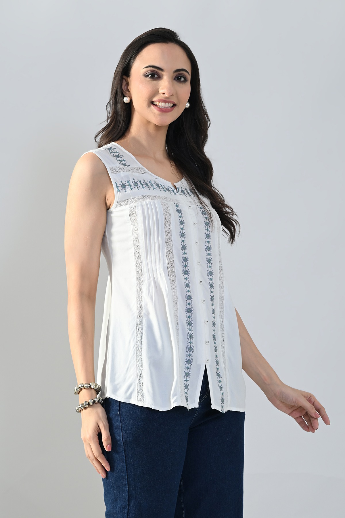 This Cream Embroidered Flared Top Features A Round Neck, Sleeveless, And A Straight Hemline. Its Chic And Contemporary Design Makes It Perfect For Both Casual And Semi-Formal Occasions.