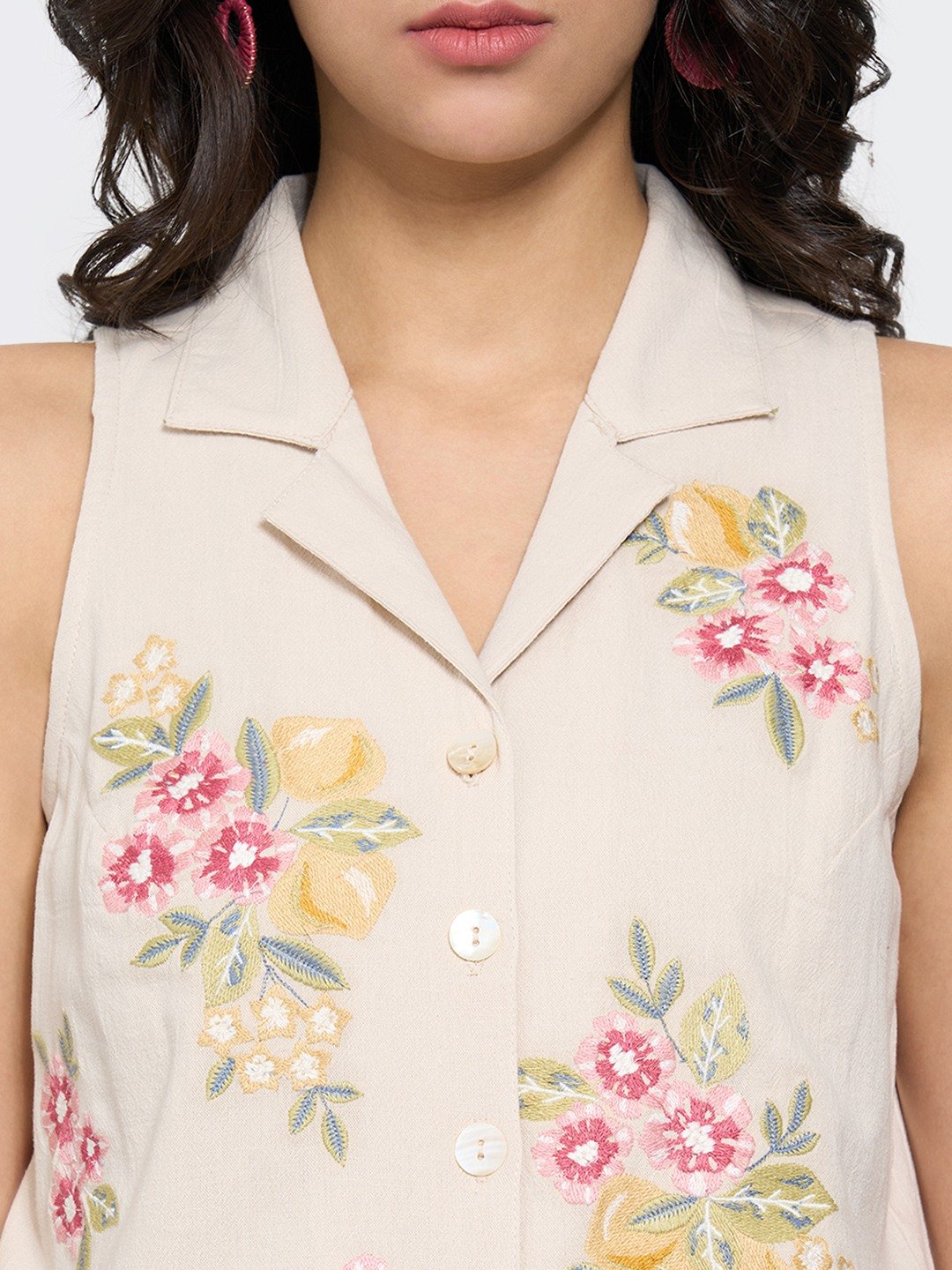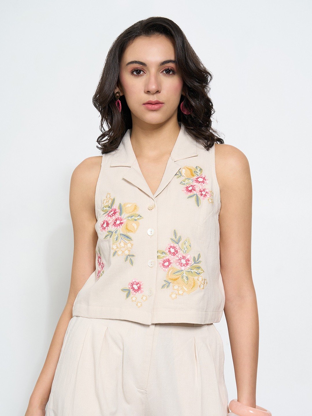 Light, feminine, and full of charm, this sleeveless top brings a refreshing twist to casual elegance. Detailed with floral embroidery in fresh hues, it features a notched collar, front button placket, and a cropped hem for a breezy finish. The textured woven fabric gives it a soft yet structured appeal.